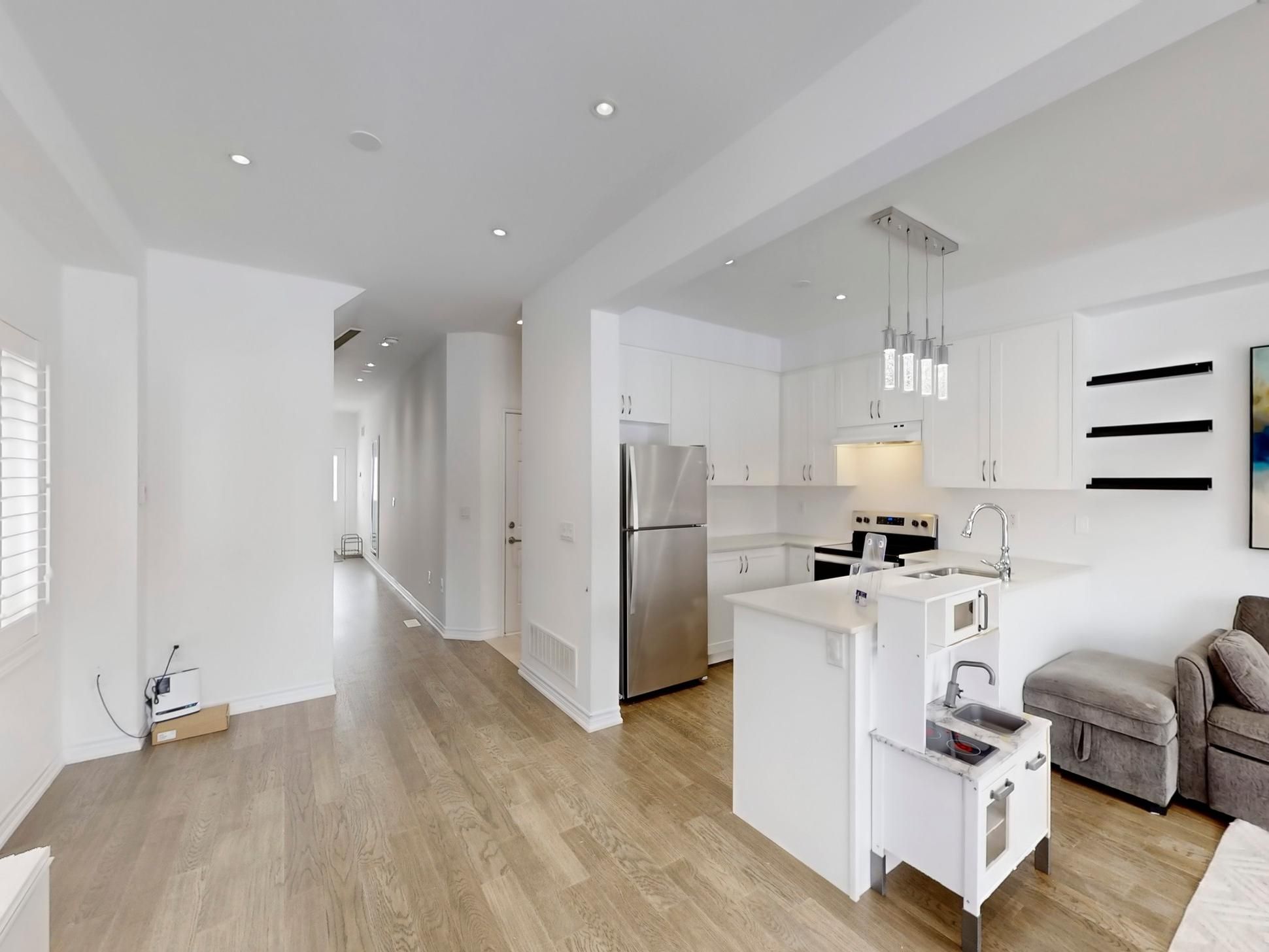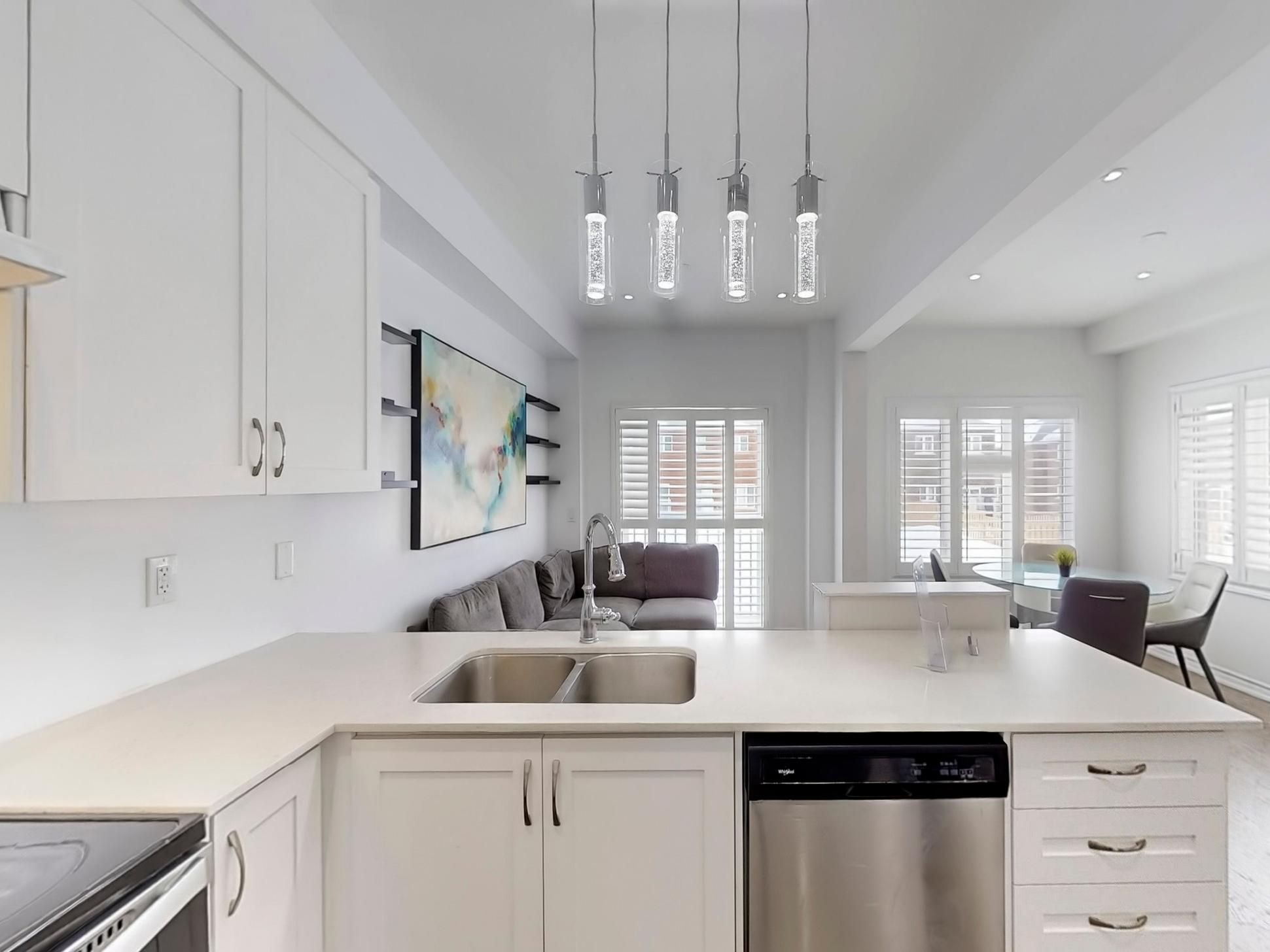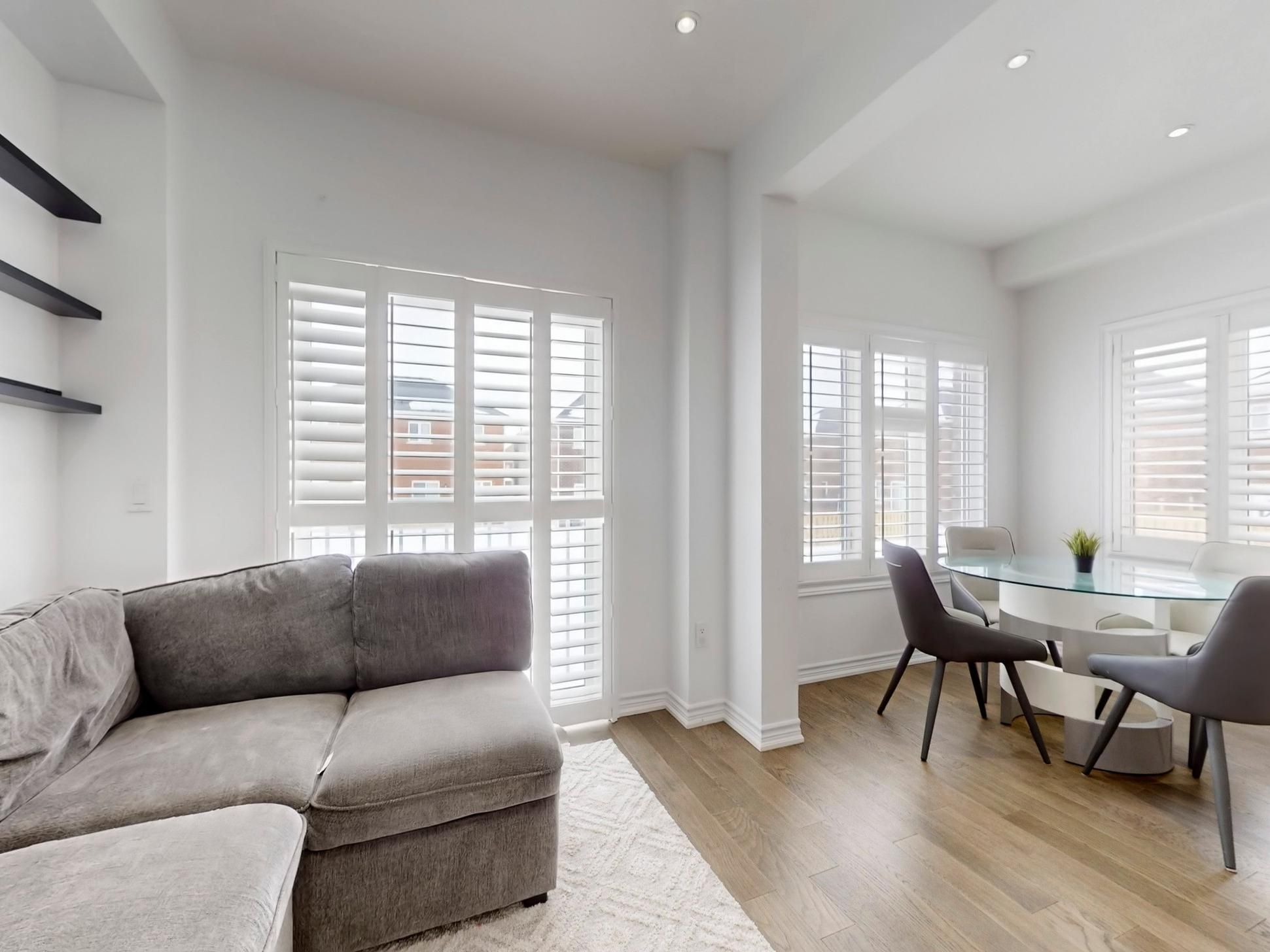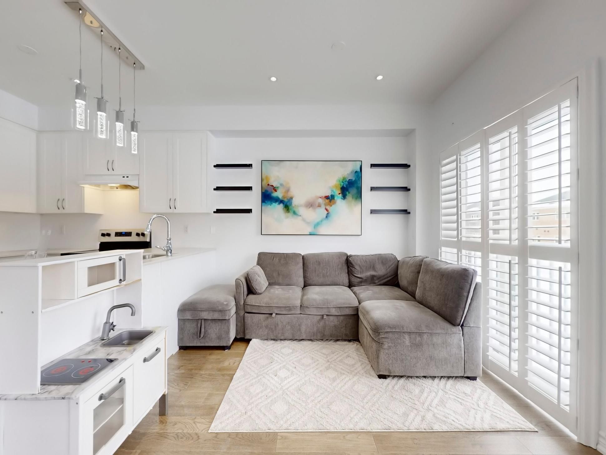 Recent updates include a new kitchen countertop, contemporary light fixtures with added pot lights, and sleek California shutters, enhancing both style and functionality.