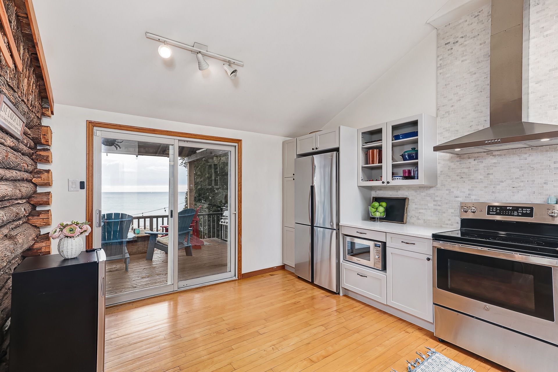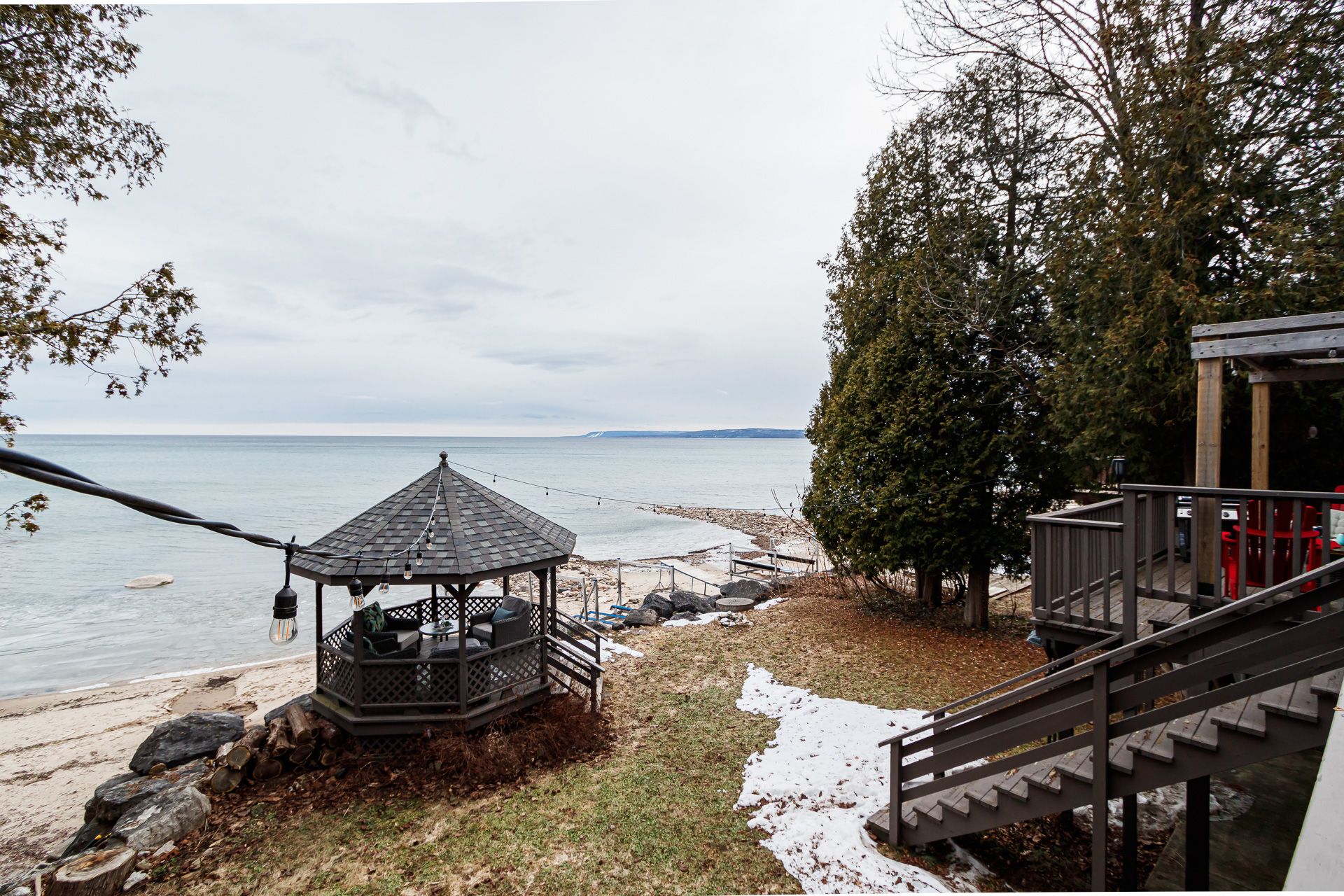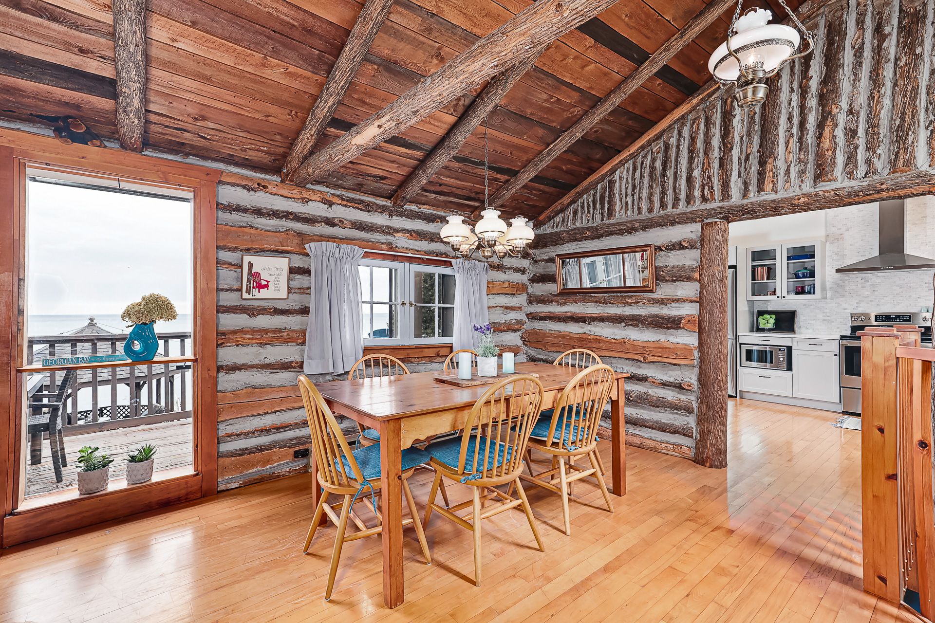 Adorable waterfront cottage on prestigious Cedar Avenue, offering breathtaking views of Georgian Bay and the Niagara Escarpment from Collingwood to Meaford and beyond. Built in 1985, this charming four-season retreat captures the feel of a classic Canadiana cottage while offering the comfort and convenience of year-round living. Spend your summer days on your private sandy beach, with crystal-clear water at your doorstep. Fish for rainbow trout from your dock, or enjoy peaceful evenings paddleboarding or kayaking along the shoreline, gazing down at striking underwater boulder formations. A short boat ride takes you to the harbours of Meaford or Thornbury for lunch, coffee, or ice cream. Inside, the home exudes warmth and character, centred around the original natural log great room featuring a historic signature dating back to 1925. Cathedral ceilings, maple flooring, a stone wood-burning fireplace, and skylights create a bright yet cozy, inviting space. The home is thoughtfully designed with two distinct yet connected living areas. The wing offers an upper bedroom off the main foyer, with a staircase leading to a charming lower bedroom and 2-piece bath-ideal for guests or family. The beautifully updated kitchen opens to a wraparound deck overlooking the Bay, perfect for entertaining or simply taking in the view. The lower level includes a spacious primary bedroom, full bathroom, and a comfortable family room with a wood stove and walkout to the terrace, gazebo, and waterfront-seamlessly blending indoor and outdoor living. Finished with a timeless board-and-batten exterior, the property is surrounded by perennial gardens and includes two storage sheds. A truly special waterfront getaway-where classic cottage charm meets four-season comfort. This property is not to be missed!