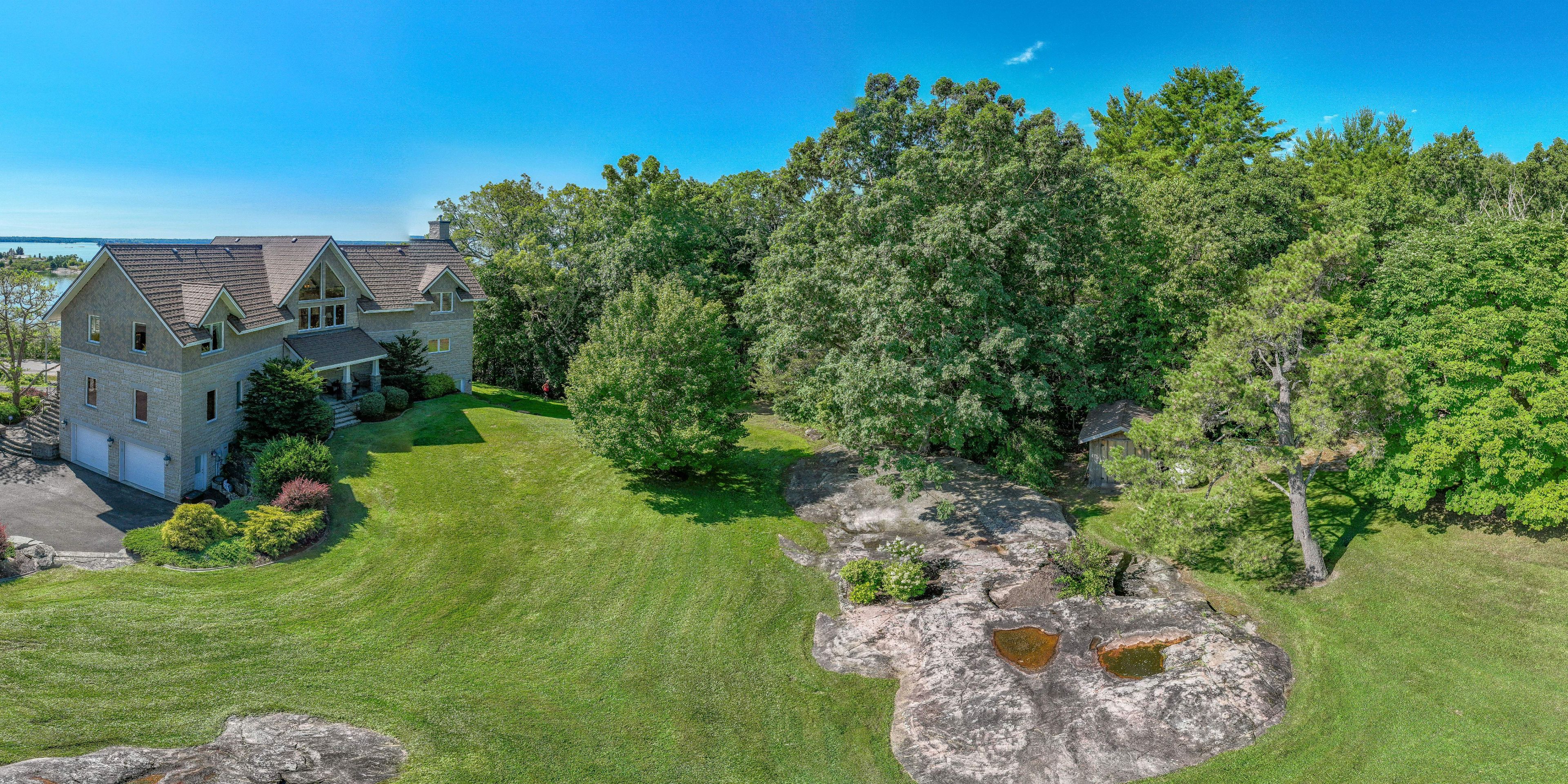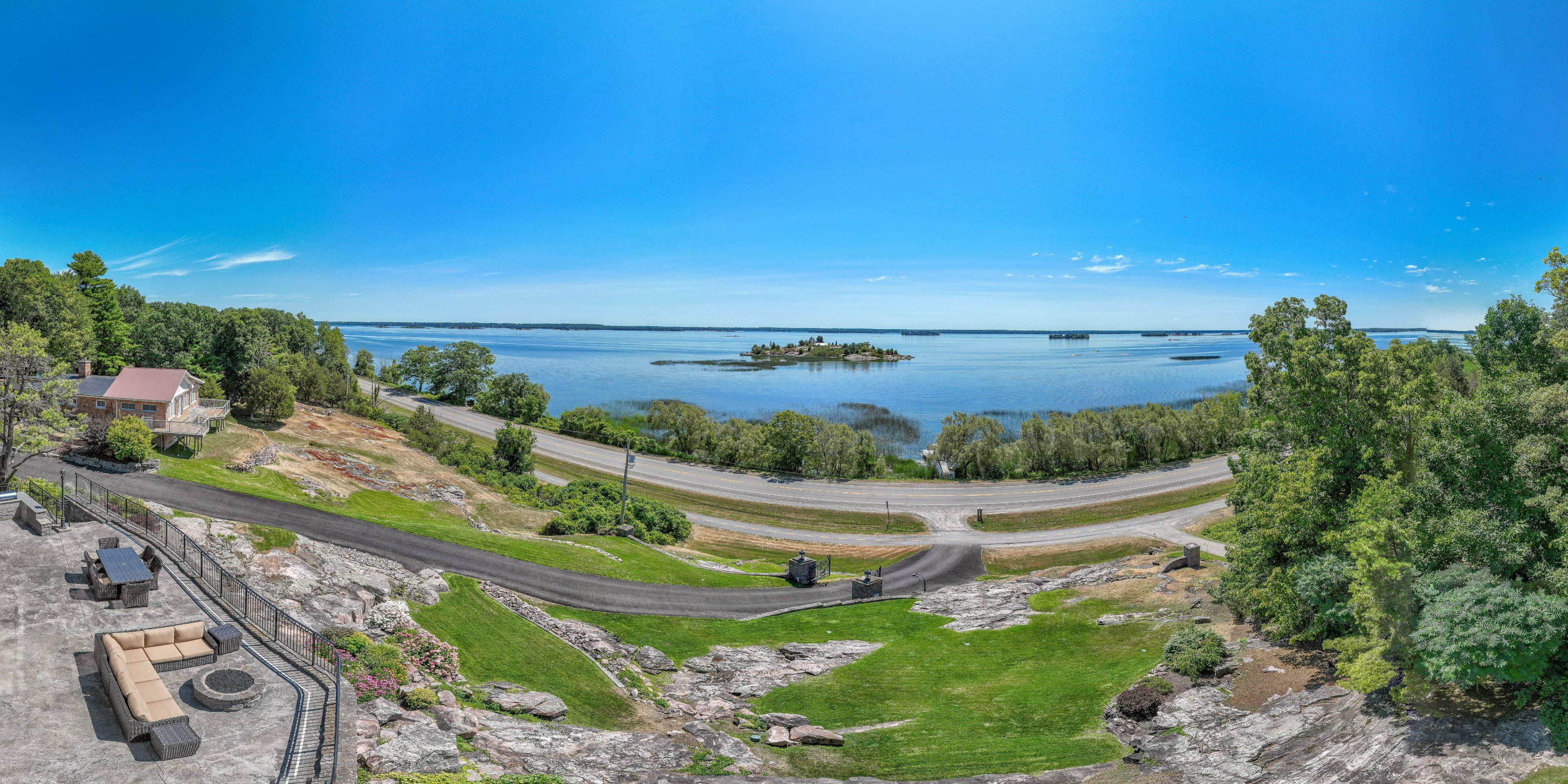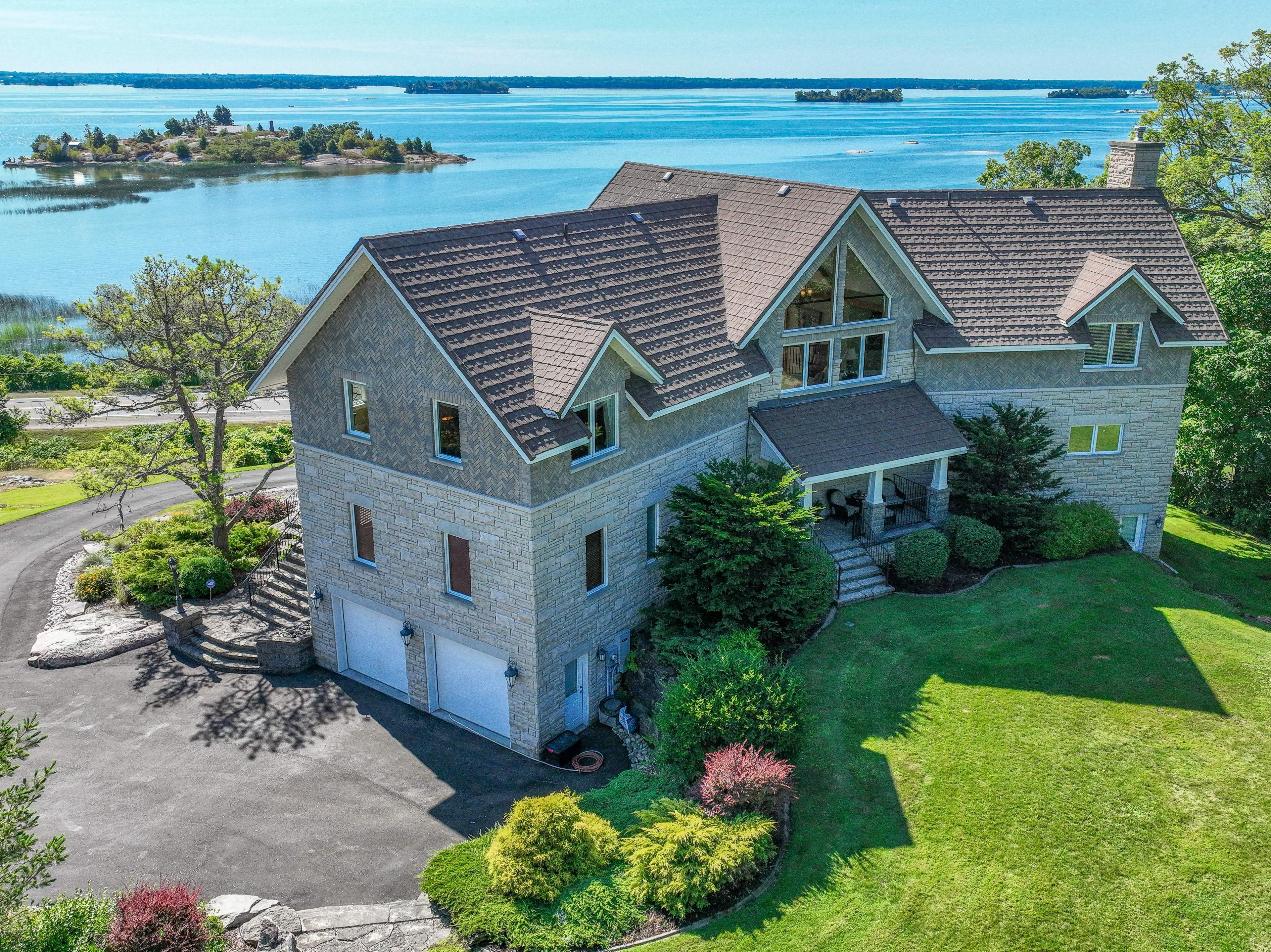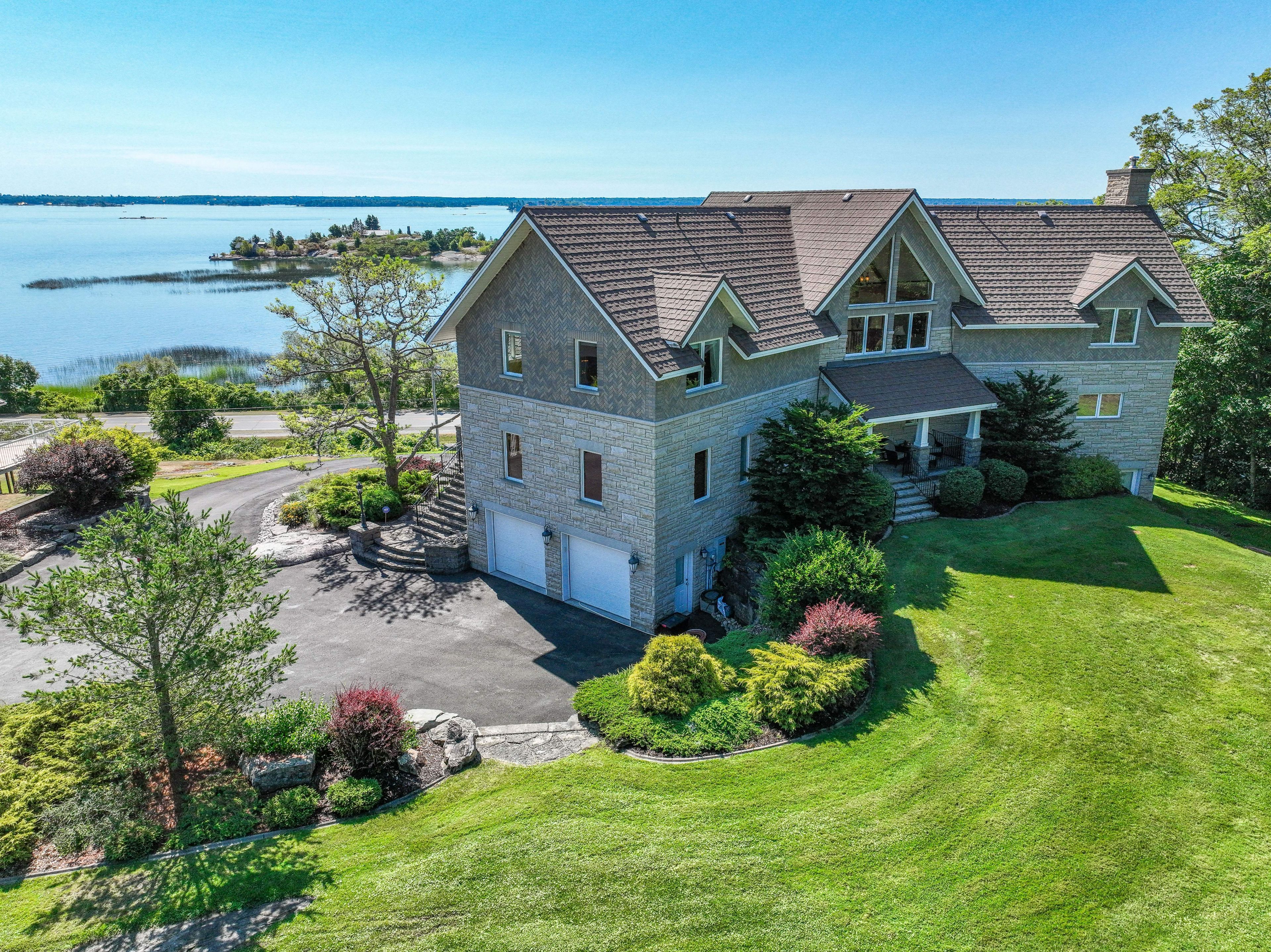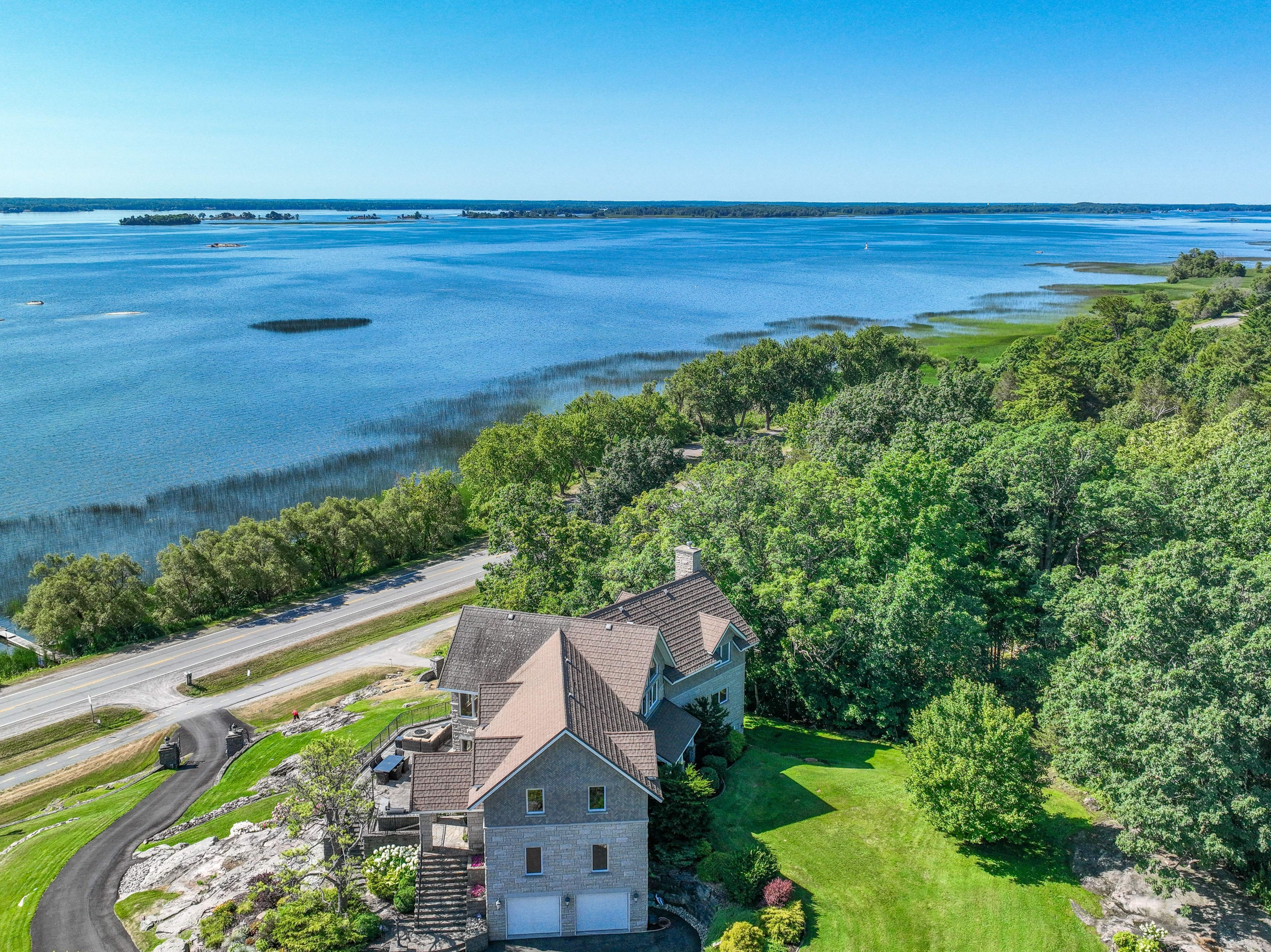 Perched high above the St. Lawrence River in the heart of the world-renowned 1000 Islands, this exceptional custom-built estate offers breathtaking panoramic views stretching to the iconic Singer Castle. A rare combination of timeless design, elevated privacy, and refined outdoor living, this is waterfront living at its finest. Spanning approximately 6,000 sq. ft., the home is designed to maximize light and scenery, with expansive floor-to-ceiling windows framing the ever-changing river views. Inside, rich Brazilian cherry hardwood and marble flooring, along with handcrafted Hubbardton Forge lighting, create a warm yet sophisticated atmosphere. Floor to ceiling stone fireplace with air tight wood insert, perfect for both relaxing and entertaining. The gourmet kitchen features custom cherry cabinetry, a Wolf gas stove, and two Dacor ovens, family room with custom built-ins and stunning water views. The principal suite offers a private retreat with a spa-inspired ensuite and picturesque outlook, while two additional bedrooms each include their own ensuite for added comfort and privacy. The walk-out lower level, complete with 10-foot ceilings and in-floor heating, provides exceptional additional living space with a rec room, wet bar, office, and exercise area. Outdoors, professionally landscaped grounds showcase extensive stonework, stamped concrete, and maintenance-free decking. Multiple entertaining areas, including a built-in BBQ and smoker, create the perfect setting to enjoy the riverfront backdrop. A wrought iron gated entrance and fencing add both elegance and security, with additional access from Old River Road. Additional features include a steel roof, two central air units, and direct access to 37 km of paved walking and cycling trails leading to Gananoque. A truly rare offering in one of Canada's most iconic waterfront settings - this is more than a home, it's a landmark 1000 Islands estate.
