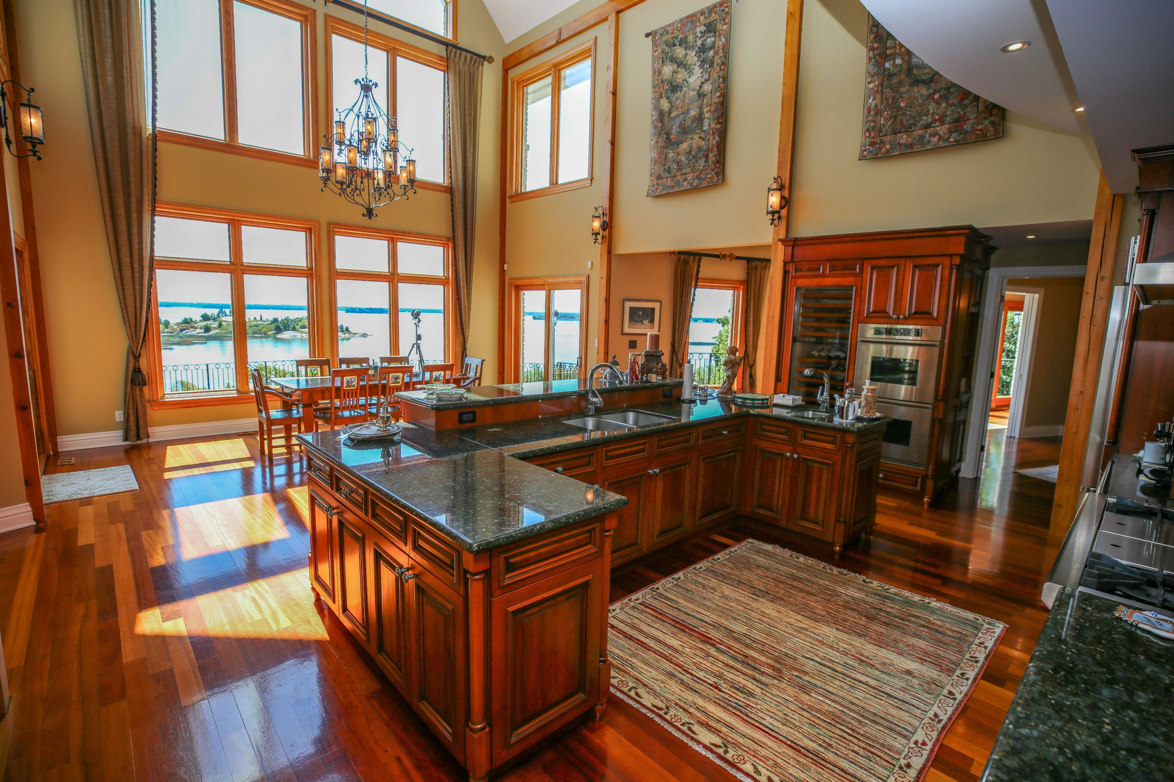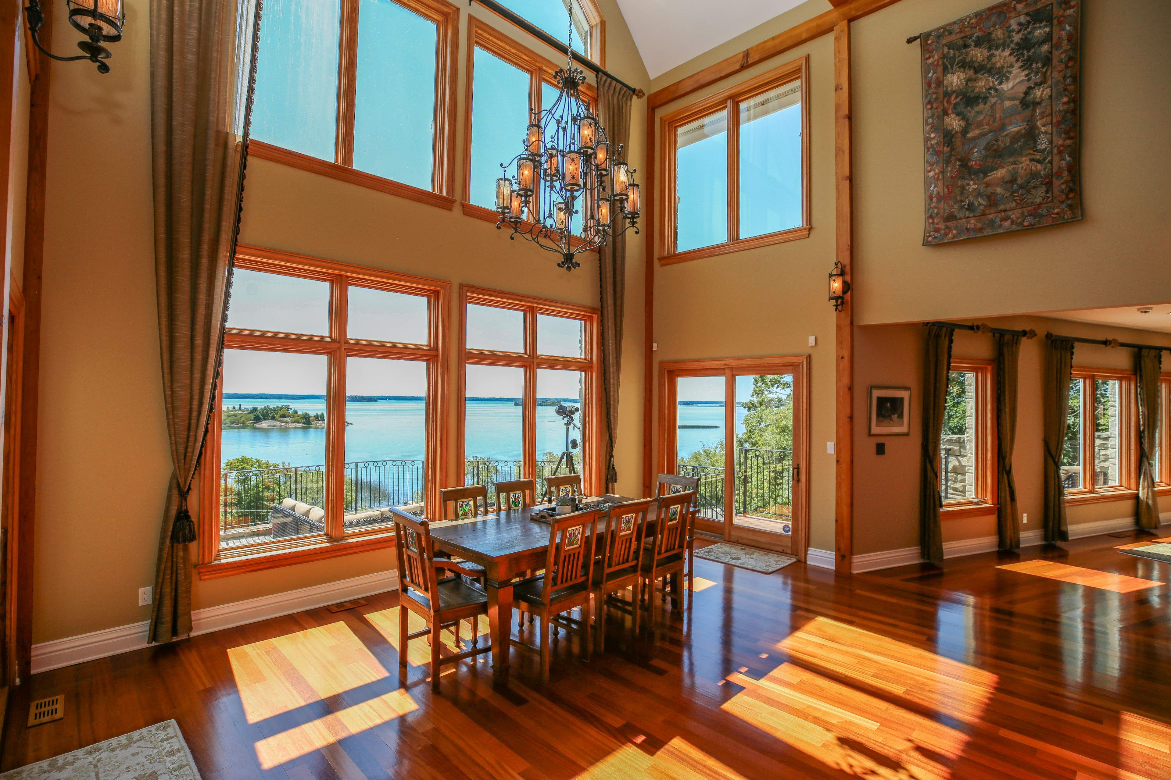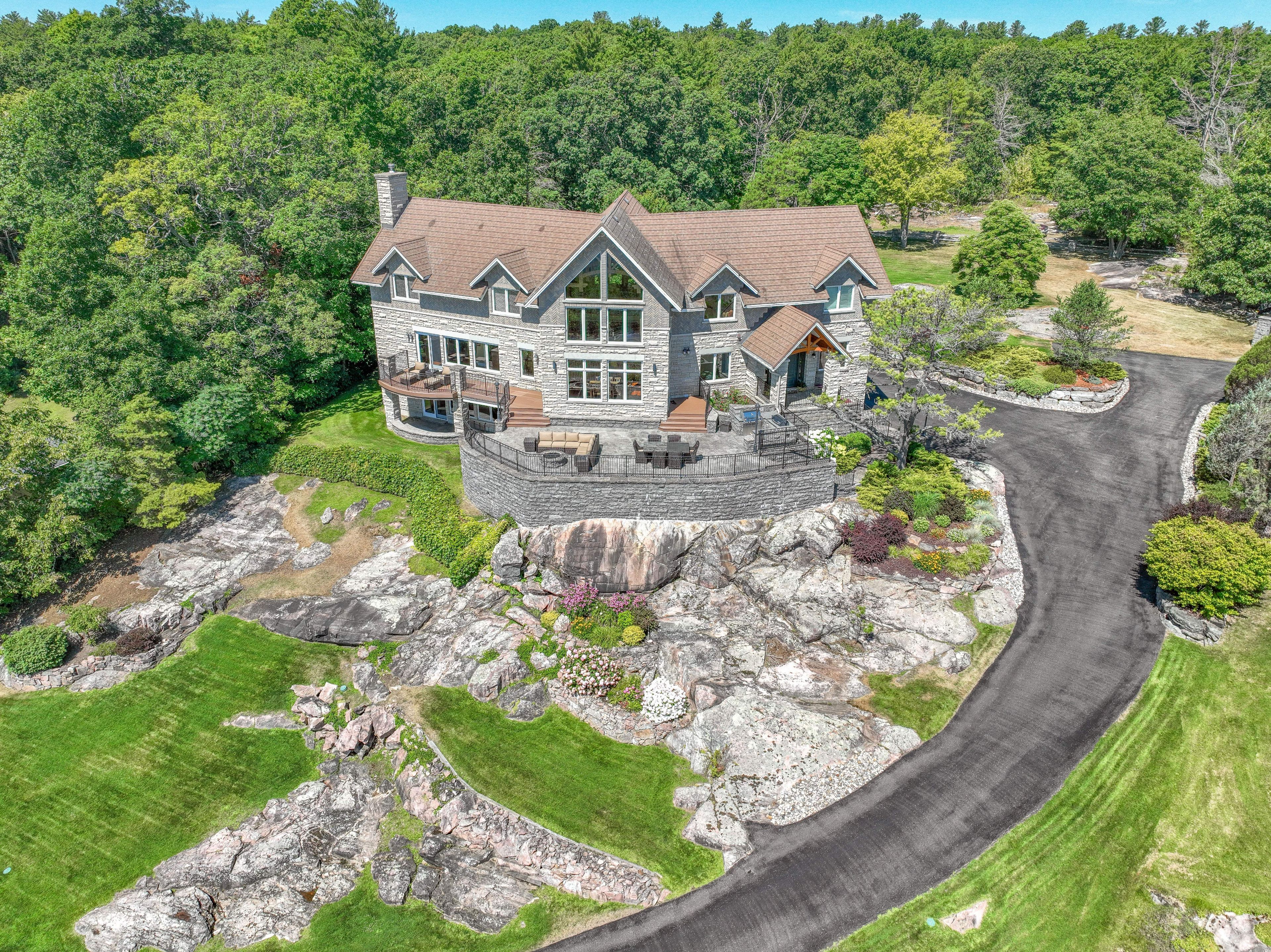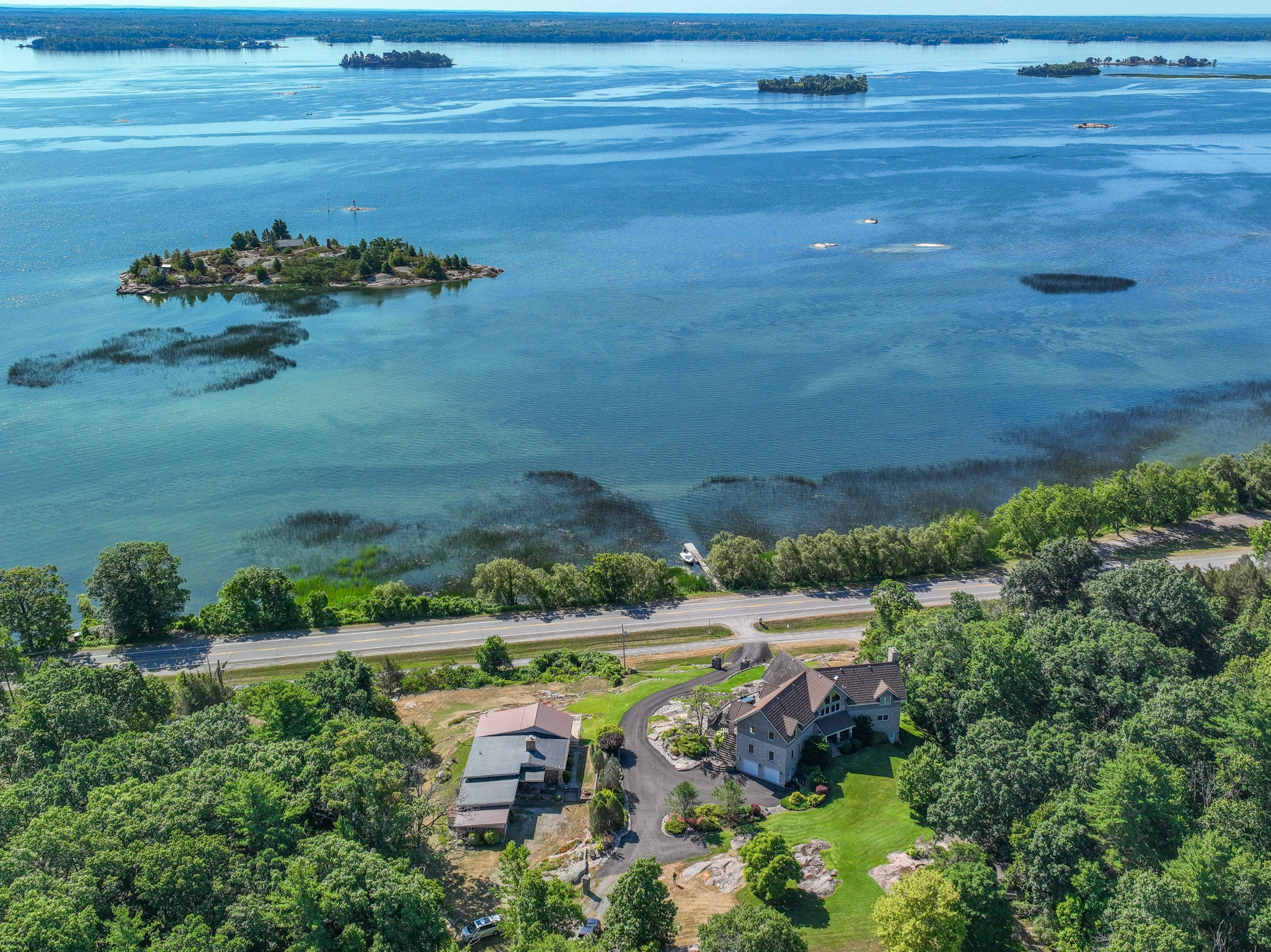 Perched high above the St. Lawrence River in the heart of the world-renowned 1000 Islands, this exceptional custom-built estate offers breathtaking panoramic views stretching to the iconic Singer Castle. A rare combination of timeless design, elevated privacy, and refined outdoor living, this is waterfront living at its finest. Spanning approximately 6,000 sq. ft., the home is designed to maximize light and scenery, with expansive floor-to-ceiling windows framing the ever-changing river views. Inside, rich Brazilian cherry hardwood and marble flooring, along with handcrafted Hubbardton Forge lighting, create a warm yet sophisticated atmosphere. Floor to ceiling stone fireplace with air tight wood insert, perfect for both relaxing and entertaining. The gourmet kitchen features custom cherry cabinetry, a Wolf gas stove, and two Dacor ovens, family room with custom built-ins and stunning water views. The principal suite offers a private retreat with a spa-inspired ensuite and picturesque outlook, while two additional bedrooms each include their own ensuite for added comfort and privacy. The walk-out lower level, complete with 10-foot ceilings and in-floor heating, provides exceptional additional living space with a rec room, wet bar, office, and exercise area. Outdoors, professionally landscaped grounds showcase extensive stonework, stamped concrete, and maintenance-free decking. Multiple entertaining areas, including a built-in BBQ and smoker, create the perfect setting to enjoy the riverfront backdrop. A wrought iron gated entrance and fencing add both elegance and security, with additional access from Old River Road. Additional features include a steel roof, two central air units, and direct access to 37 km of paved walking and cycling trails leading to Gananoque. A truly rare offering in one of Canada's most iconic waterfront settings - this is more than a home, it's a landmark 1000 Islands estate.
