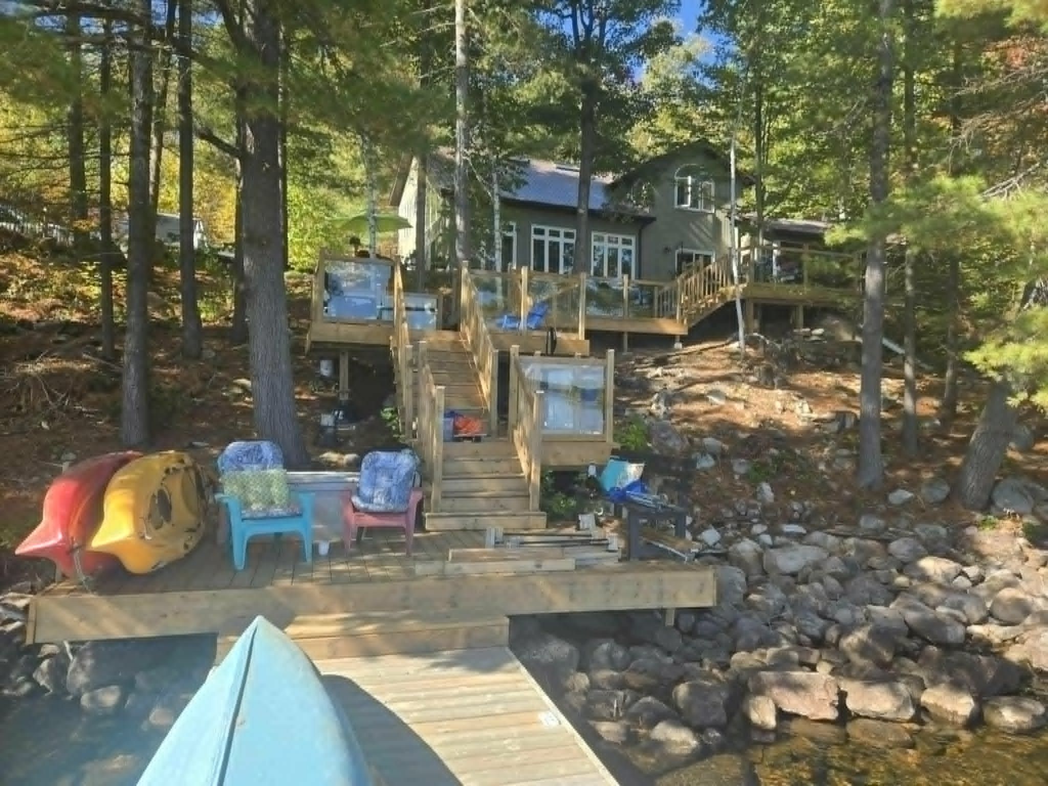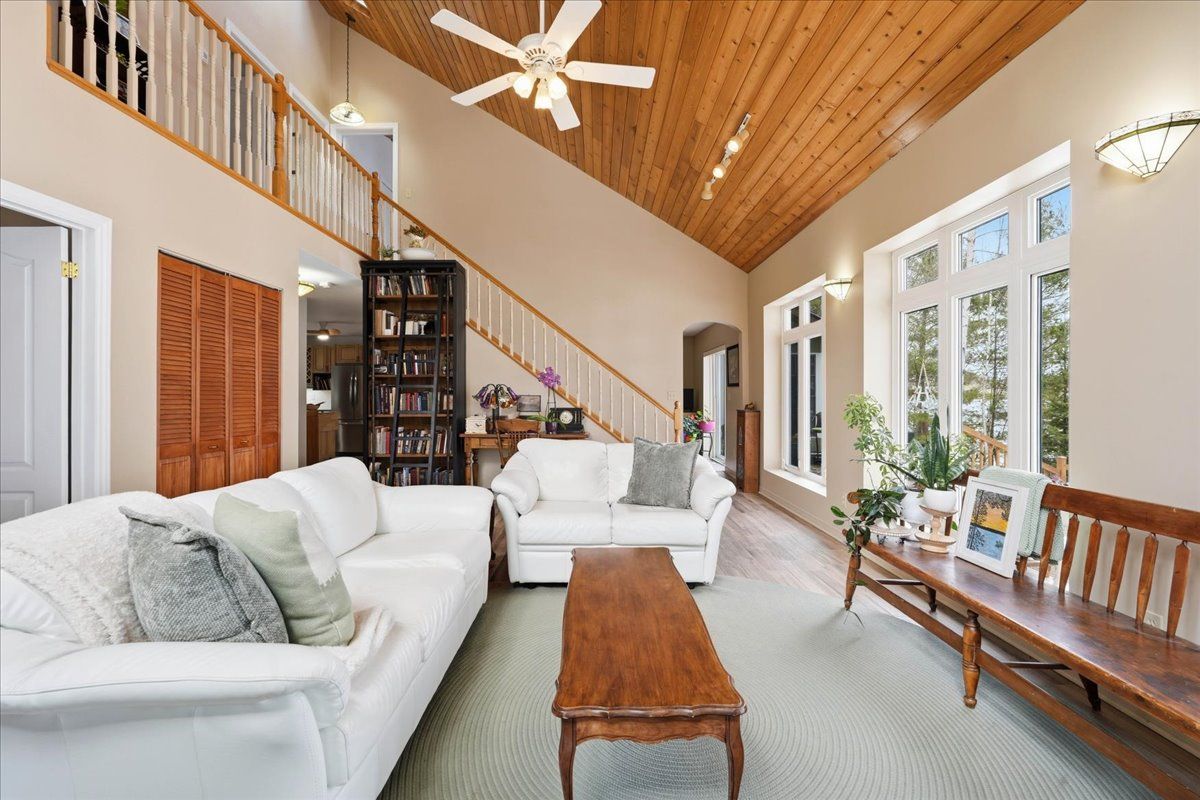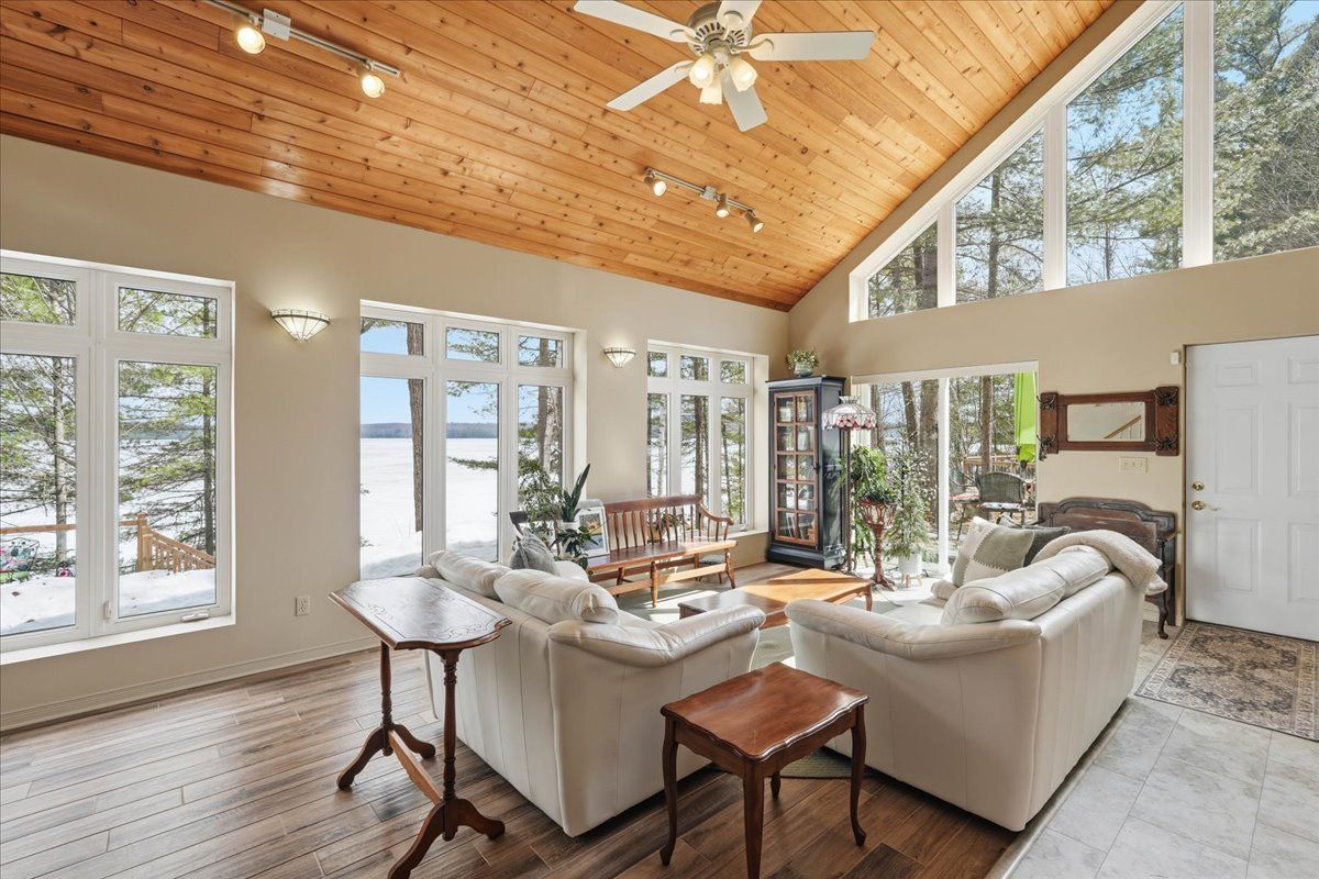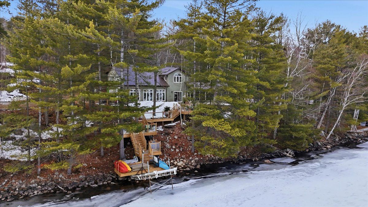 Set on one of Ontario's most iconic lakes - Mazinaw Lake, this year-round home offers a front row seat to one of the region's most unforgettable views, Bon Echo Rock rising across the lake. Tucked into a quiet, tree-lined setting on a municipally maintained road, the property strikes a rare balance of privacy, natural beauty, and easy access in every season. Built with lasting quality in mind, the home features ICF construction and in-floor radiant heating, creating a comfortable and energy-conscious lifestyle. The main level is designed for both everyday living and entertaining, with spacious principal rooms, a well-appointed kitchen with quartz countertops, and a dedicated dining area. A cedar-lined sunroom extends the living space and offers a relaxed place to unwind while taking in the surrounding landscape. Upstairs, the primary suite includes a walk-in closet and private ensuite, alongside two additional bedrooms and a full bath. The layout offers flexibility for families or guests, with additional space on the main floor that could serve as a home office or optional bedroom. The waterfront is equally impressive, with a clean shoreline, hard sand entry, and deep water off the dock, ideal for swimming, boating, and fishing. Known for its clarity and natural beauty, Mazinaw Lake is home to Bon Echo Provincial Park, offering miles of shoreline to explore, scenic hiking trails, and two sandy beaches just steps away from this rare gem!