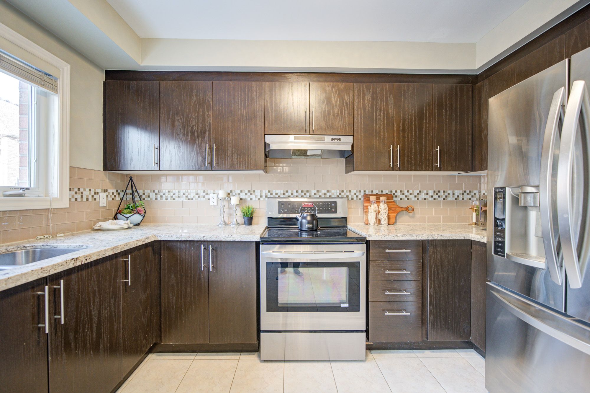 Well-maintained and move-in ready 3-bedroom townhome with three bathrooms, ideally located in a desirable neighbourhood. Bright and functional main floor with abundant natural light, a bathroom, and direct access from the one-car garage into the main level.The kitchen features granite countertops, ceramic backsplash, espresso cabinetry, upgraded faucets, and a breakfast area with walkout to backyard and deck.Recent upgrades include new modern light fixtures, updated bathrooms, and upgraded furnace and hot water tank, offering peace of mind and low ongoing maintenance. The second floor offers three well-sized bedrooms filled with natural light, including a primary bedroom with his-and-hers closets and semi-ensuite access. One bedroom features a private balcony.The professionally finished basement includes a versatile recreation area and an additional bathroom, providing flexible space for extended family, a home office, or rental use. Close to schools, parks, shopping, transit, and major commuter routes. A solid, rent-ready home with excellent value.