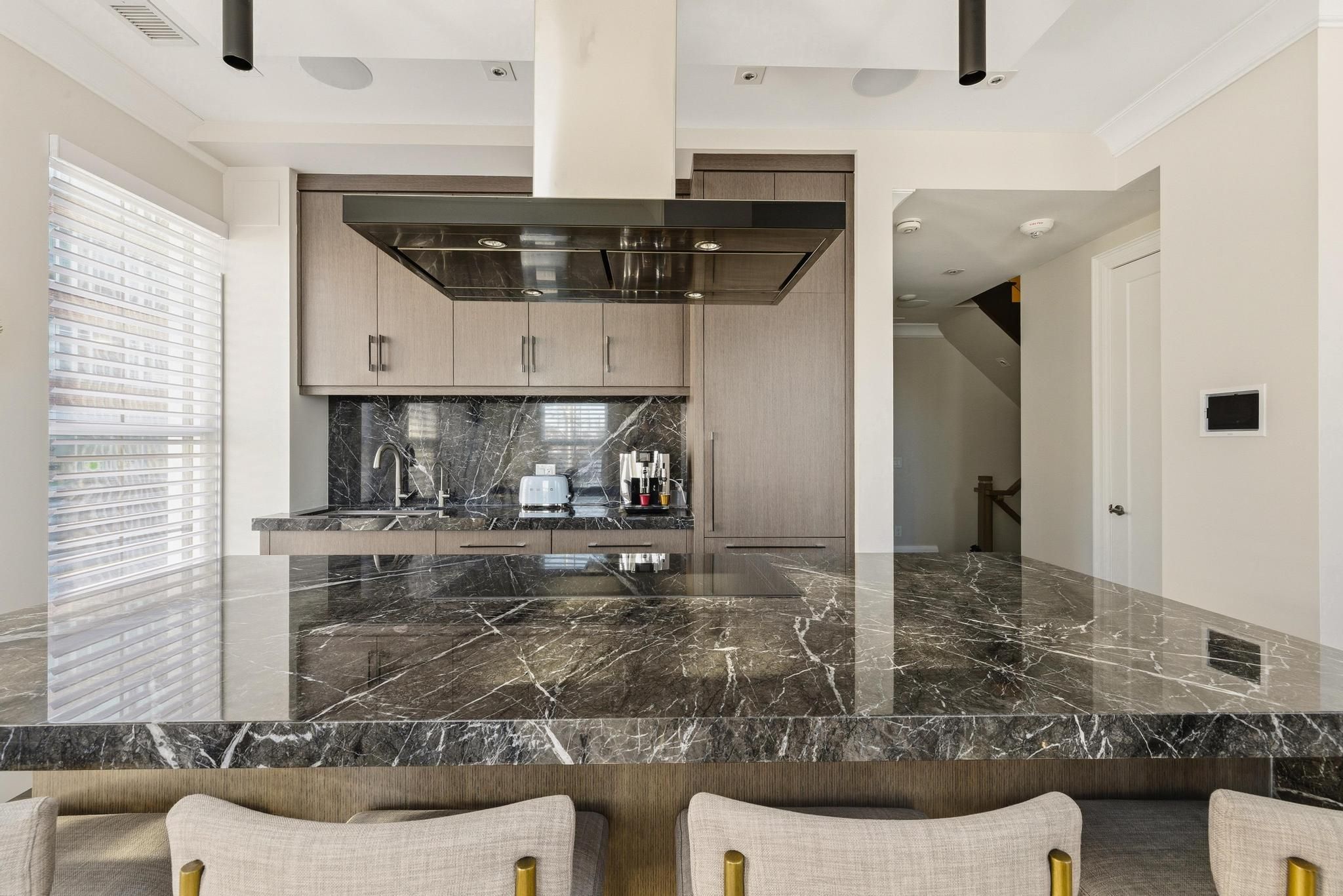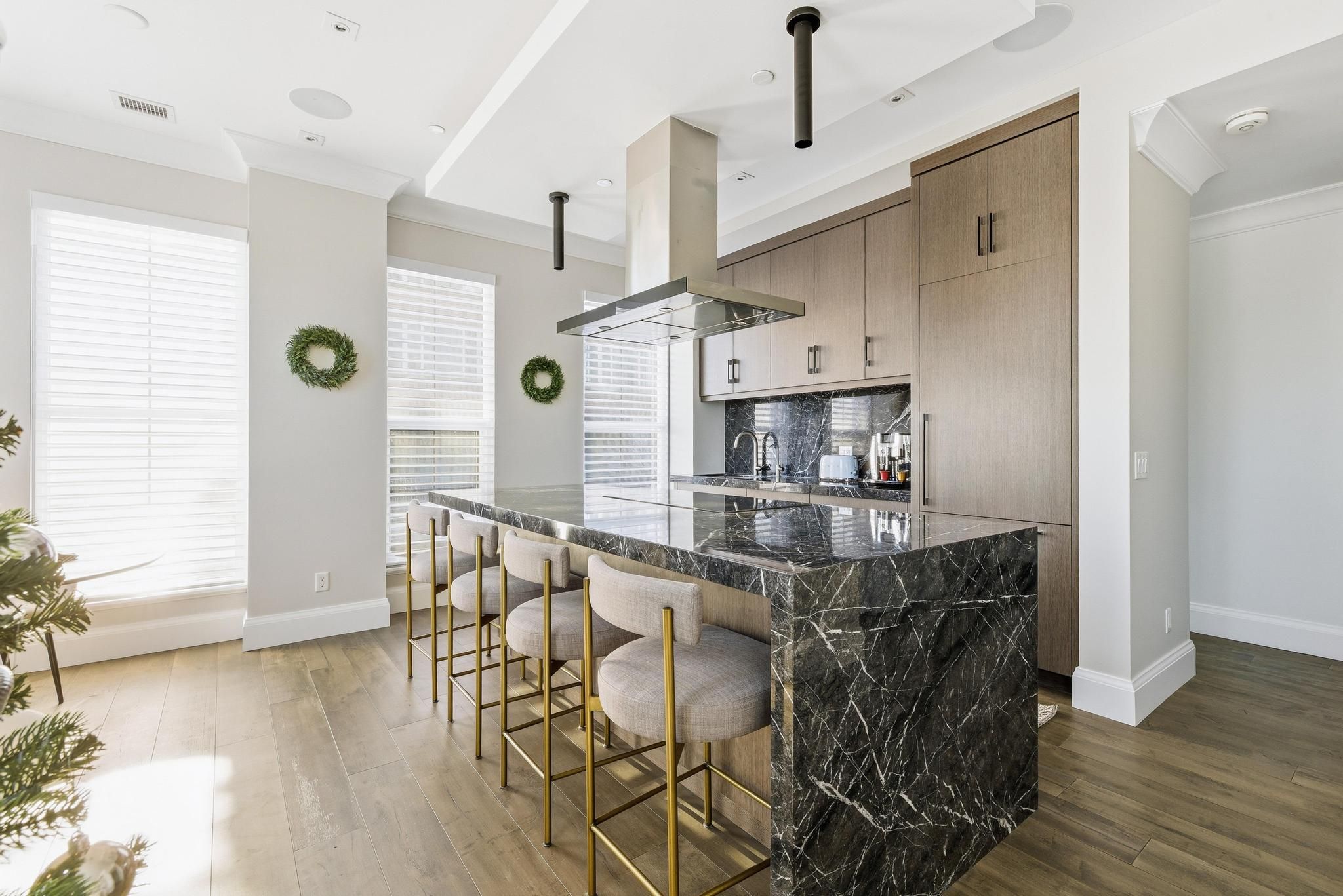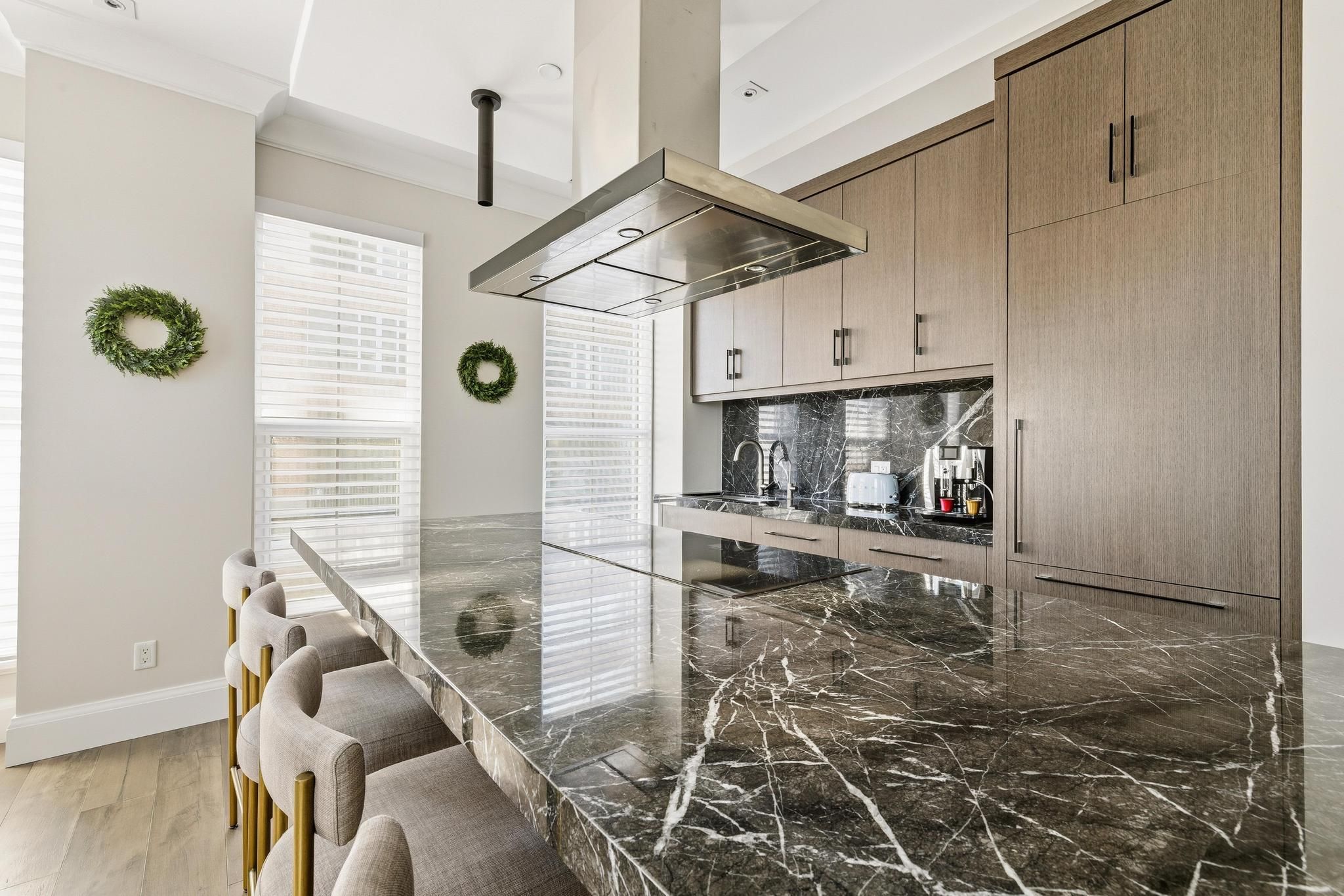 This one-of-a-kind executive three level townhome is an extraordinary offering in the heart of Uptown Waterloo, crafted for those who expect an elevated standard of living. Every detail has been curated with intention, delivering three bedrooms, five bathrooms, and a level of refinement that reflects true luxury. The gourmet kitchen stands as a statement piece, featuring premium Thermador appliances, a Wolf commercial rangehood, a sculptural marble waterfall island, and a full marble backsplash that together create an atmosphere of exceptional sophistication. Wide plank hardwood flooring, heated floors throughout all tiled areas and bathrooms, and expansive floor to ceiling windows shape the interior with warmth, natural light, and architectural elegance. The private top floor retreat offers a sanctuary of calm with a serene bedroom suite, spa inspired finishes, generous proportions, and an enhanced sense of privacy. Each additional bedroom is complete with its own ensuite, ensuring an uncompromised experience for family and guests. Everyday living is enriched by a private in suite elevator, in suite laundry, extensive storage, and a beautifully finished lower-level ideal for additional living, wellness, or an elevated work from home space. Residents enjoy exclusive access to exceptional amenities including full concierge service, a premium fitness centre, refined guest suites, a putting green, curated outdoor barbecue terraces, and an elegant party room designed for sophisticated gatherings. Three dedicated underground parking spaces and two storage lockers provide a rare level of convenience in an urban setting. Perfectly positioned in Uptown Waterloo, this residence offers immediate access to fine dining, boutique shopping, cafes, wellness studios, green spaces, live entertainment, transit, and the iconic Vincenzo's. A remarkable opportunity to experience luxury urban living where design, craftsmanship, and lifestyle converge at the highest level.