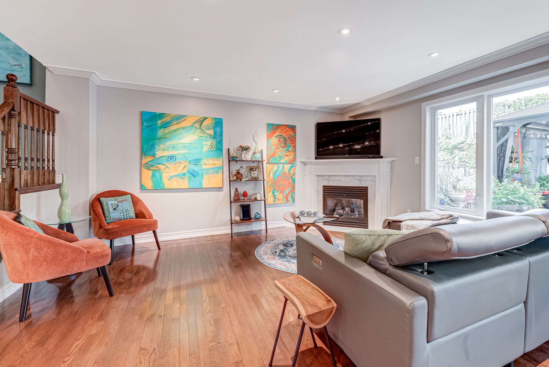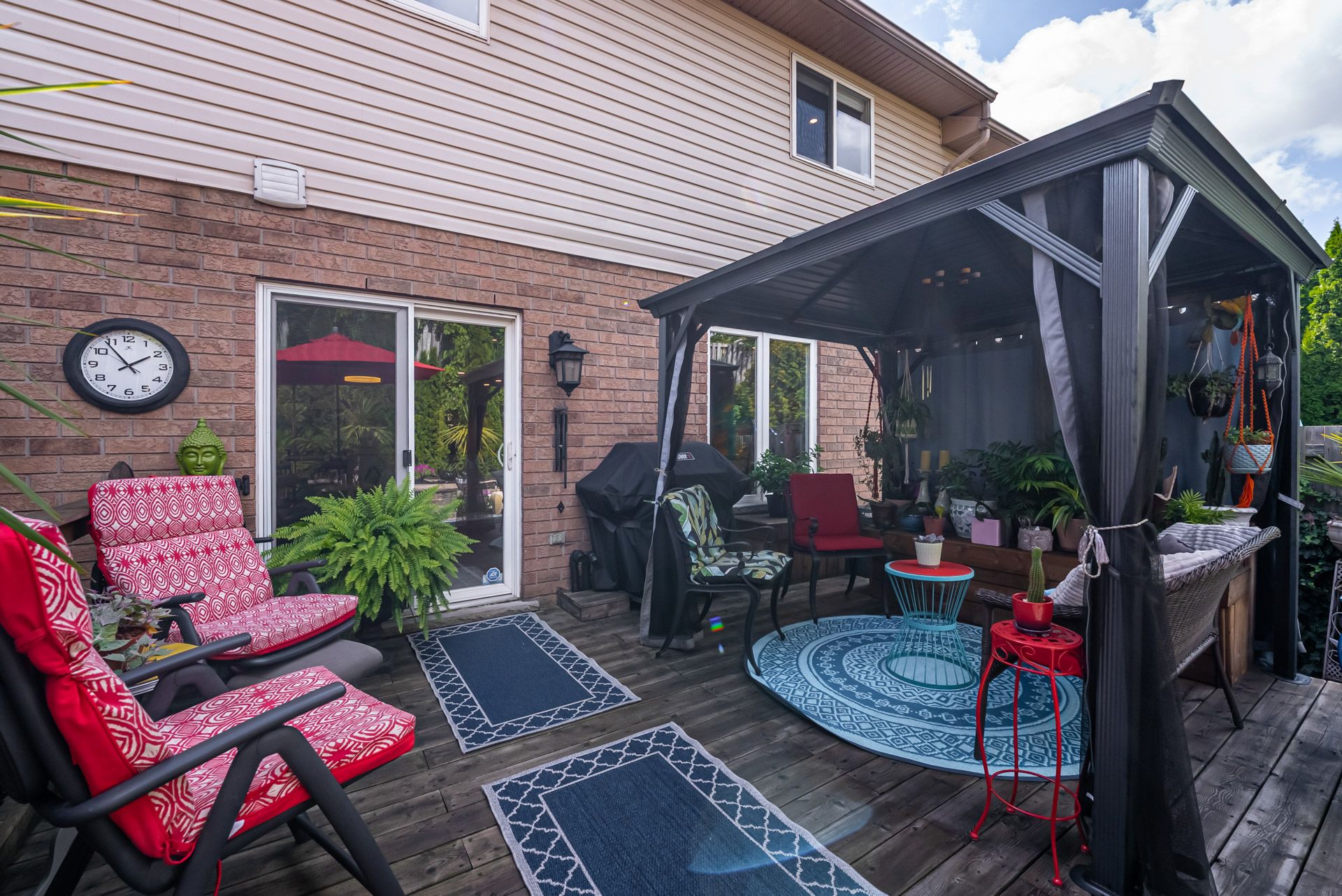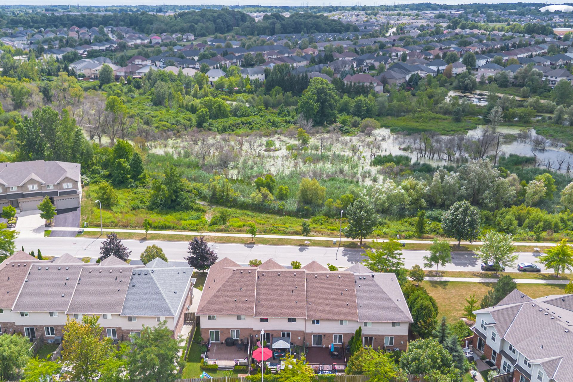 Gorgeous, professionally updated freehold townhome across from a Conservation Area with a number of paths and ponds for the enjoyment of nature lovers and dog enthusiasts. There is 1890 sq ft on the main and second floors, and almost 2700 sq ft of finished living space total. Inviting backyard with a deck, gazebo, 5-person hot tub, and lovely, mature greenery. Open concept main floor features hardwood flooring in the large living room with a gas fireplace, and in the dining room there are sliding doors to a deck. A stunning kitchen includes a gas stove, granite counter tops, a gorgeous tile backsplash and a breakfast/entertainment bar. The finished basement features luxury vinyl flooring, built-in custom wall-to-wall cupboards and drawers with bar fridge and a wet bar/refreshment area. Cabinetry surrounds an area for a wall mounted TV of up to an 85" with electric fireplace below. The second floor includes feature décor walls, a loft area, engineered hardwood throughout, custom blinds and a convenient laundry room. The spacious primary bedroom has a large 4-piece ensuite and walk-in closet. The main bath has a walk-in shower and a modern, free-standing vanity with 2 under mount sinks. The bedroom that is used as an exercise room has a Murphy bed offering a multi-purpose room including a guest room, exercise room or office. The Murphy bed has a storage cabinet and a pull out side table. Insulated garage is ideal for hobbyists in winter. Updates include AC/Furnace/Roof, 2 bathrooms, kitchen, basement, and pot lights throughout 3 levels including bedroom closets. Walk to amenities, shopping and restaurants. Two-minute drive to a large dog park. Close to highway access. This home is turnkey so just move in and enjoy all that this home and area have to offer!