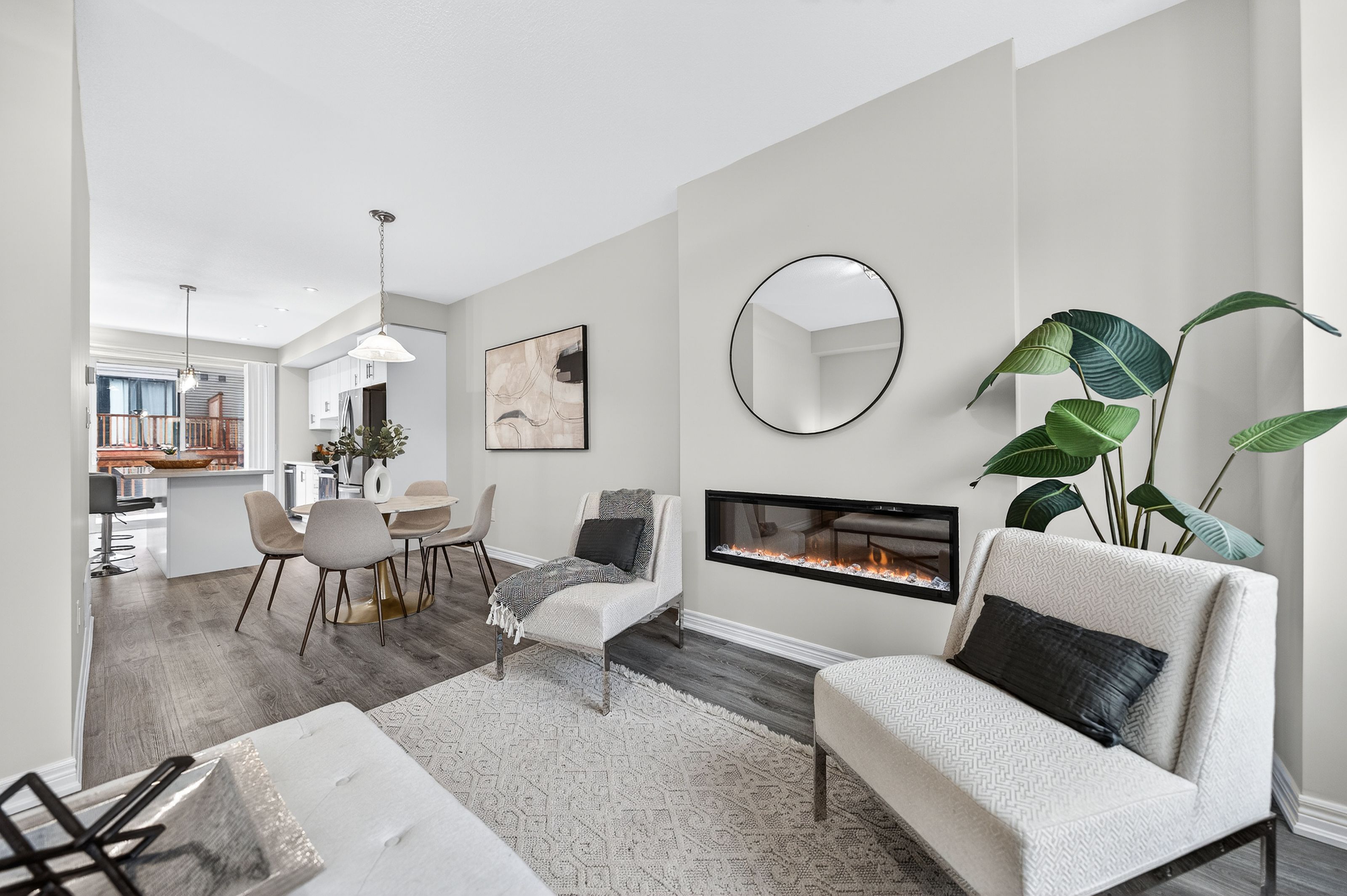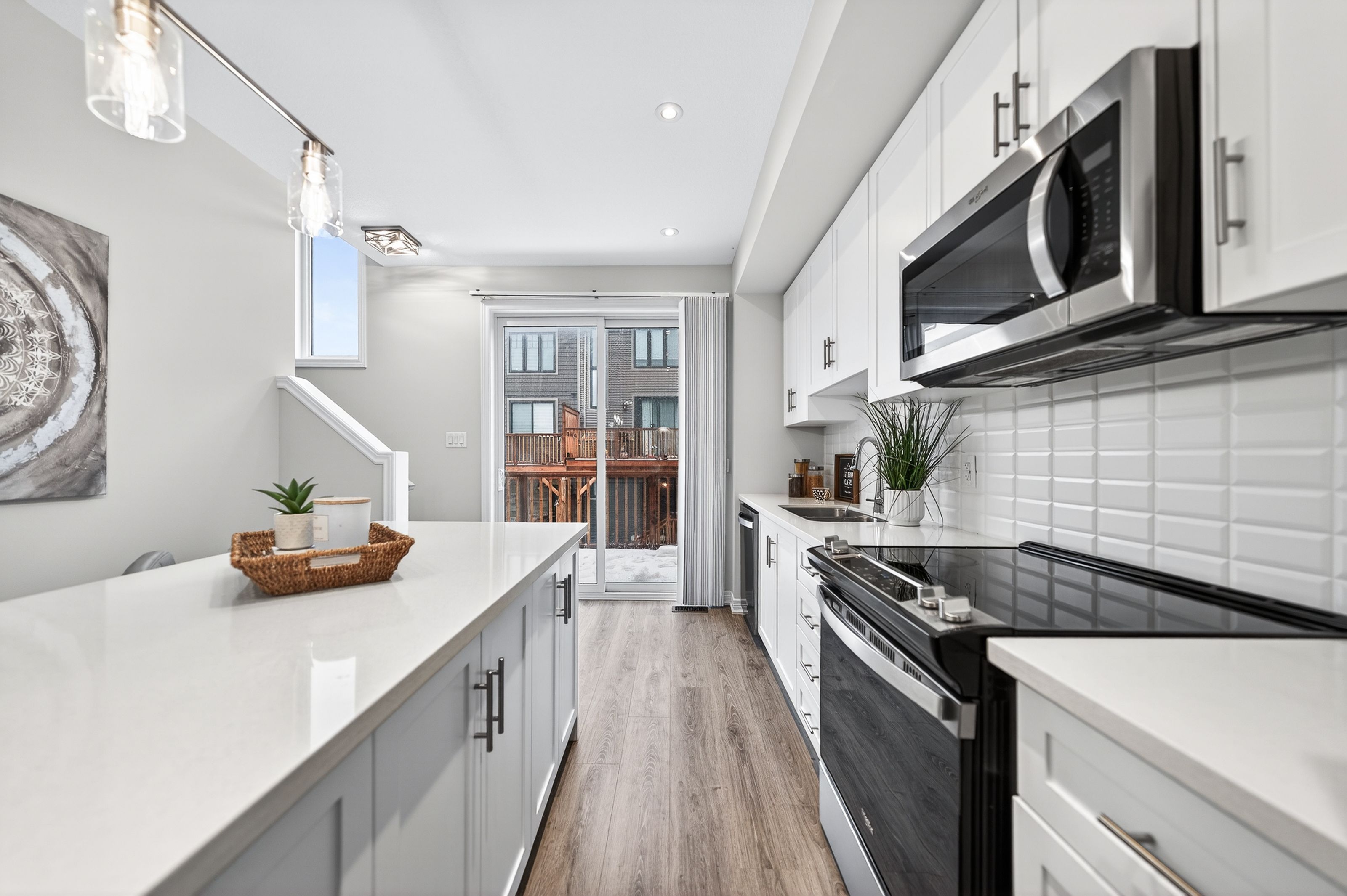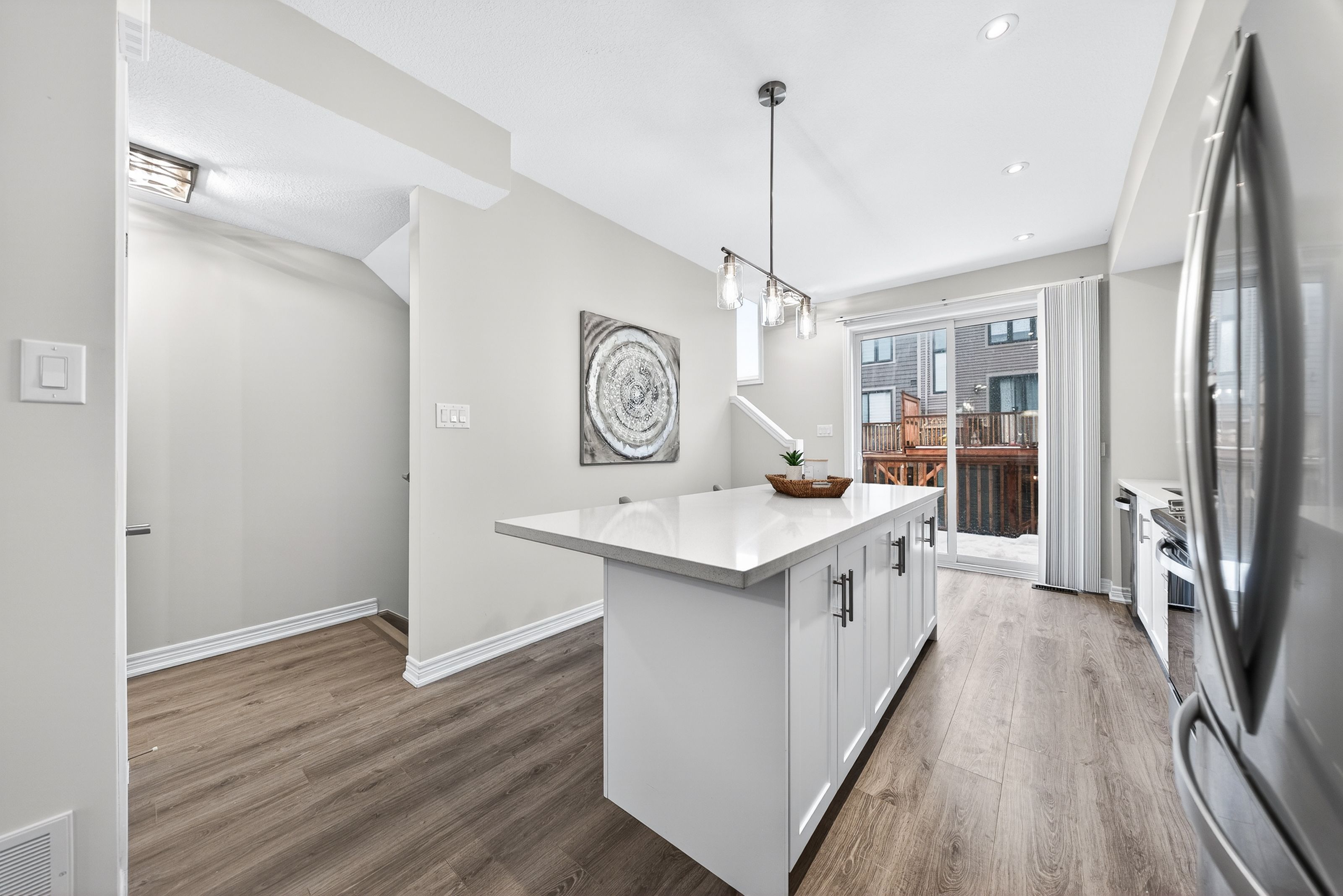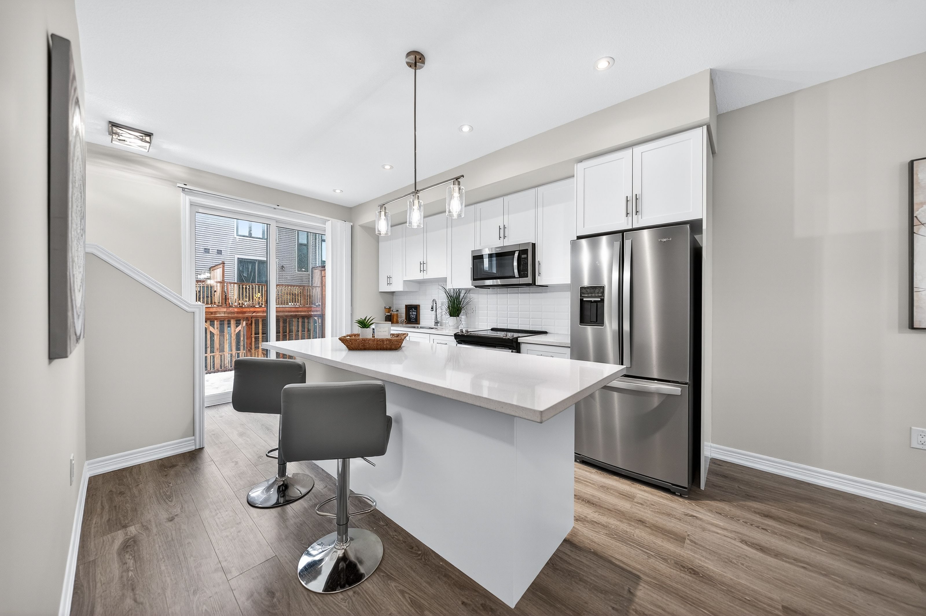 Welcome to this exceptional, freshly painted move-in ready townhome nestled in one of Cambridge's most desirable communities. Thoughtfully designed for modern living, this bright and beautifully appointed home features 9 ft ceilings, elegant finishes, and a spacious open-concept layout that seamlessly blends style, comfort, and everyday functionality. Over 1900sqft of total living space. Perfect for first-time buyers, growing families, or professionals. The main living level impresses with an abundance of natural light streaming through oversized windows, highlighting a warm and inviting living space anchored by a sleek electric fireplace. The contemporary white kitchen is both stylish and practical, showcasing quartz countertops, a large center island with breakfast seating, stainless steel appliances, subway tile backsplash, and ample cabinetry, all complemented by convenient roll-down blinds. Step outside to the private rear deck with privacy side panels, offering a peaceful retreat for relaxing or entertaining. A hardwood staircase leads to the upper level where three generously sized bedrooms provide comfort and versatility, each featuring large windows and neutral décor. The 4-piece bathroom includes a quartz vanity, soaker tub, and ceramic tile shower surround. Excellent location approximately 35 minutes to Mississauga, 15 minutes to University of Waterloo and Wilfrid Laurier University, and 20 minutes to University of Guelph. Walking distance to Walmart, Home Depot, Tim Hortons, Canadian Tire, Starbucks, and numerous shops, dining, and everyday amenities.