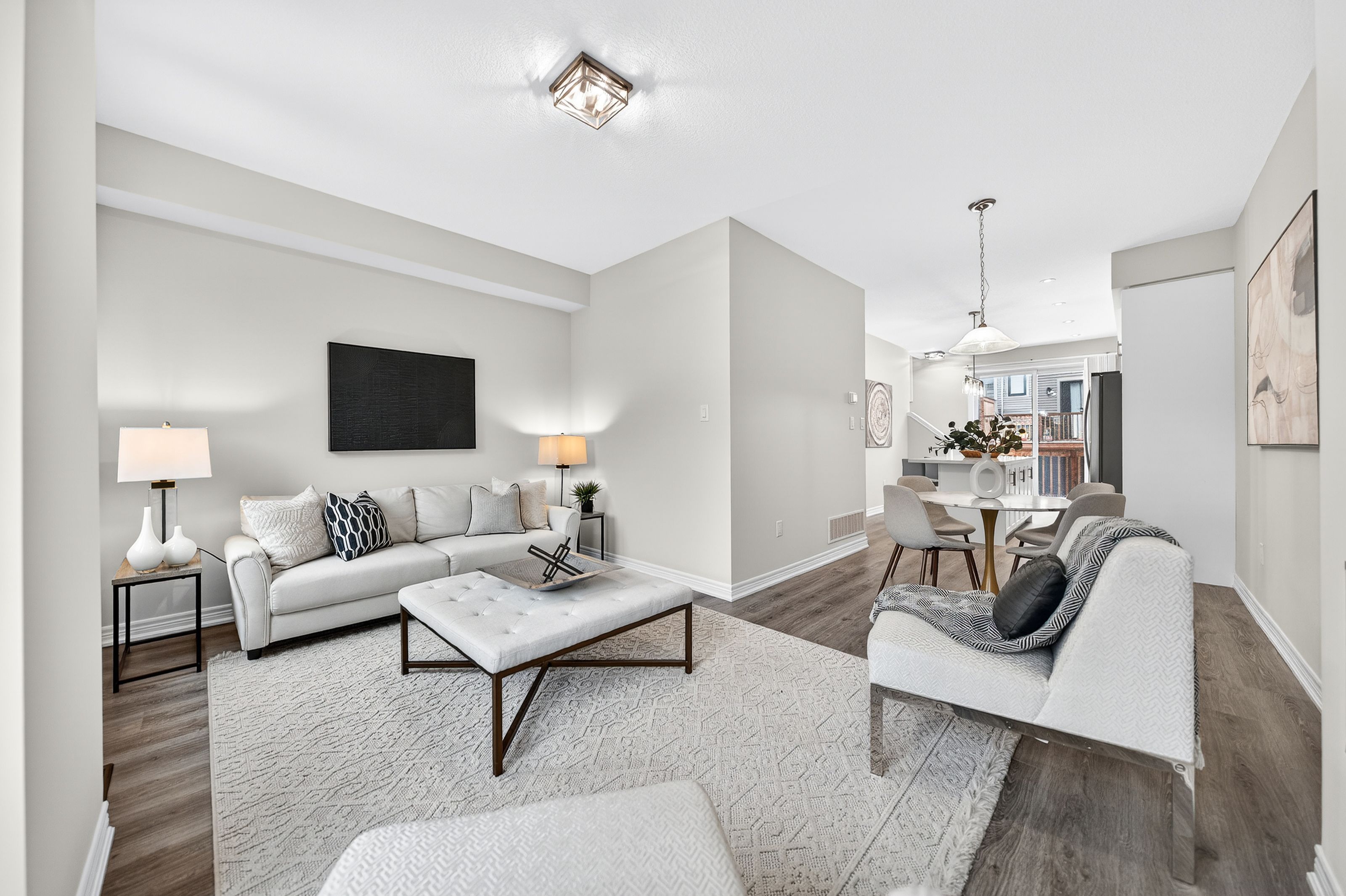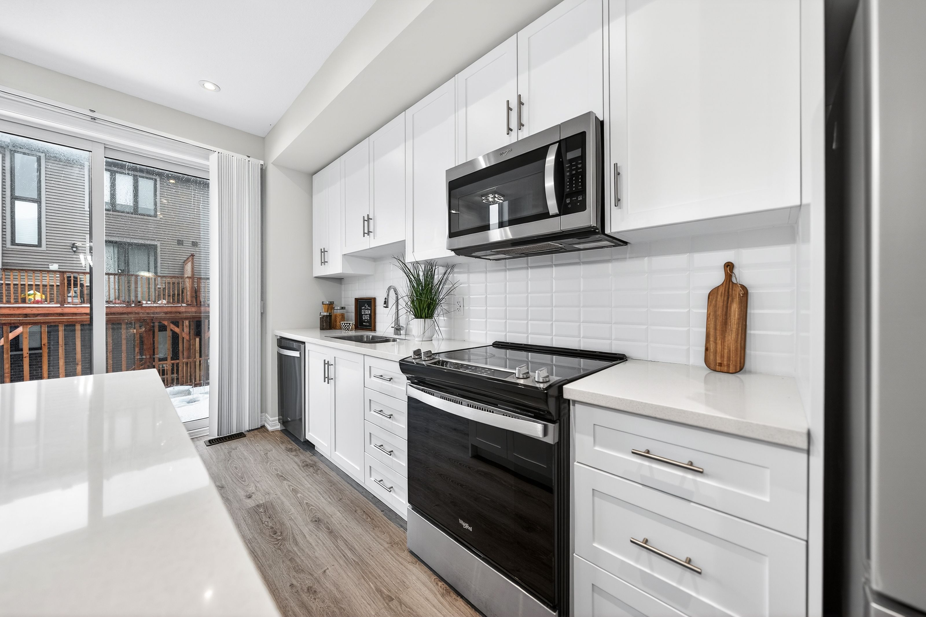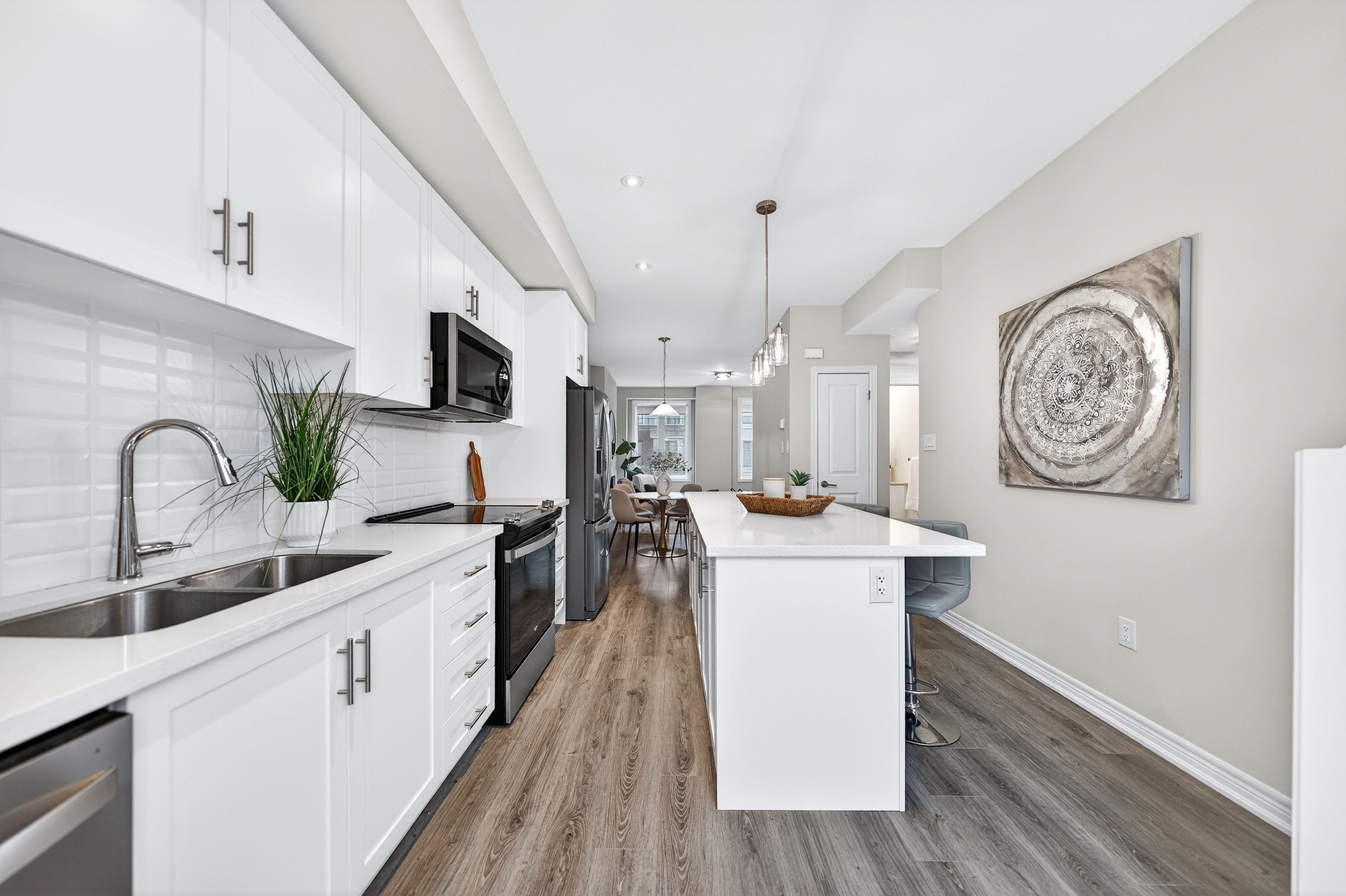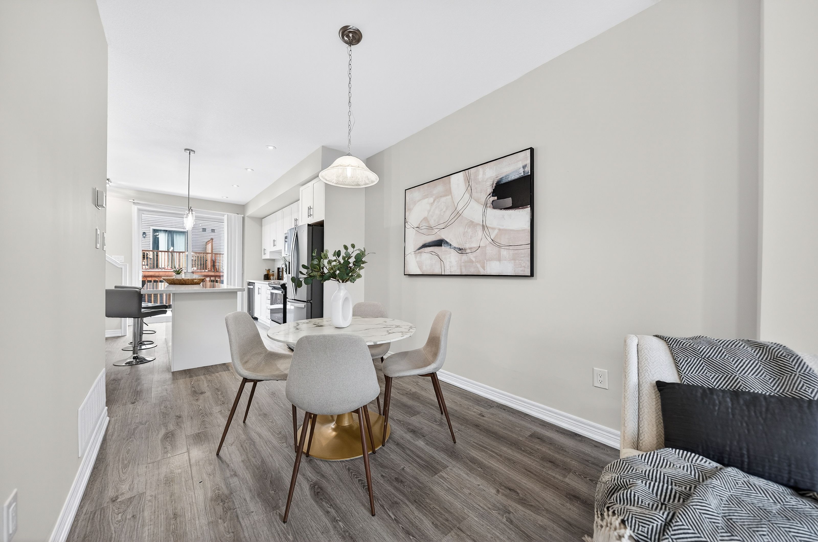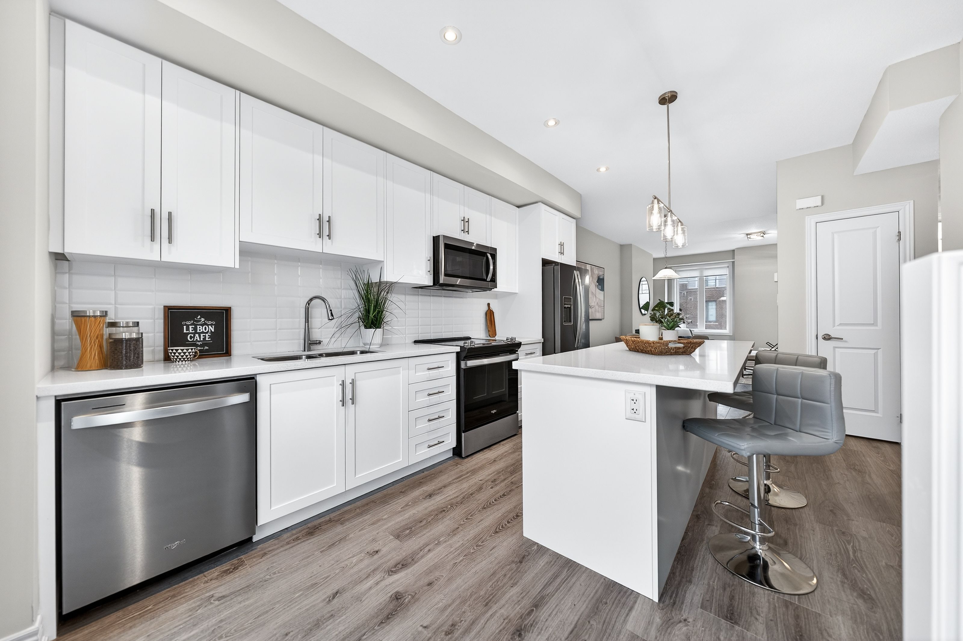 Welcome to this exceptional, freshly painted move-in ready townhome nestled in one of Cambridge's most desirable communities. Thoughtfully designed for modern living, this bright and beautifully appointed home features 9 ft ceilings, elegant finishes, and a spacious open-concept layout that seamlessly blends style, comfort, and everyday functionality. Over 1900sqft of total living space. Perfect for first-time buyers, growing families, or professionals. The main living level impresses with an abundance of natural light streaming through oversized windows, highlighting a warm and inviting living space anchored by a sleek electric fireplace. The contemporary white kitchen is both stylish and practical, showcasing quartz countertops, a large center island with breakfast seating, stainless steel appliances, subway tile backsplash, and ample cabinetry, all complemented by convenient roll-down blinds. Step outside to the private rear deck with privacy side panels, offering a peaceful retreat for relaxing or entertaining. A hardwood staircase leads to the upper level where three generously sized bedrooms provide comfort and versatility, each featuring large windows and neutral décor. The 4-piece bathroom includes a quartz vanity, soaker tub, and ceramic tile shower surround. Excellent location approximately 35 minutes to Mississauga, 15 minutes to University of Waterloo and Wilfrid Laurier University, and 20 minutes to University of Guelph. Walking distance to Walmart, Home Depot, Tim Hortons, Canadian Tire, Starbucks, and numerous shops, dining, and everyday amenities.