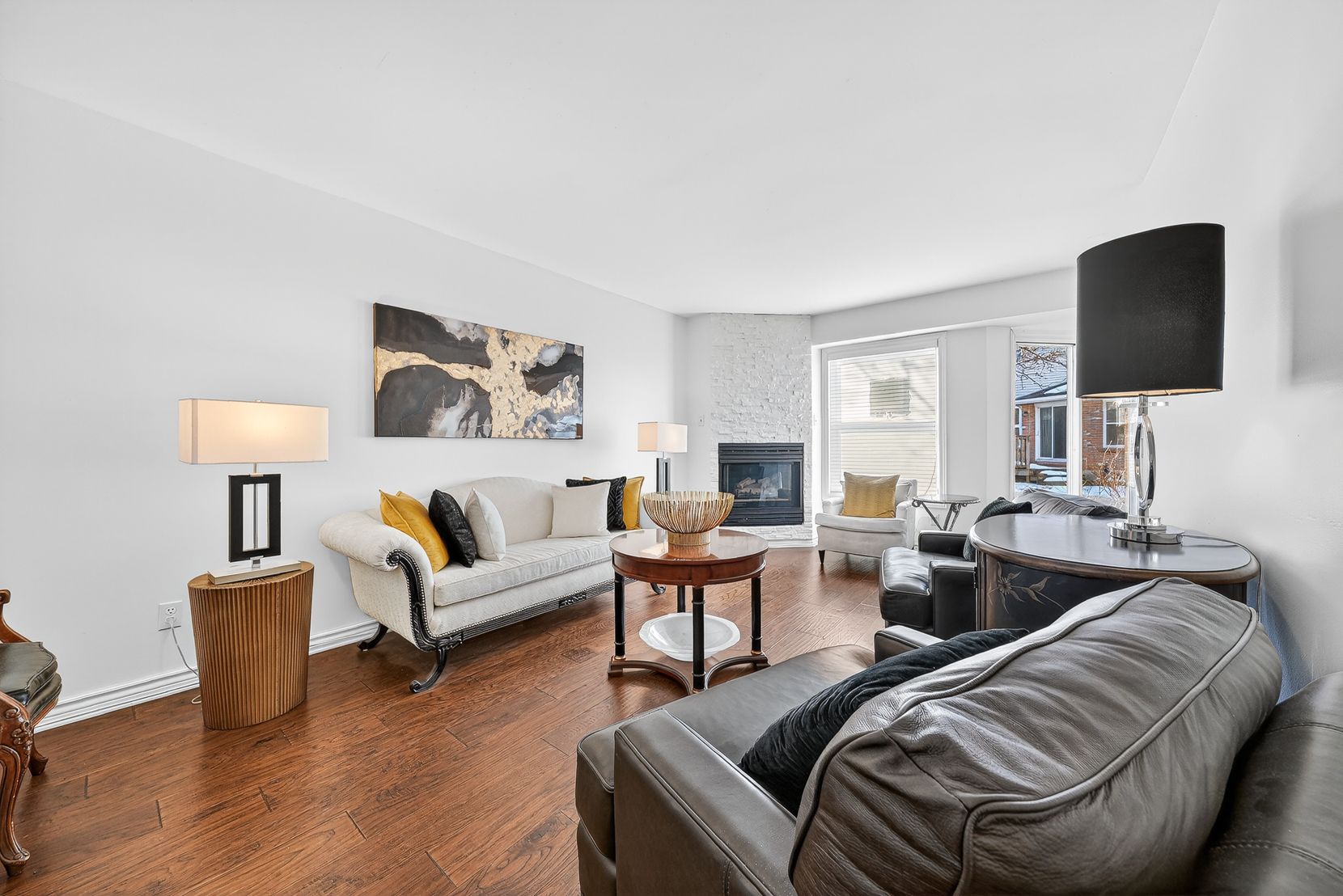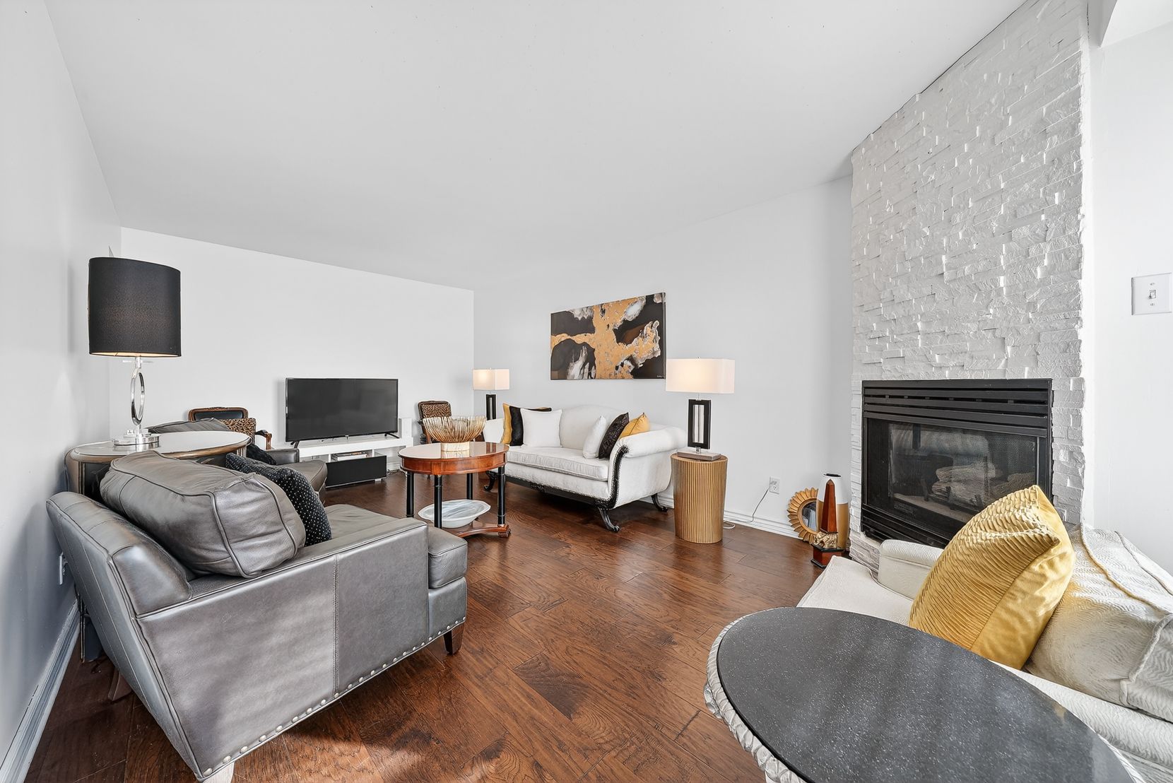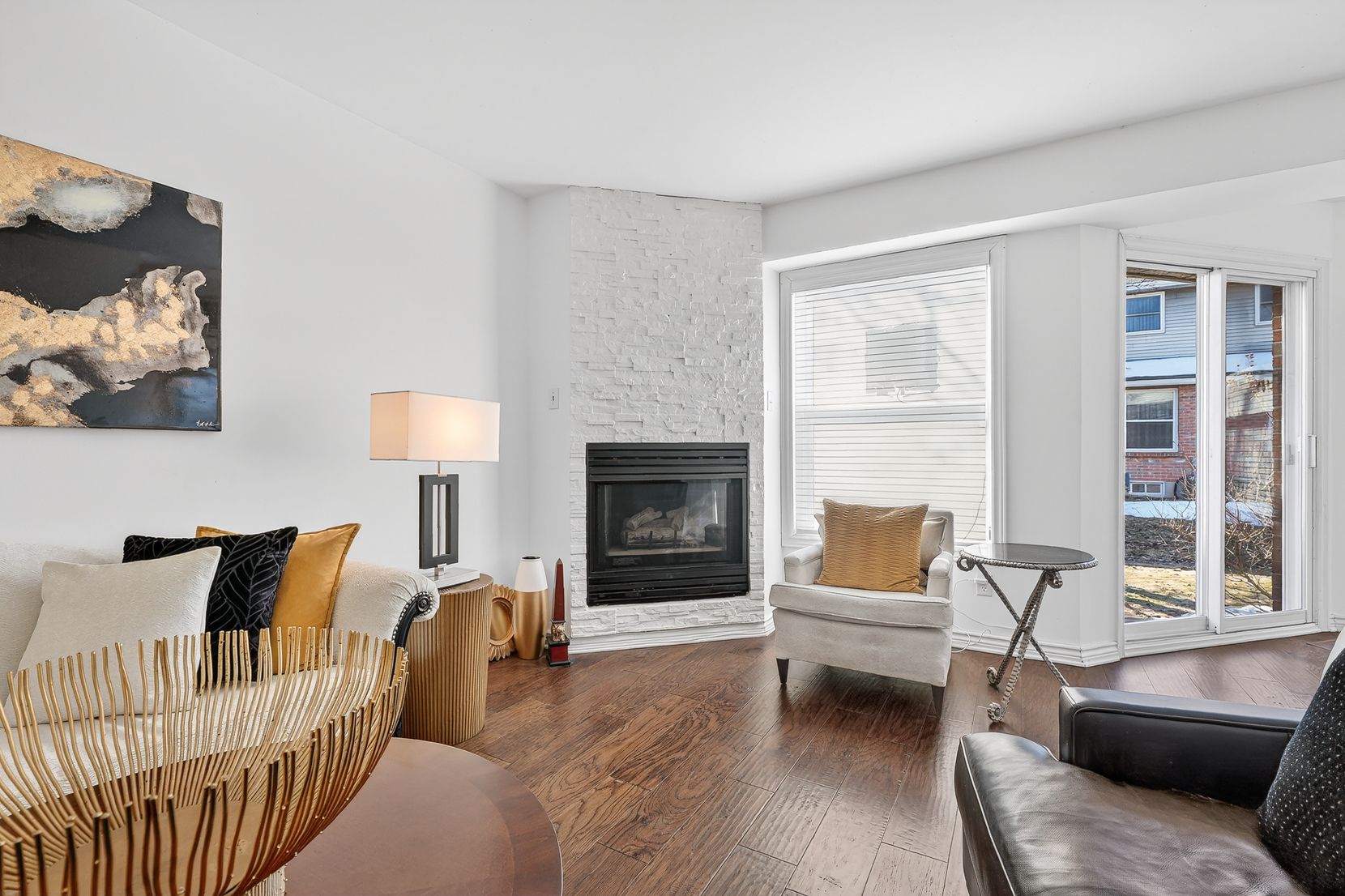 Tucked away in a quiet inside location, this two-storey condo townhouse offers exceptional privacy thanks to its position within the complex and the mature trees surrounding the common area. Meticulously improved throughout, the home features engineered hardwood on both levels and smooth ceilings in all major rooms (popcorn removed), with the exception of the two guest bedrooms. Upon entry, you're welcomed by a striking glass-and-metal stair railing that leads to the second level, creating a modern focal point in the foyer. The carpet-free interior - with carpet only on the staircase - includes a bright living room with a gas fireplace and neutral white walls that enhance the natural light. The kitchen is clean and well maintained, featuring hard surface countertops and a classic farmhouse-style sink, along with generous cabinetry and storage. Upstairs are three well-sized bedrooms, including a spacious primary retreat with a walk-in closet and abundant closet space throughout the home. The beautifully renovated ensuite offers a walk-in shower, and the main bath has also been tastefully updated. The finished lower-level rec room provides additional flexible living space, ready for your personal décor. This pet-free home also includes an attached garage and low monthly condo fees of $335. Ideally located close to grocery stores, restaurants, schools and offering quick access to major highways for easy commuting. Pride of ownership is evident throughout.