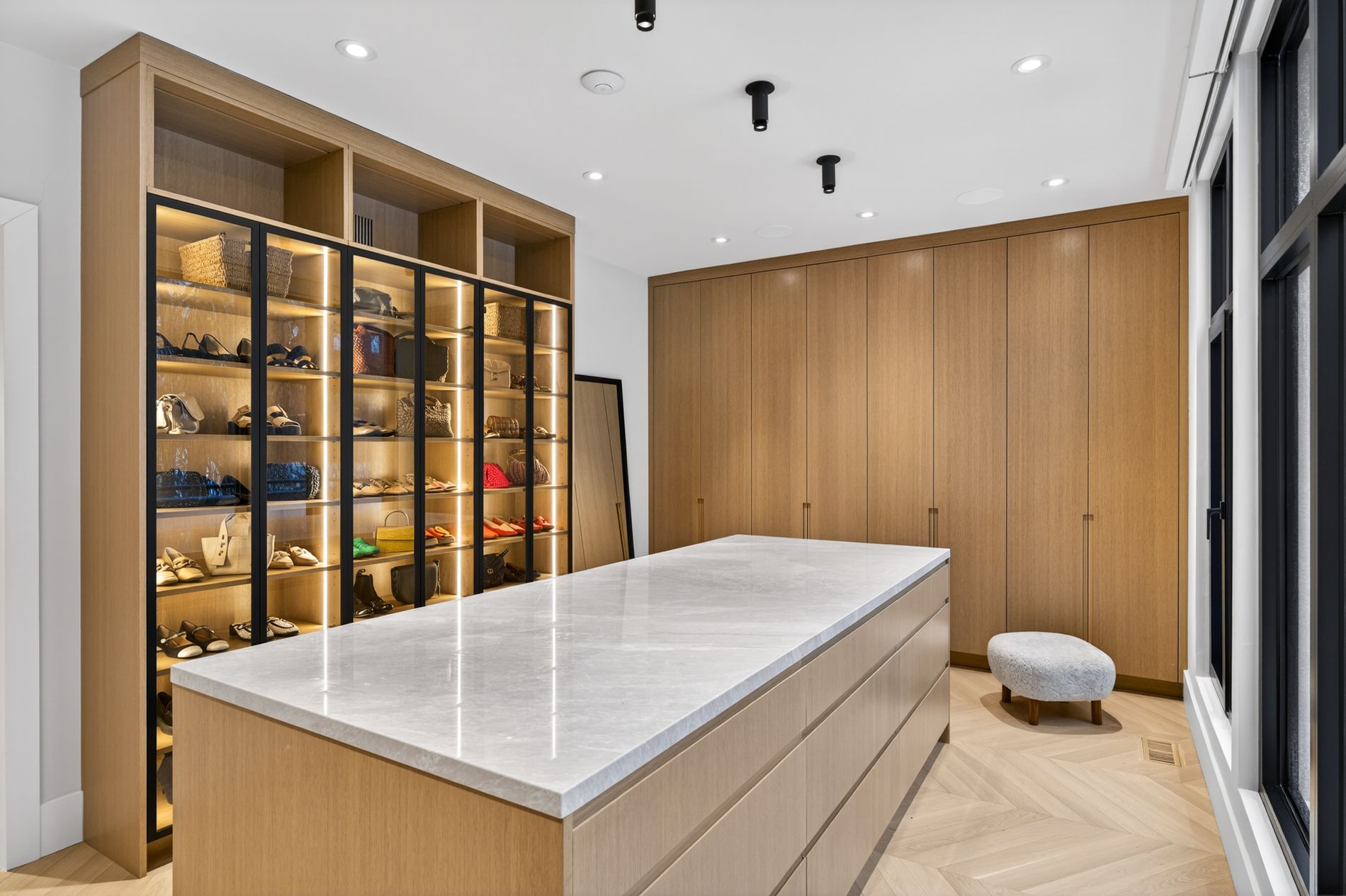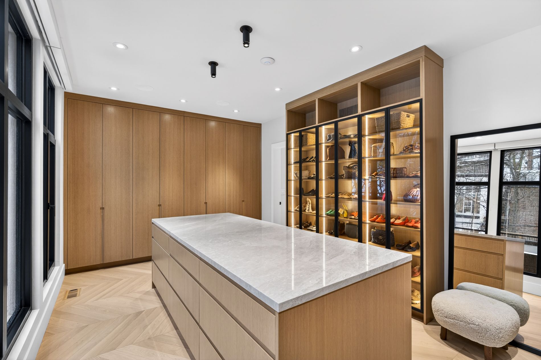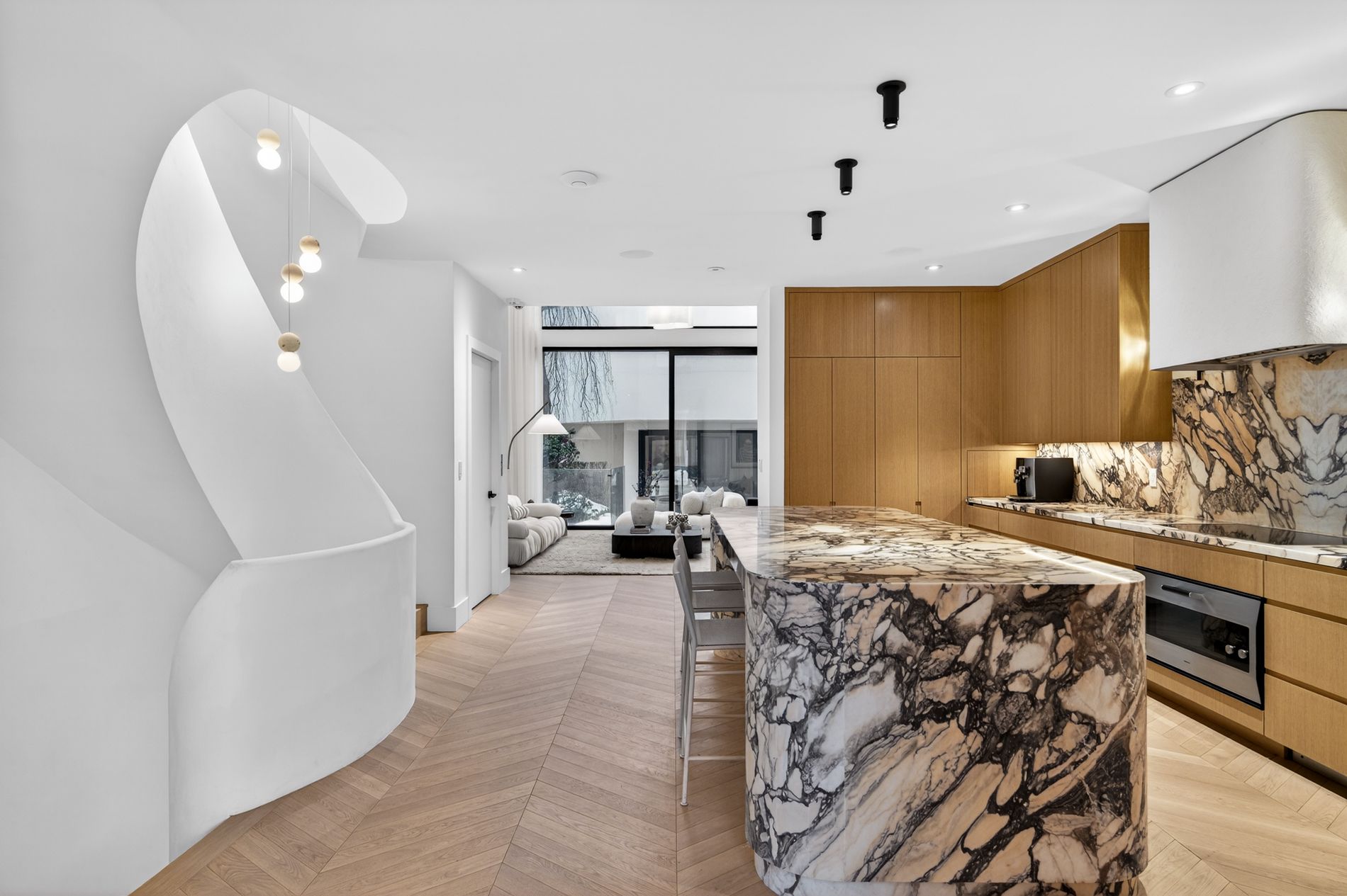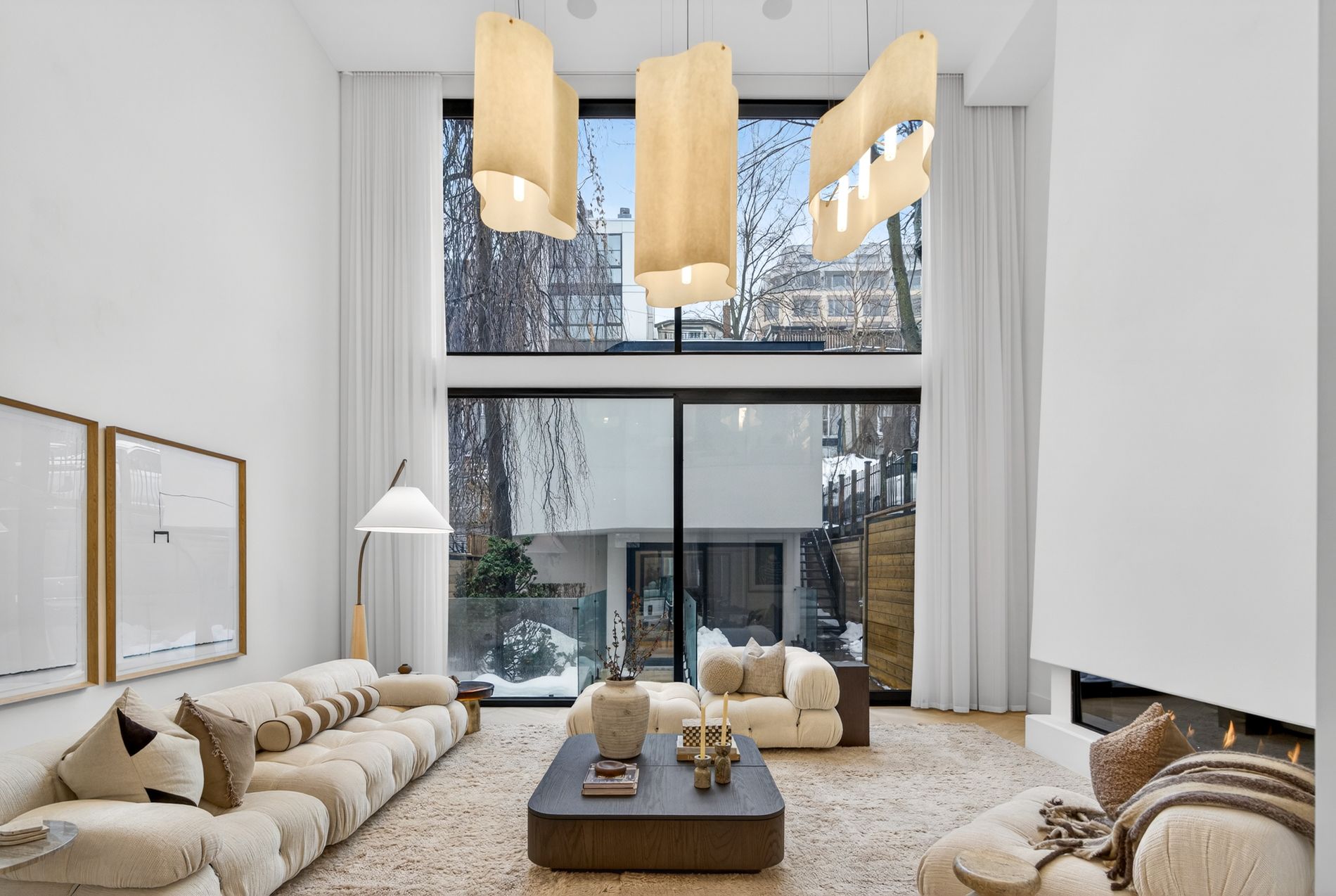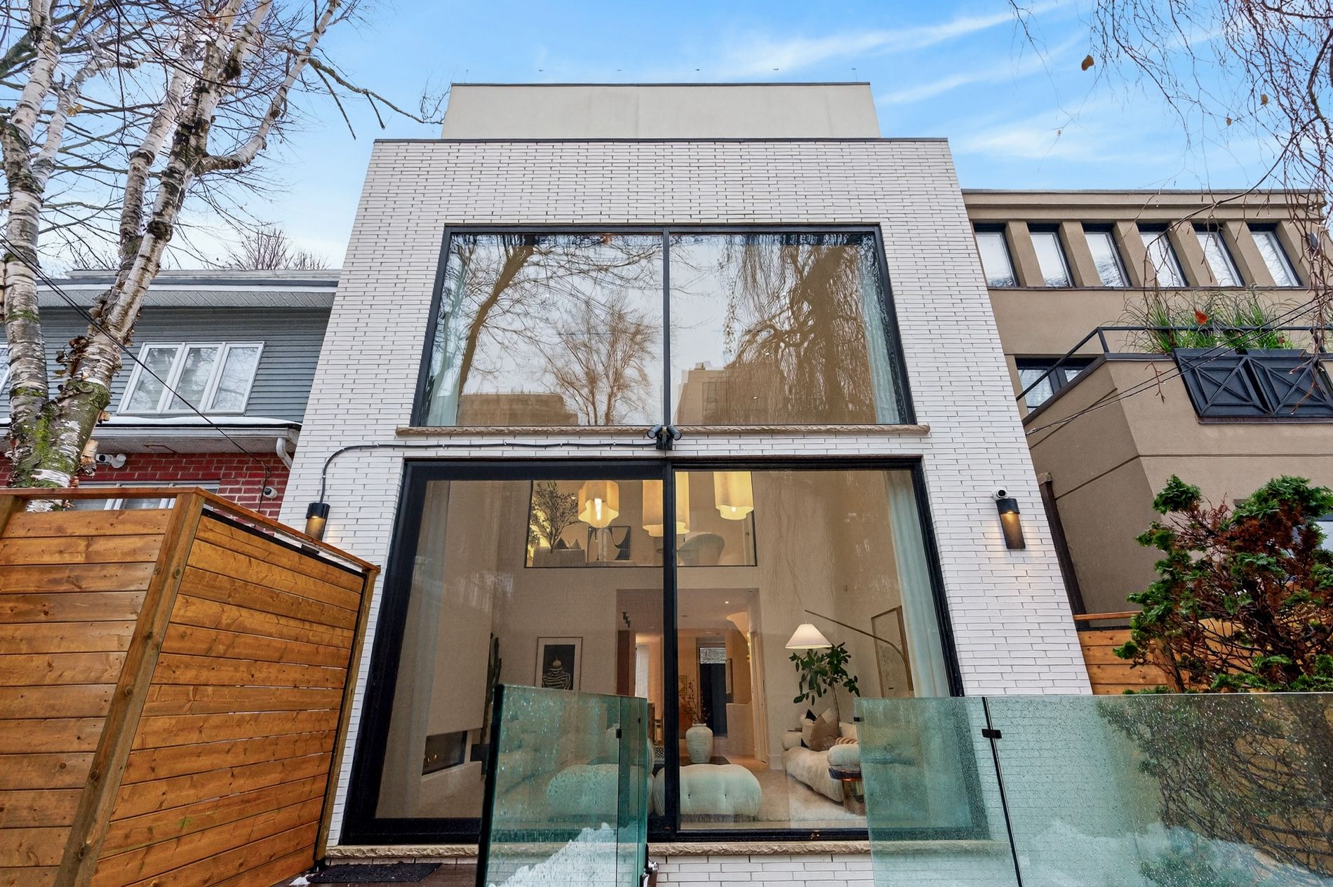 Set on the dividing line of Yorkville and Rosedale, 63 Pears is a remarkable custom home that offers a unique proposition to the Toronto marketplace as it is one of a dwindling number of luxury residences in the central core with protected views into greenspace. Completed in 2025, this truly spectacular home offers 3,562 square feet of above-grade living, complemented by a fully finished lower level and a private gym beneath the detached garage. A central elevator connects all floors, including the rooftop terrace, providing seamless accessibility and the opportunity to age in-place. The foyer dazzles at first glance with heated terrazzo flooring, while a full wall of rift-cut white oak millwork frames two large double closets, while the dining room offers endless park views through the floor-to-ceiling glass window and features a custom wine display for over 200 bottles. At the centre of this home, the kitchen is anchored by a dramatic ten-foot island wrapped in Calacatta viola rose marble, including its drawer fronts, while custom rift-cut white oak cabinetry lines the perimeter. The living room unfolds beneath soaring 19-foot ceilings and a striking wall of south-facing glass. A gas fireplace acts as a form of art with a custom surround that expands to the ceiling while the oversized sliding doors connect to the private landscaped gardens, the detached garage and a fully finished and heated gym! On the second floor, a sunlit south-facing library overlooks the cascading living room, while two bedroom suites each hold individual marble-clad ensuites and personalized closet systems. The third floor is dedicated entirely to the primary suite, with a marble-clad ensuite and an incredible dressing room with a centre island and south-facing walk-out. On the roof, an unbelievable terrace awards an oasis of privacy and an exciting entertaining space overlooking the park, all connected via the elevator. Beneath the garage, a home gym/studio is heated for year-round use!