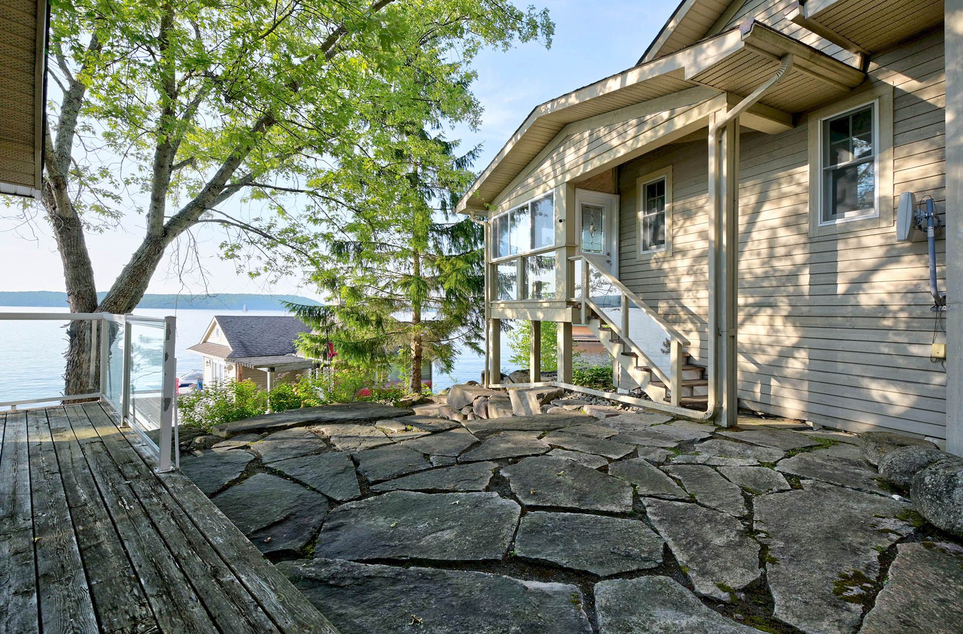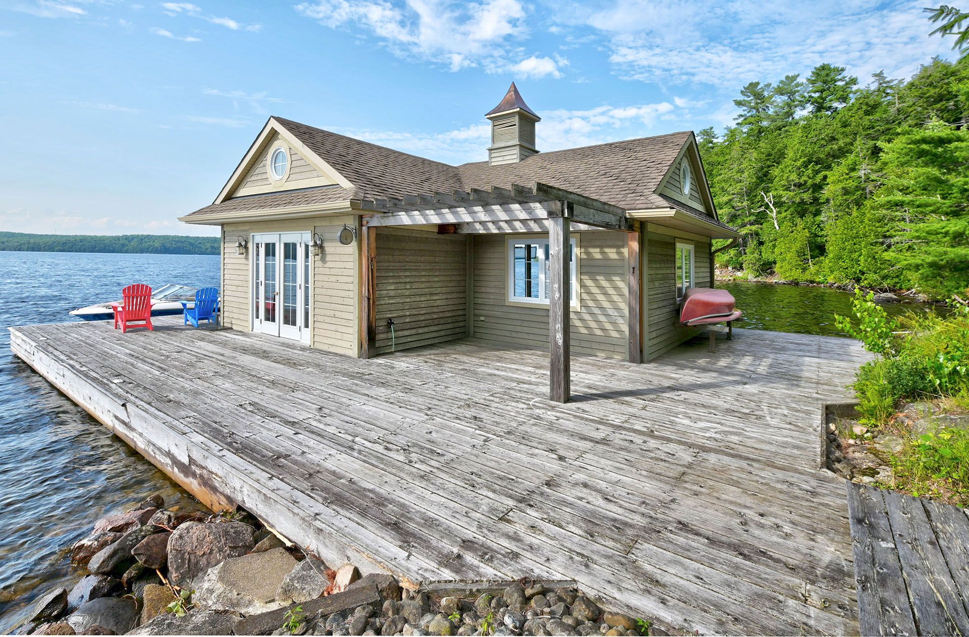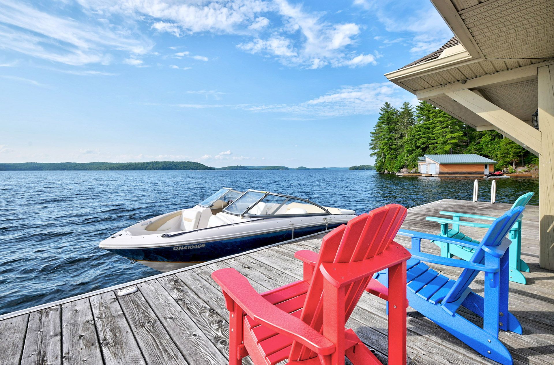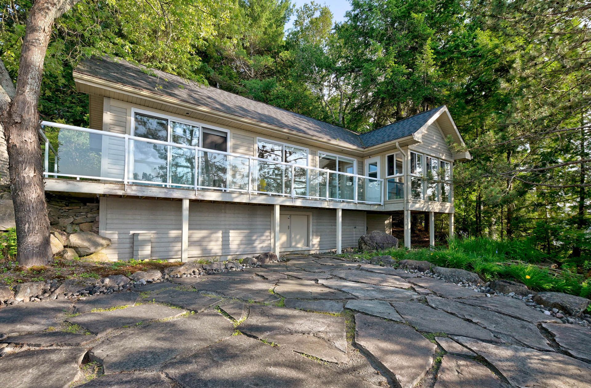 Prime Lake of Bays waterfront just outside Baysville, only a two-hour drive from the GTA, featuring 220 feet of pristine shoreline. This executive family compound offers two beautifully designed cottages. The main cottage boasts three bedrooms and two bathrooms, with a spacious open-concept Great Room that opens onto a 780 sq. ft. porch-perfect for entertaining or relaxing. The fully equipped two-bedroom and one bathroom guest cottage, complete with its own kitchen, is connected by professionally crafted stone pathways and patios, creating a seamless and inviting retreat for family and guests. Just steps from the water, the property includes a two-slip boathouse and generous dock, ideal for swimming, boating, and lakeside living. Enjoy breathtaking sunsets in this serene, private setting, while remaining just minutes from Bigwin Island.