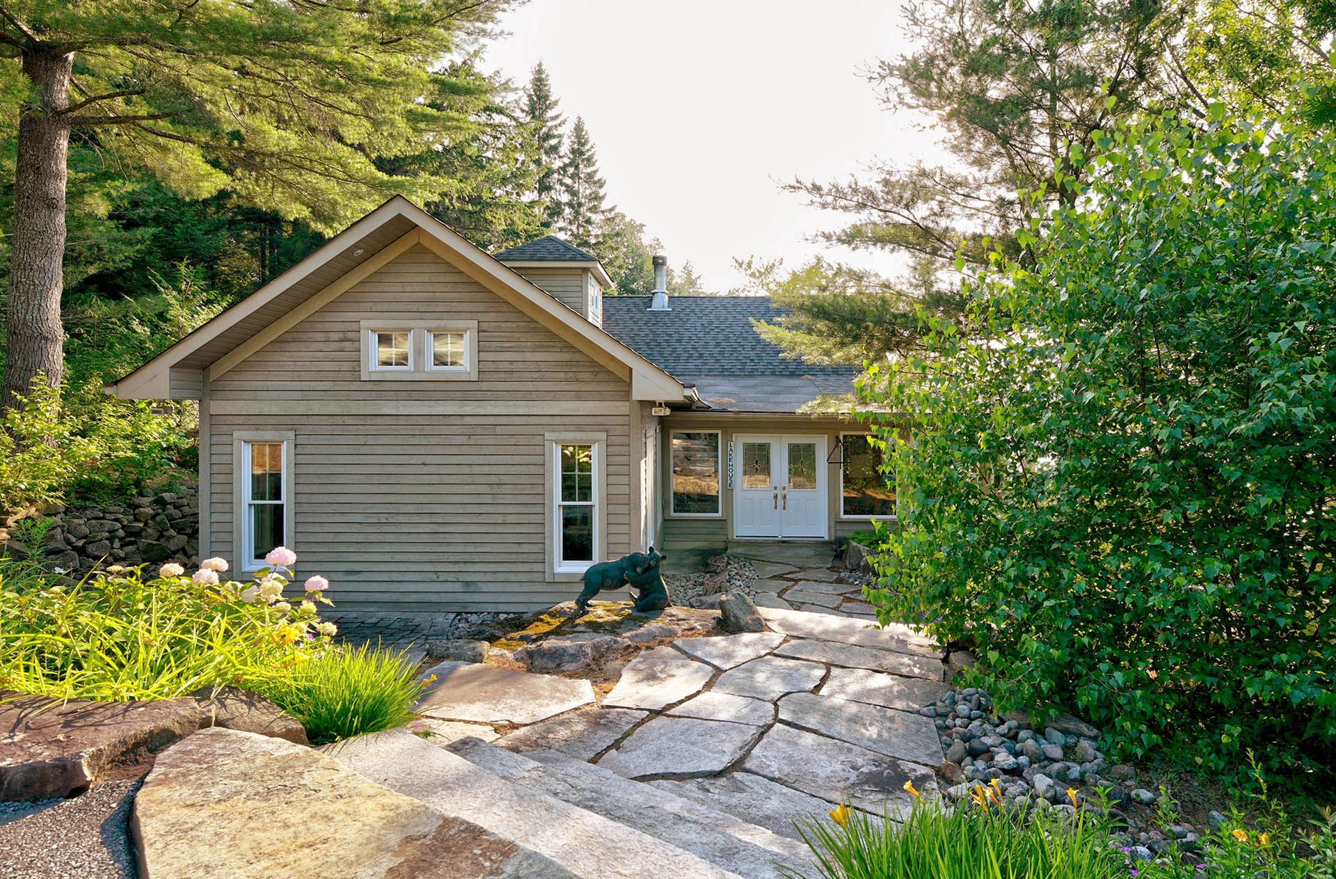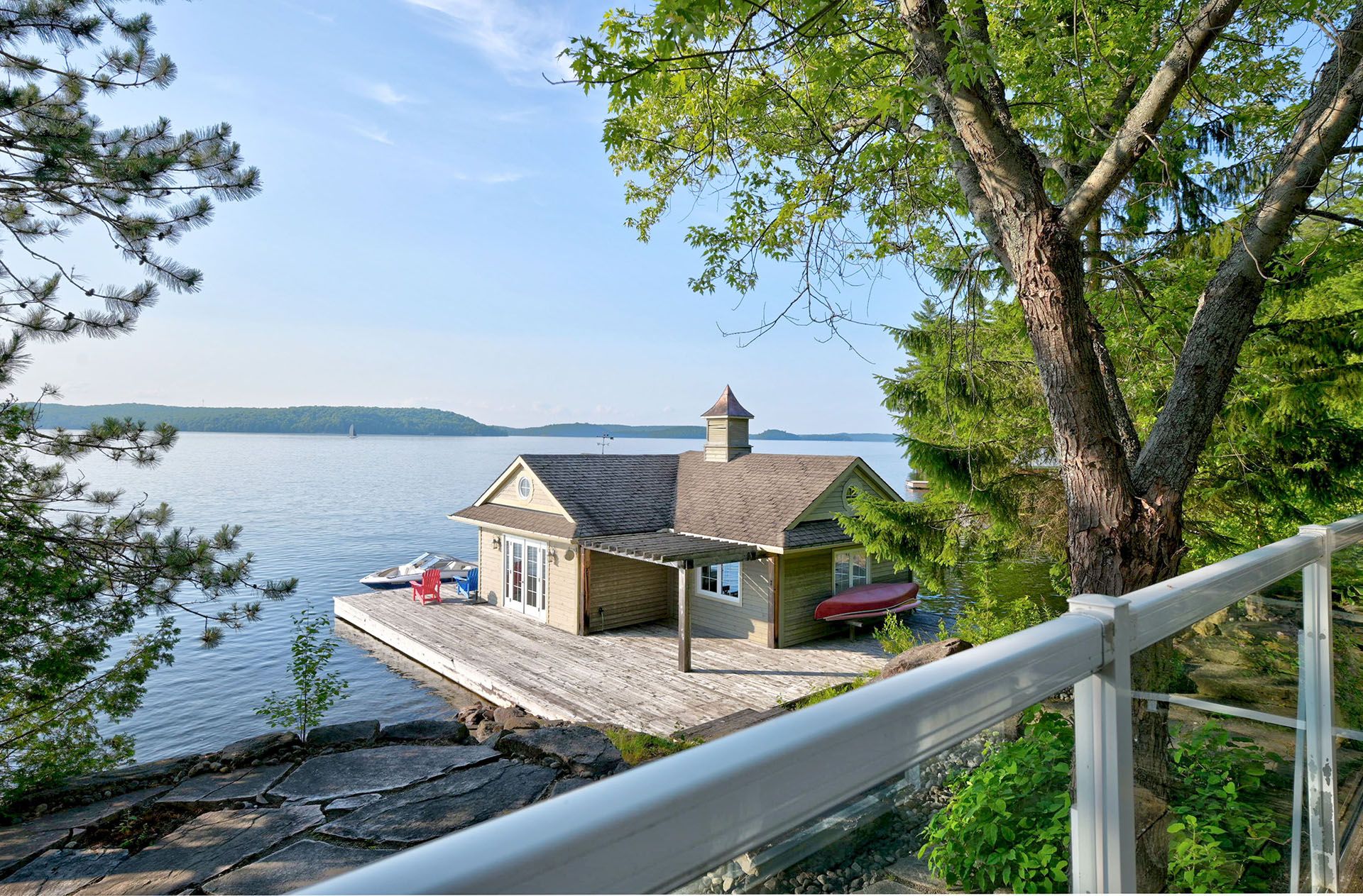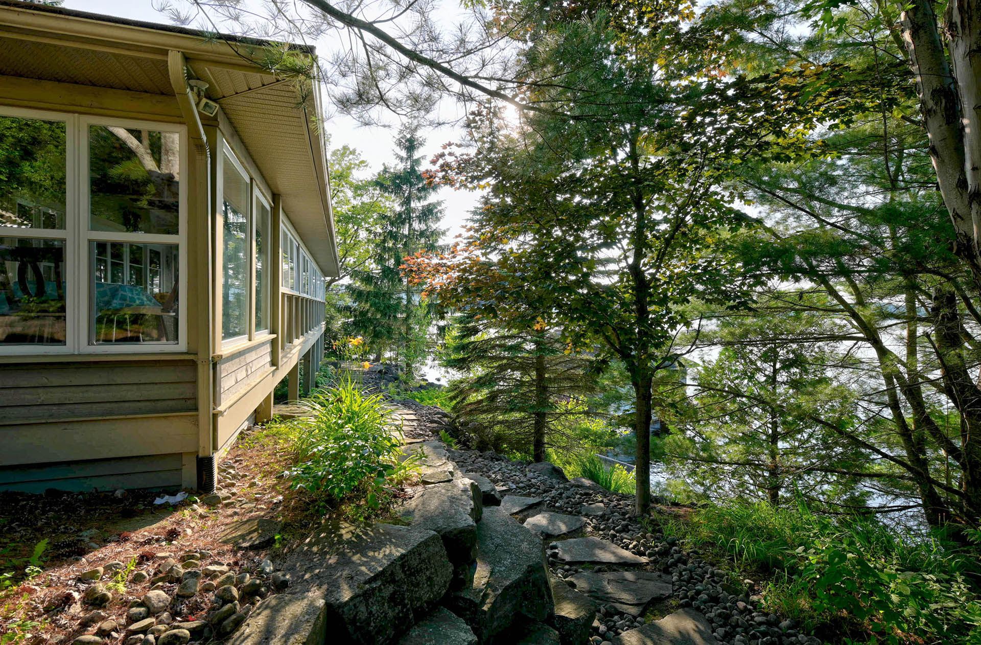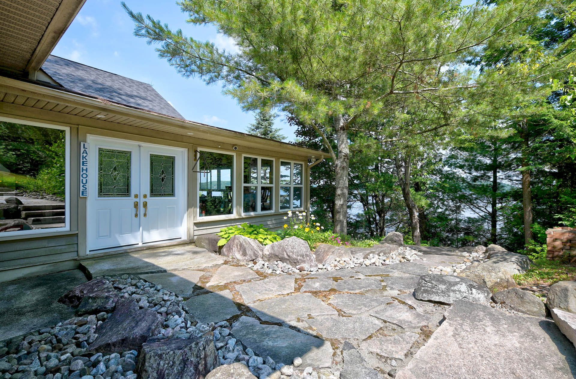 Prime Lake of Bays waterfront just outside Baysville, only a two-hour drive from the GTA, featuring 220 feet of pristine shoreline. This executive family compound offers two beautifully designed cottages. The main cottage boasts three bedrooms and two bathrooms, with a spacious open-concept Great Room that opens onto a 780 sq. ft. porch-perfect for entertaining or relaxing. The fully equipped two-bedroom and one bathroom guest cottage, complete with its own kitchen, is connected by professionally crafted stone pathways and patios, creating a seamless and inviting retreat for family and guests. Just steps from the water, the property includes a two-slip boathouse and generous dock, ideal for swimming, boating, and lakeside living. Enjoy breathtaking sunsets in this serene, private setting, while remaining just minutes from Bigwin Island.