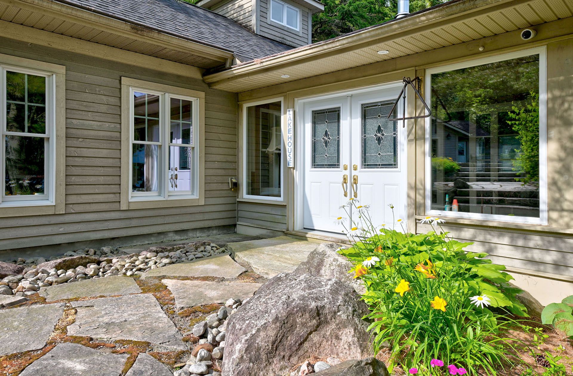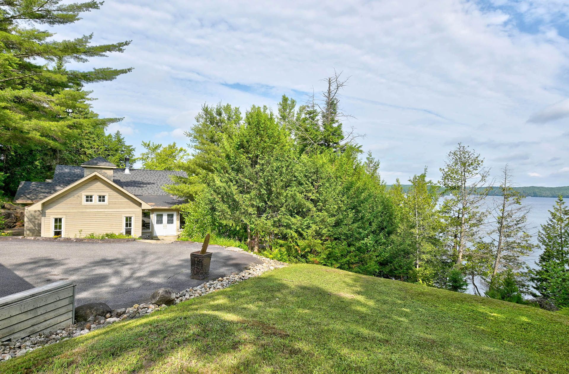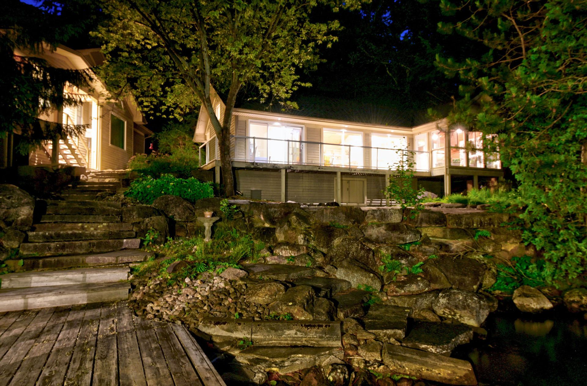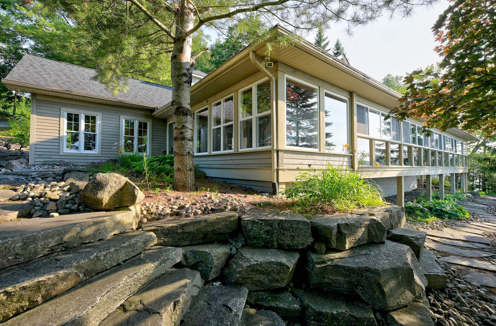 Prime Lake of Bays waterfront just outside Baysville, only a two-hour drive from the GTA, featuring 220 feet of pristine shoreline. This executive family compound offers two beautifully designed cottages. The main cottage boasts three bedrooms and two bathrooms, with a spacious open-concept Great Room that opens onto a 780 sq. ft. porch-perfect for entertaining or relaxing. The fully equipped two-bedroom and one bathroom guest cottage, complete with its own kitchen, is connected by professionally crafted stone pathways and patios, creating a seamless and inviting retreat for family and guests. Just steps from the water, the property includes a two-slip boathouse and generous dock, ideal for swimming, boating, and lakeside living. Enjoy breathtaking sunsets in this serene, private setting, while remaining just minutes from Bigwin Island.
