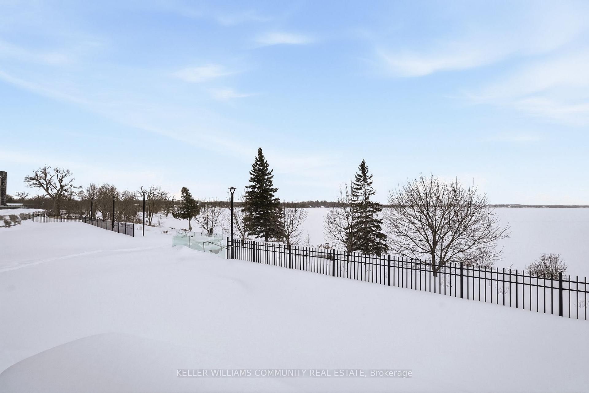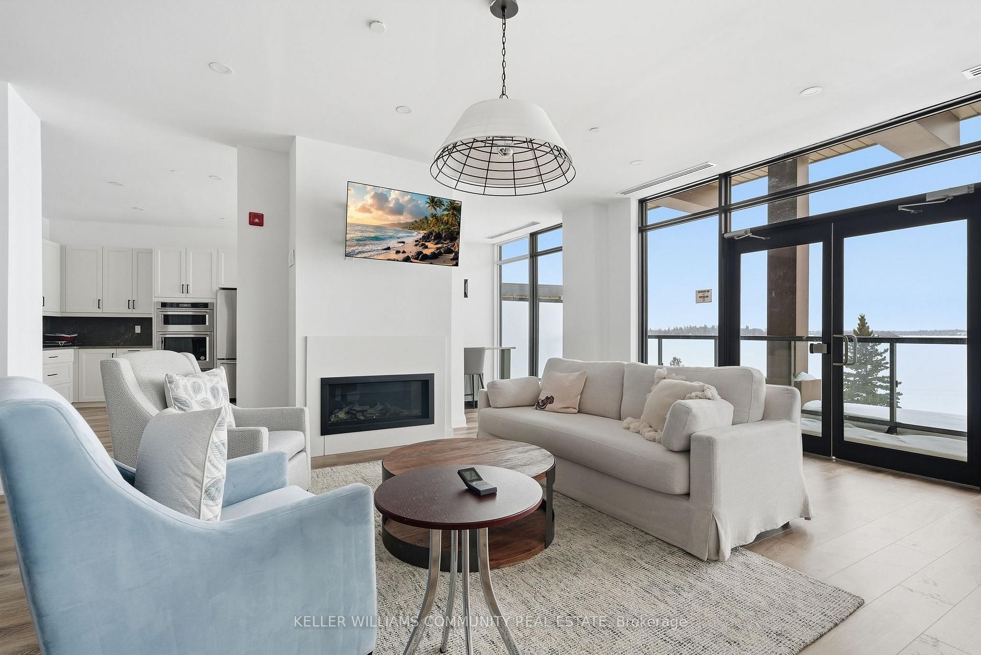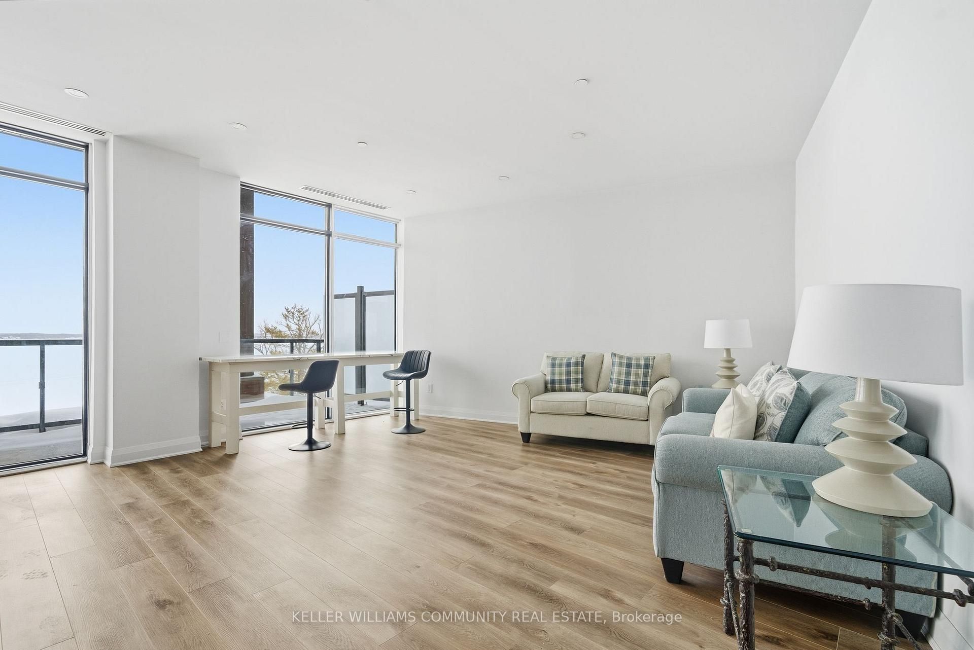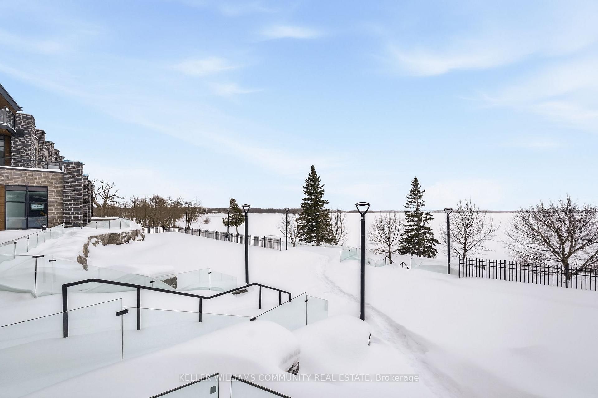 Welcome to Unit 206 at The Moorings on Cameron Lake, where refined condo living meets the calm and beauty of waterfront life. This spacious2-bedroom, 2-bathroom suite offers approximately 1,063 sq ft of thoughtfully designed interior space, plus a stunning 39-foot covered balconyproviding an additional 250 sq ft of living space, all overlooking Cameron Lake. Perfect for relaxing, entertaining, or enjoying unforgettablesunrises over the water. Inside, the suite features 9-foot ceilings, expansive windows, and quality finishes throughout, creating a bright andwelcoming atmosphere. The open-concept living and dining area flows seamlessly into the modern kitchen, ideal for both everyday living andhosting guests. The primary bedroom includes a private ensuite and generous closet space, while the second bedroom and full bathroom offerflexibility for guests, a home office, or comfortable everyday living. In-suite laundry adds to the convenience of this well-designed home.Residents of The Moorings enjoy exceptional resort-style amenities designed to support both relaxation and an active lifestyle. The third-floorowners' lounge features breathtaking lake views and includes a full kitchen, dining areas, cozy fireside seating, and a private theatre room,perfect for entertaining. The fitness centre is equipped with cardio and weight machines change rooms, a dedicated yoga and pilates studio, anda cedar sauna. Additional conveniences include a pet cleaning station, ideal for dog owners after lakeside walks or outdoor adventures.Outdoors, residents can enjoy a heated pool and spa, tennis and pickleball courts, a landscaped lakeside courtyard, and waterfront docking withswimming and lounging platforms. Located on the shores of Cameron lake in the heart of Fenelon Falls, this condo offers the perfect balance ofnature and walkable small-town charm!