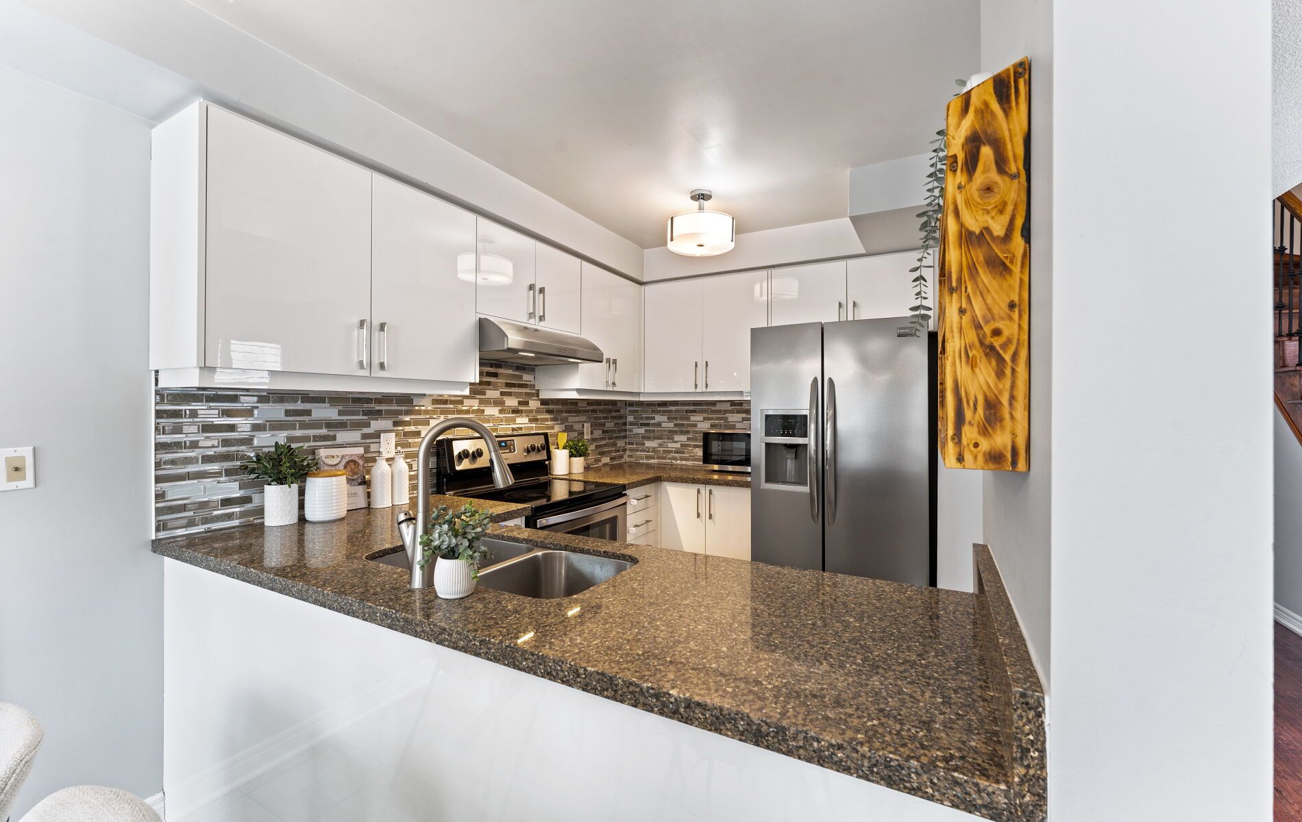 This charming three-bedroom, four-bathroom home is situated on a quiet court. It features a walkout basement that opens to a pie-shaped lot backing onto a ravine. The property has a garage with a double driveway. The modern kitchen is equipped with stainless steel appliances, a breakfast bar, and granite countertops with a walk out to a deck and BBQ. New wide plank flooring is featured throughout the house. The primary bedroom has a walk-in closet and updated ensuite bathroom. The finished basement offers high ceilings, lots of light, and a walk out to the backyard with private ravine views and no neighbours behind! It includes a recreation room, a full bathroom, and a laundry room. The furnace was replaced in 2025. With a good walk score, shopping, schools, public transit, parks, and highways are all nearby.