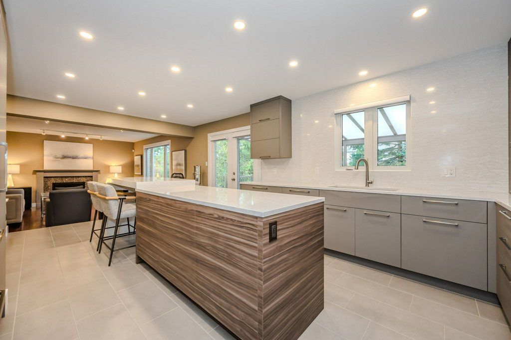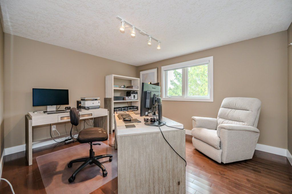 Welcome to this pristine family home tucked away on a quiet cul-de-sac in the highly sought-after Pine Ridge neighbourhood. A newly installed interlock driveway completed last year adds exceptional curb appeal to an already beautiful home. The main level offers a large living room with a vaulted ceiling, a dining room, and a family room with a gas fireplace, all featuring beautiful hardwood flooring. The freshly renovated kitchen showcases modern cabinetry, a panel covered fridge and dishwasher, stunning quartz countertops, and a waterfall island with integrated counter height seating. A convenient two piece powder room and laundry room complete the main level. Upstairs you will find three spacious bedrooms, a four piece main bathroom, and an open concept den. The primary bedroom features a walk in closet and a stunning ensuite with a floor-to-ceiling glass shower enclosure, waterfall shower system, and seamless tile insert drain. The main bathroom impresses with a glass wall shower enclosure, custom cabinetry, and a freestanding soaking tub. Thoughtful details throughout the main and upper levels include modern baseboards and casing, framed floor vents, updated interior doors and hardware, and custom window coverings. The walkout basement offers a rec room with a gas fireplace, a two piece washroom, and additional space for games or crafts. Outside, the serene backyard setting features mature trees and lush gardens, with views from the covered composite deck and the patio below. Enjoy added privacy backing onto trails and green space, just steps from three nearby parks, neighbourhood trails, South end amenities, and quick access to the highway. The quality of updates throughout this home are truly unparalleled and must be seen in person to be fully appreciated.