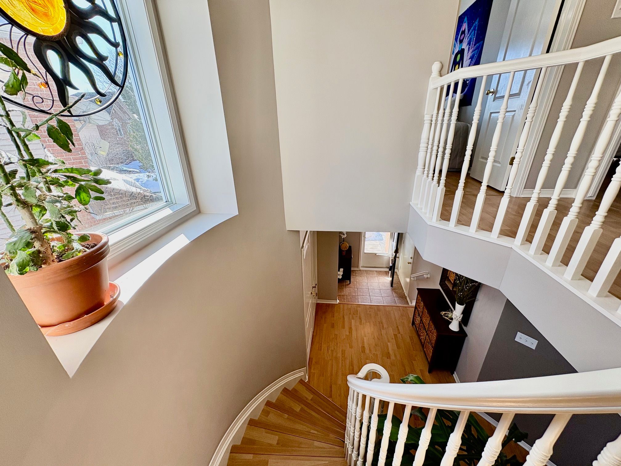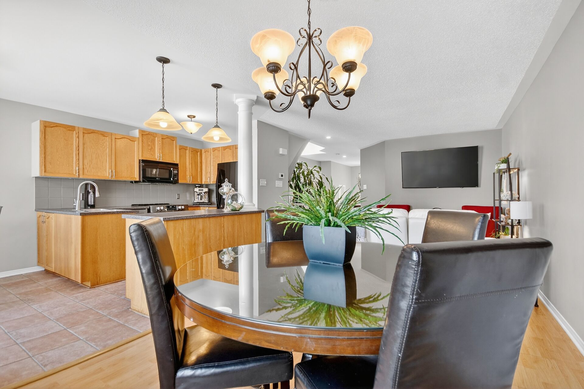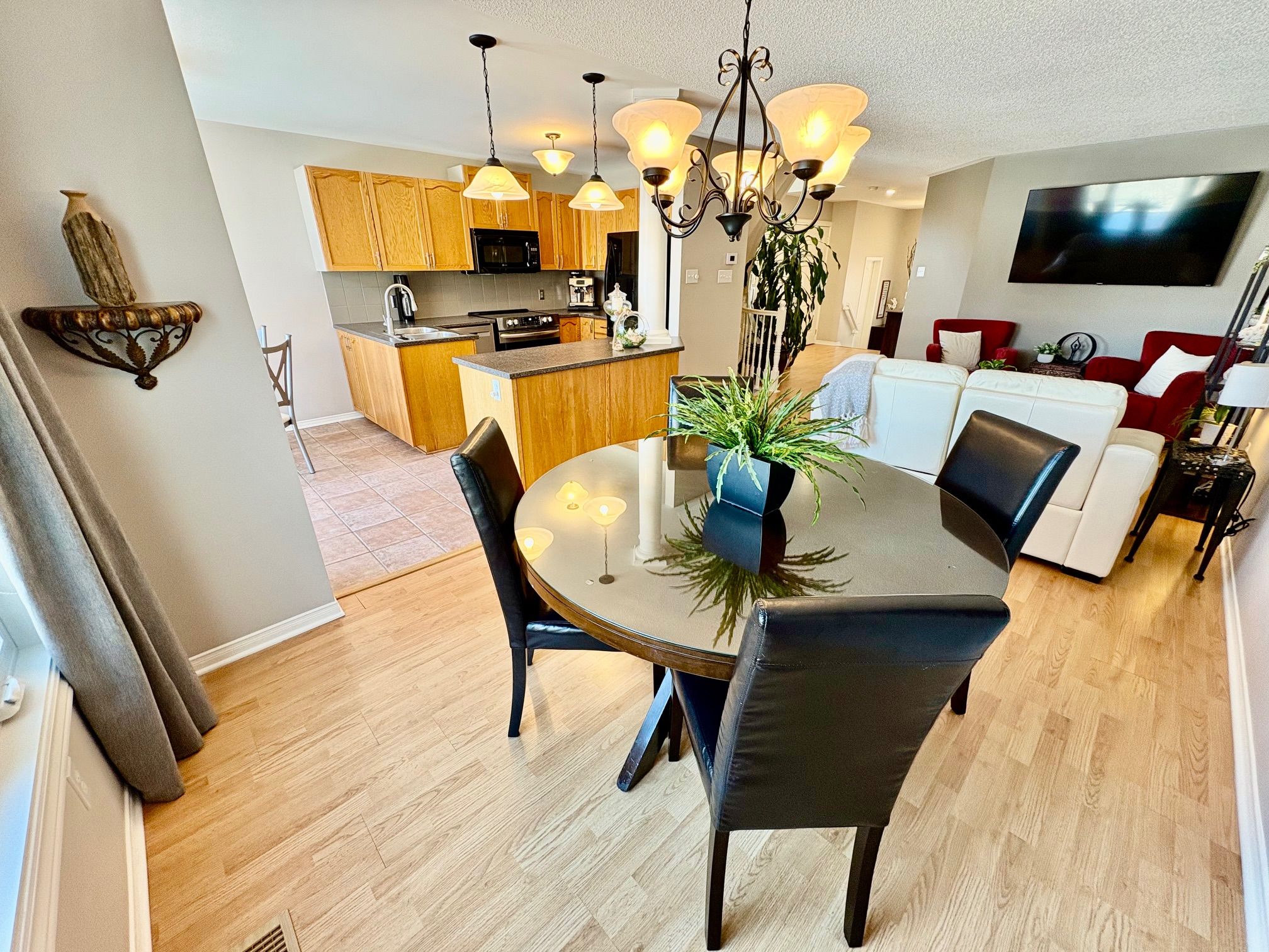 Open house 2-4 March 8th. Welcome to this beautiful semi detached home situated on a desirable pie shaped style lot in the lovely community of Chapel Hill North. You will be introduced by a sizable front foyer overlooking a stunning circular staircase with a lovely large window. This wonderful well maintained home showcases a lot of natural light. The open concept main level features a generous size lining/dining room, a breakfast area with partial vaulted ceiling and a functional kitchen with peninsula counter space in addition to a spacious island, double sink, and built-in microwave oven hood fan combo, all of which provide views of the backyard. Leading to the upper level you will be delighted by the spacious primary bedroom providing a walkin closet, electric fireplace and a convenient ensuite bathroom with separate shower and soaker tub. There are two sizable secondary bedrooms with double closets, a functional shared bathroom and a linen closet to complete the second level. Have fun and host your guests in the finished basement family room featuring a gas fireplace and good size window. There is plenty of storage space for all your personal needs, a practical laundry tub and no carpet to allow for easy maintenance. The backyard has a cedar deck & fence, perfect to entertain your family and friends including a hot tub. The Minto home plan indicates a total size of 1867 SQFT. Central air conditioning, practical interior garage access from the front foyer, garage door opener and 2 exterior parking spots for a total of 3 parking. You will appreciate that this home is surrounded by so many amenities such as shopping, transit, schools, parks, sport facilities and so much more. Take a moment to review the link for the panorama videos and additional pictures. As well as reading the multiple upgrades & special features list attached. Enjoy this nicely presented and move in ready home for your family to create new memories.
