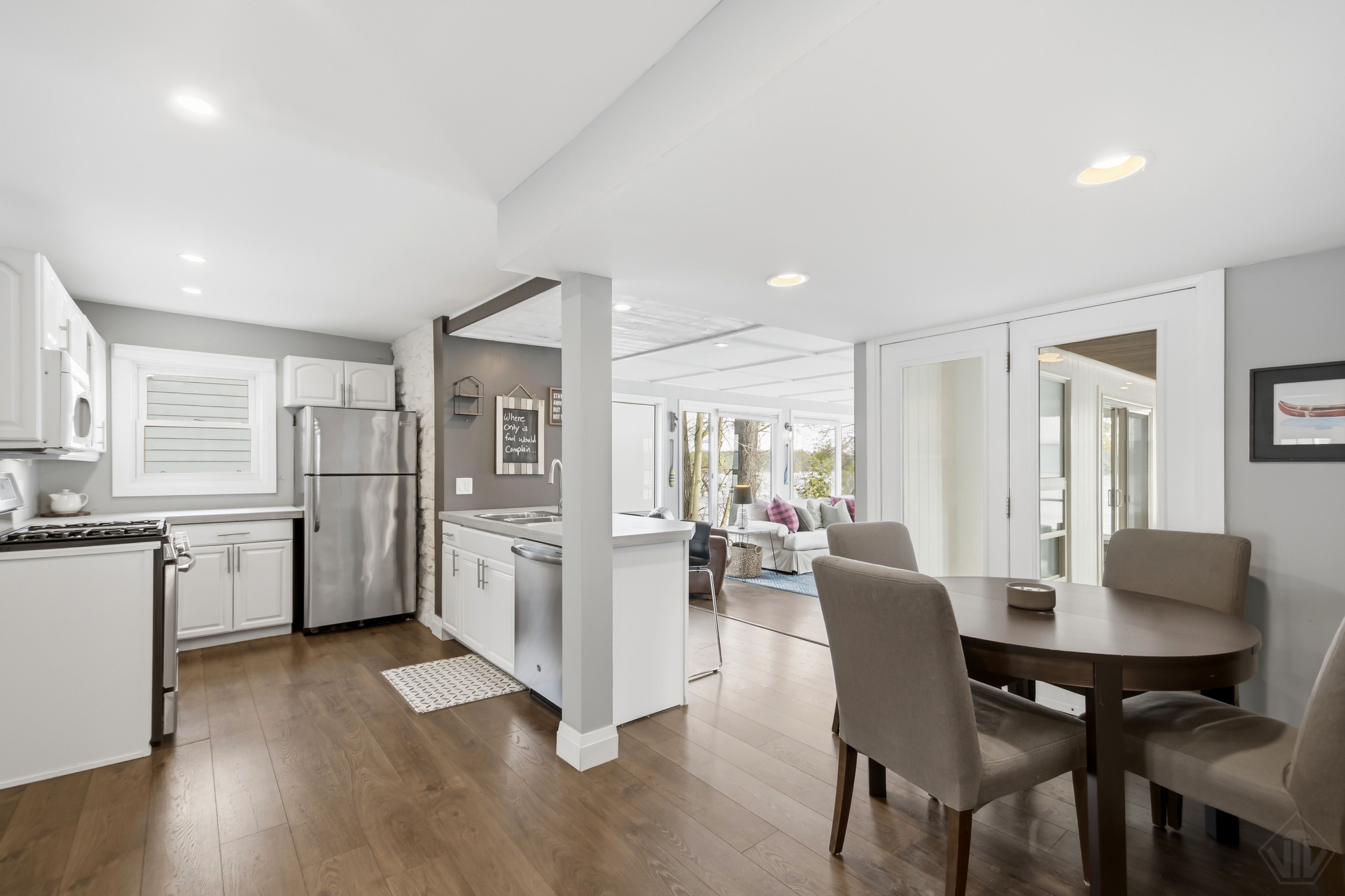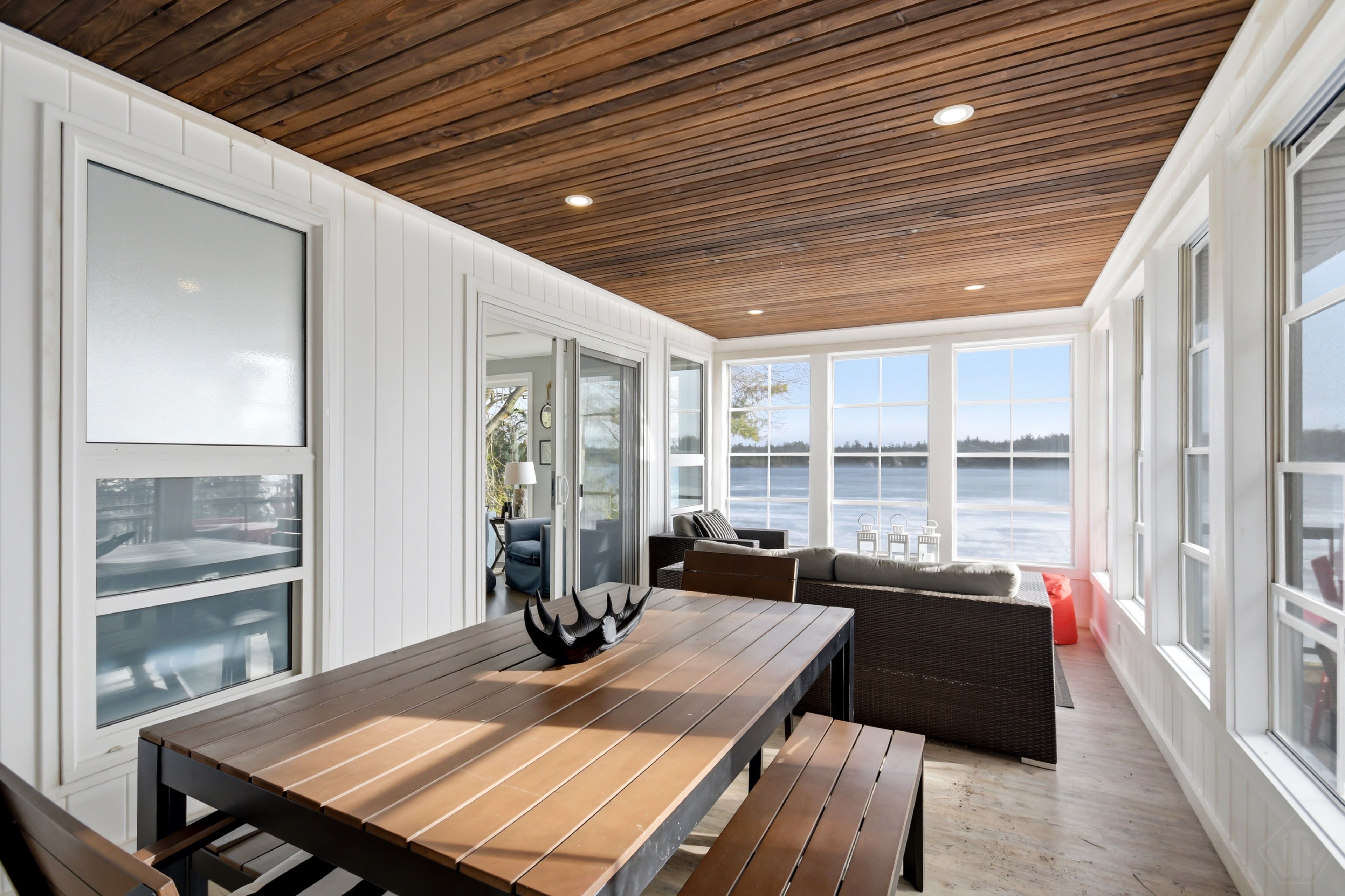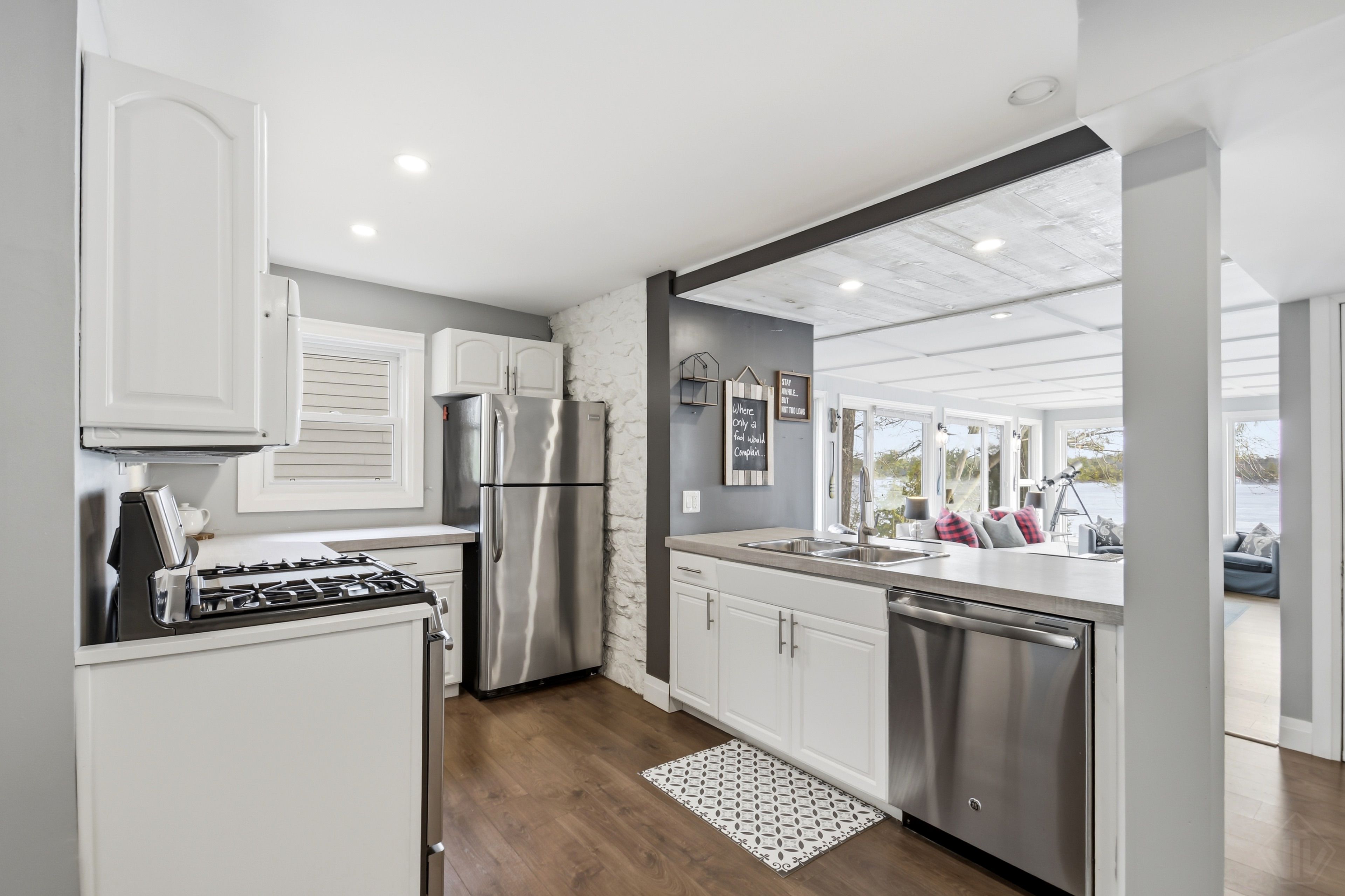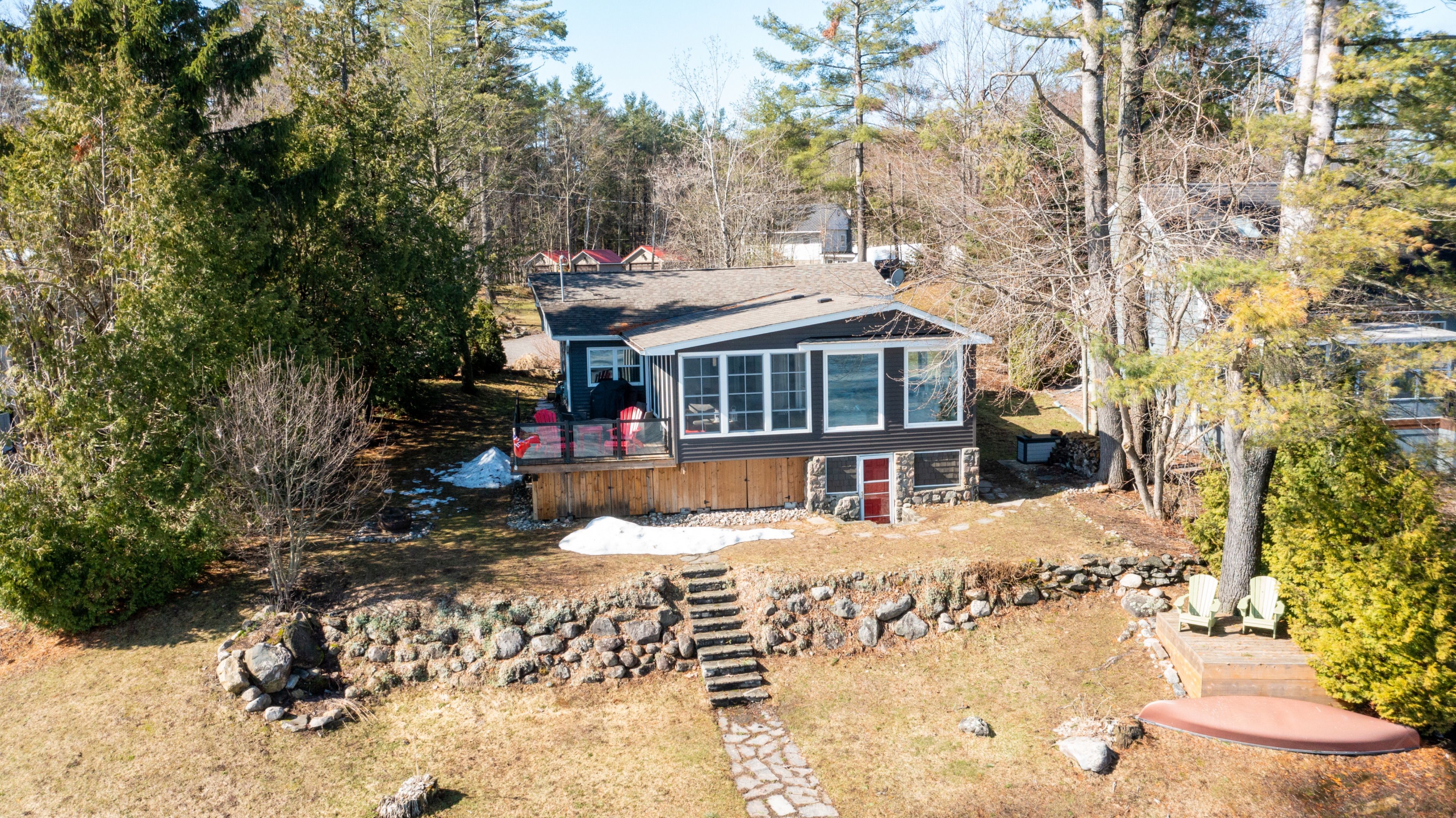 Welcome to this beautifully updated turnkey 1,164 sq ft bungalow cottage on Gull Lake, offering 75 ft of clean, sandy north-east shoreline and stunning lake views. Perfectly positioned to capture the morning sun, this 3-bedroom, 1-bathroom cottage blends classic Muskoka charm with modern updates. Inside, the bright open-concept kitchen, dining, and living room feature large windows that fill the space with natural light and showcase picturesque lake views. The kitchen offers ample cabinet space and island seating, perfect for entertaining or casual family meals. Just off the main living area is the inviting Muskoka room with wood ceilings and large windows, providing a beautiful place to relax while enjoying peaceful waterfront scenery. The cottage layout includes two bedrooms at the back and a primary bedroom at the front featuring views of Gull Lake, along with a 3-piece bathroom. A newly renovated laundry room features extensive built-in cabinetry and functions well as a walk-in pantry and storage area. Step outside to a large deck with glass railings off the Muskoka room, leading to new steps down to the water and a spacious dock with pergola, ideal for swimming, boating, and relaxing at the lake. The property offers a long driveway with plenty of parking and a spacious shed. A charming bunkie with wood walls and ceilings, power, and a bedroom loft provides great extra sleeping space, and a cool hang out spot for kids and overflow guests. Nearby the sports court provides added entertainment and activity. A strategically positioned outhouse with a composting toilet offers convenience for bathroom breaks. Serviced by municipal water, natural gas, and septic, the cottage offers year-round convenience. Located less than 3 minutes to town and amenities, and close to a beautiful park with tennis courts, baseball diamond, playground, beach, and volleyball court, this property offers the perfect balance of peaceful waterfront living and convenience.