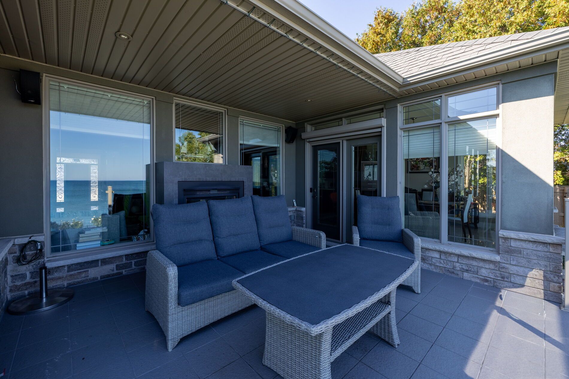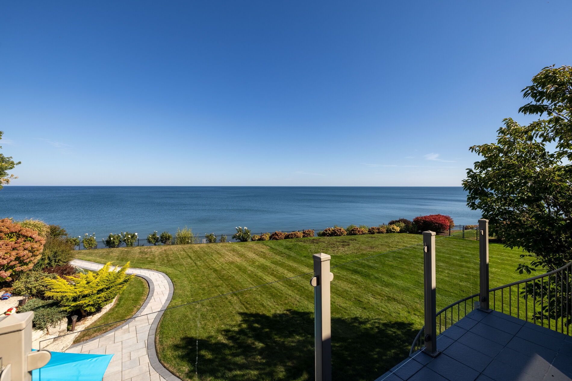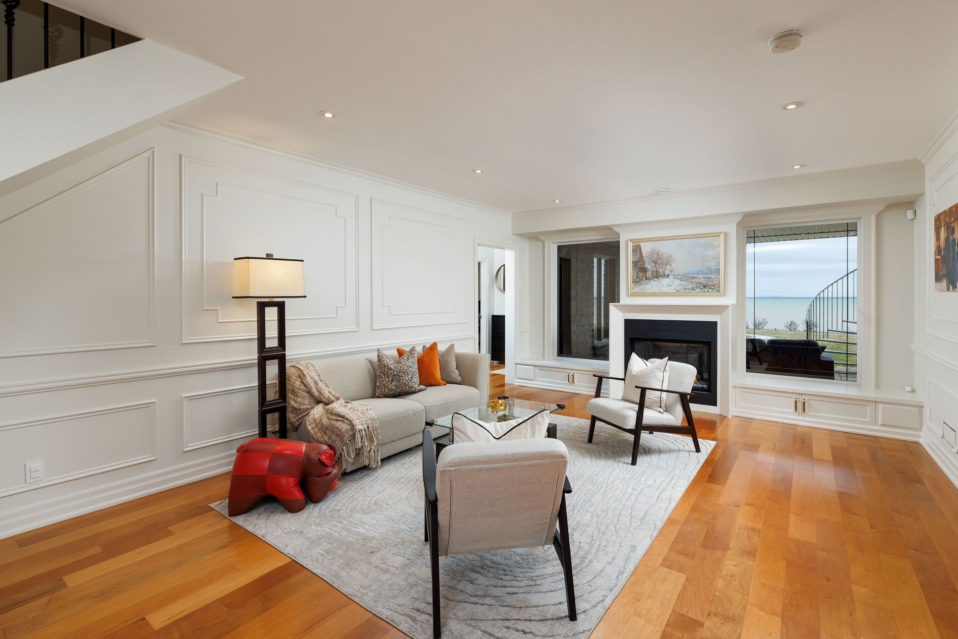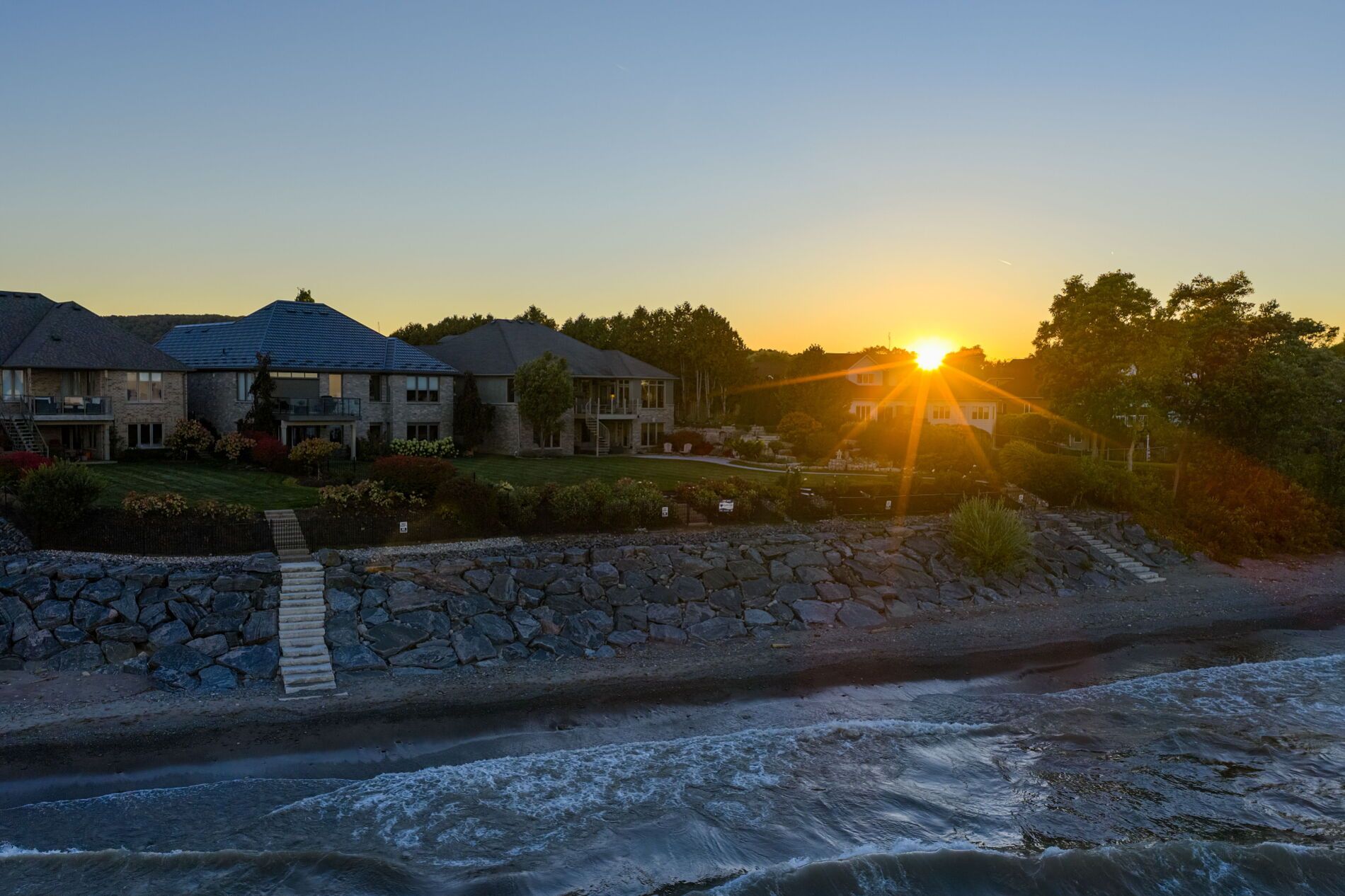 An upscale lakeside lifestyle awaits in Lakeland Landing, an exclusive detached bungalow condominium community in Grimsby on the shores of Lake Ontario. Siding onto a grove of trees, this stunning 4-bedroom residence with a beautifully finished walkout basement is one of only four estates with direct beach access. Enjoy nearby waterfront parks, the Grimsby Waterfront Trail, Forty Mile Creek Park, Foran's Marina, the shops and restaurants of Grimsby on the Lake, and wineries and fine dining minutes away with easy QEW access at the gateway to Ontario's Wine Country. Outstanding curb appeal and magnificent professional landscaping with a cobblestone driveway accommodating 6 cars, extensive use of armour stone, and the backyard is a private lakeside retreat with two terraces designed to capture sweeping water views. Custom-built by DeHaan Homes, the home showcases exceptional craftsmanship with 9 and 10-ft ceilings, engineered hardwood floors, custom millwork, designer lighting, and expansive windows capturing breathtaking lake views. The open-concept main level features functional, elegant living spaces, a great room with a quartzite feature wall, 2-sided gas fireplace and exceptional lake views, a chef's kitchen with upgraded quartz counters, 10' waterfall island with a breakfast bar, and premium appliances, and a dining area with a walkout to a covered terrace with a fireplace, frameless glass railings and a custom wrought iron staircase to the lower terrace. The primary suite offers lake views and a luxurious 5-piece ensuite. The walkout lower level includes a renovated family room with a fireplace, a second kitchen with Thermador appliances, a home theatre, two bedrooms, a 4-piece bath and terrace access. Recent upgrades (2022-2025) include renovated living spaces, updated kitchens, EV charger rough-in, electrical upgrades, and security window film.