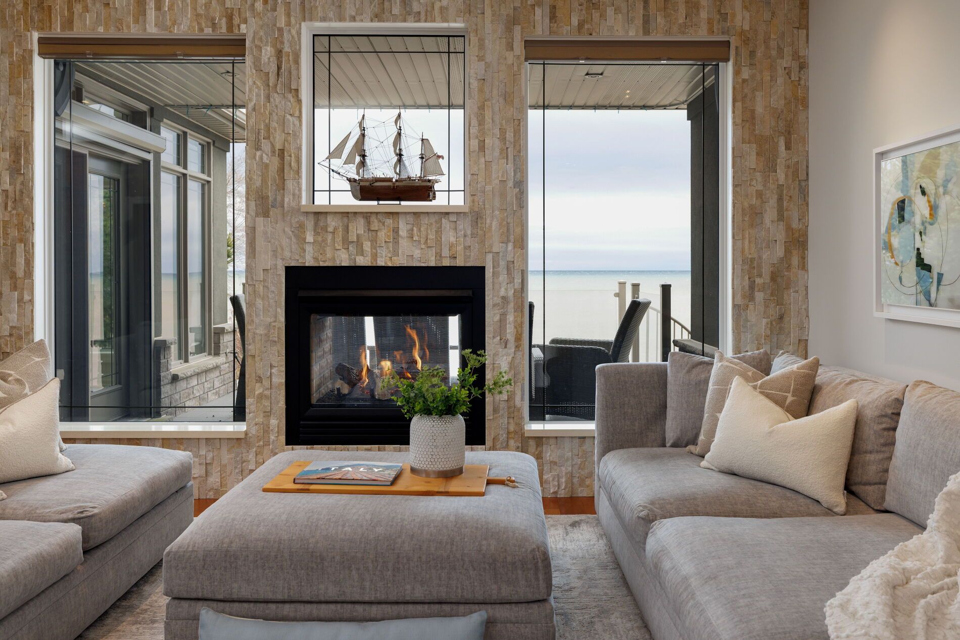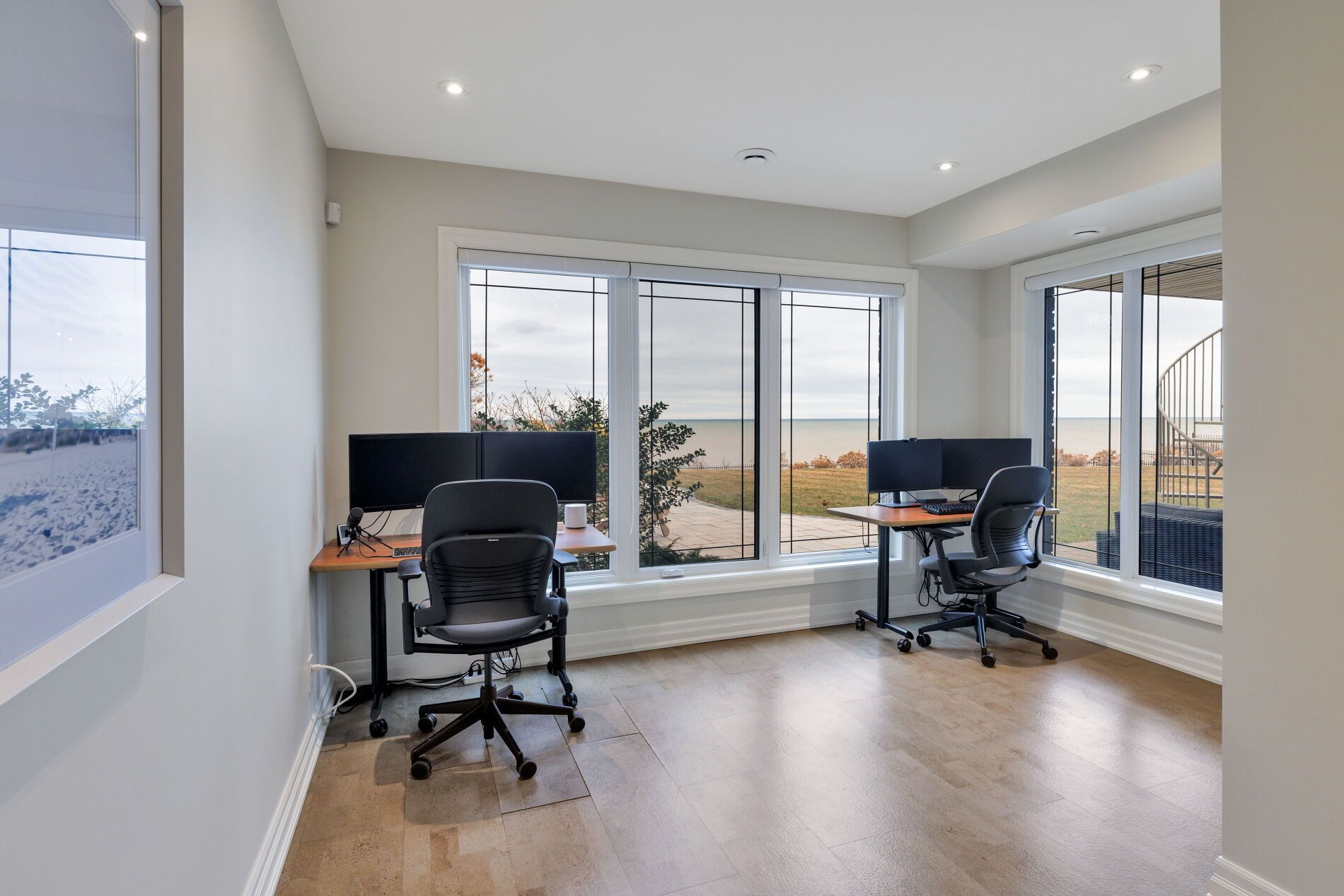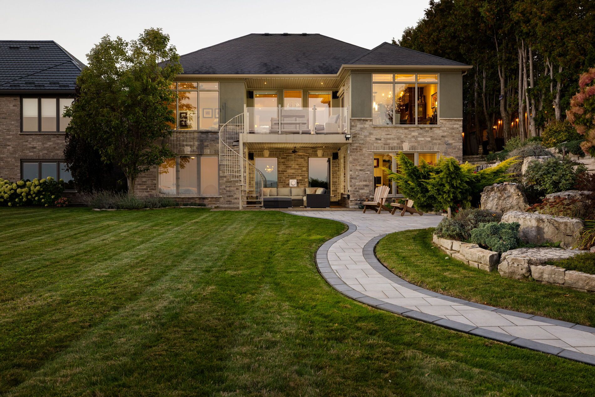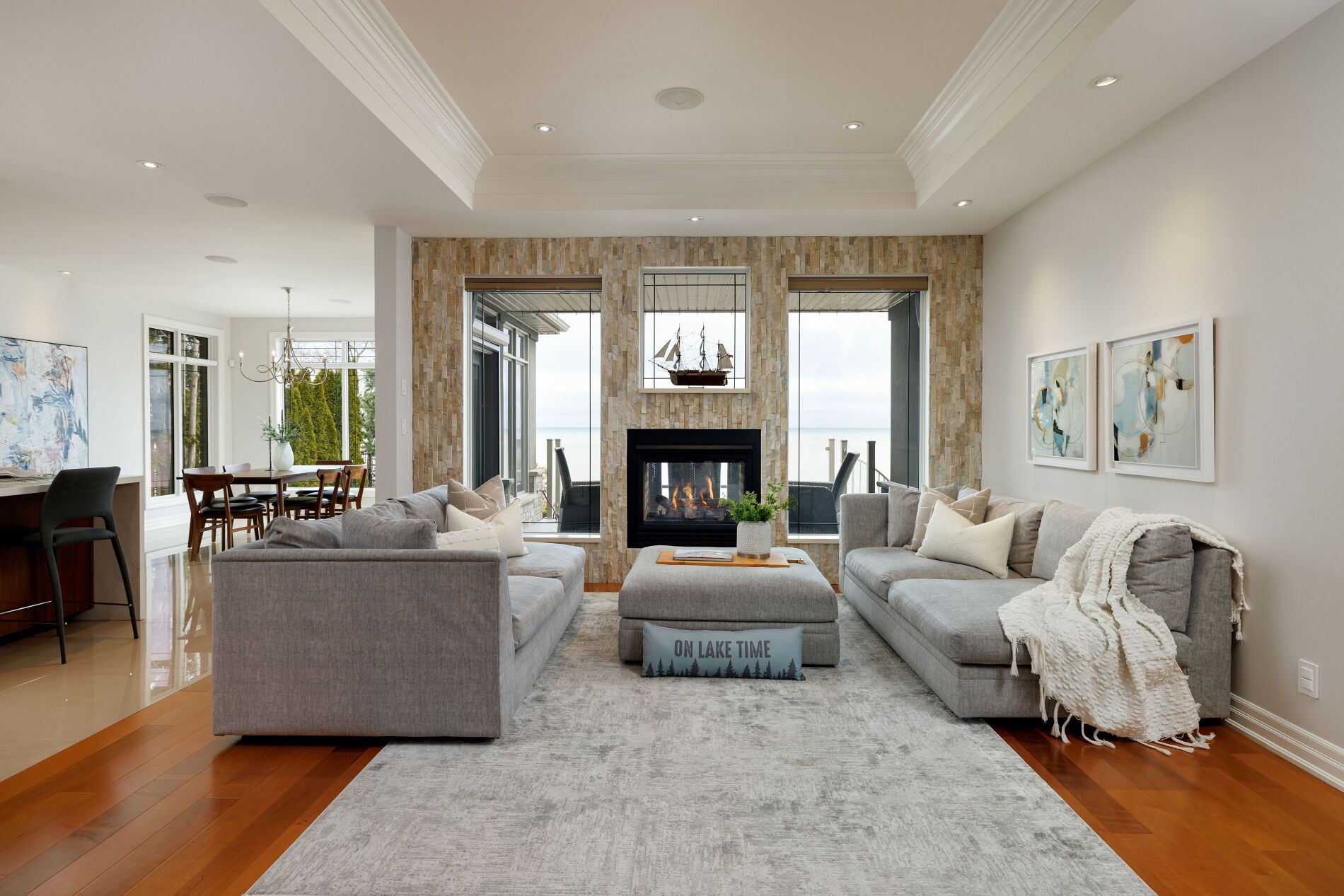 An upscale lakeside lifestyle awaits in Lakeland Landing, an exclusive detached bungalow condominium community in Grimsby on the shores of Lake Ontario. Siding onto a grove of trees, this stunning 4-bedroom residence with a beautifully finished walkout basement is one of only four estates with direct beach access. Enjoy nearby waterfront parks, the Grimsby Waterfront Trail, Forty Mile Creek Park, Foran's Marina, the shops and restaurants of Grimsby on the Lake, and wineries and fine dining minutes away with easy QEW access at the gateway to Ontario's Wine Country. Outstanding curb appeal and magnificent professional landscaping with a cobblestone driveway accommodating 6 cars, extensive use of armour stone, and the backyard is a private lakeside retreat with two terraces designed to capture sweeping water views. Custom-built by DeHaan Homes, the home showcases exceptional craftsmanship with 9 and 10-ft ceilings, engineered hardwood floors, custom millwork, designer lighting, and expansive windows capturing breathtaking lake views. The open-concept main level features functional, elegant living spaces, a great room with a quartzite feature wall, 2-sided gas fireplace and exceptional lake views, a chef's kitchen with upgraded quartz counters, 10' waterfall island with a breakfast bar, and premium appliances, and a dining area with a walkout to a covered terrace with a fireplace, frameless glass railings and a custom wrought iron staircase to the lower terrace. The primary suite offers lake views and a luxurious 5-piece ensuite. The walkout lower level includes a renovated family room with a fireplace, a second kitchen with Thermador appliances, a home theatre, two bedrooms, a 4-piece bath and terrace access. Recent upgrades (2022-2025) include renovated living spaces, updated kitchens, EV charger rough-in, electrical upgrades, and security window film.