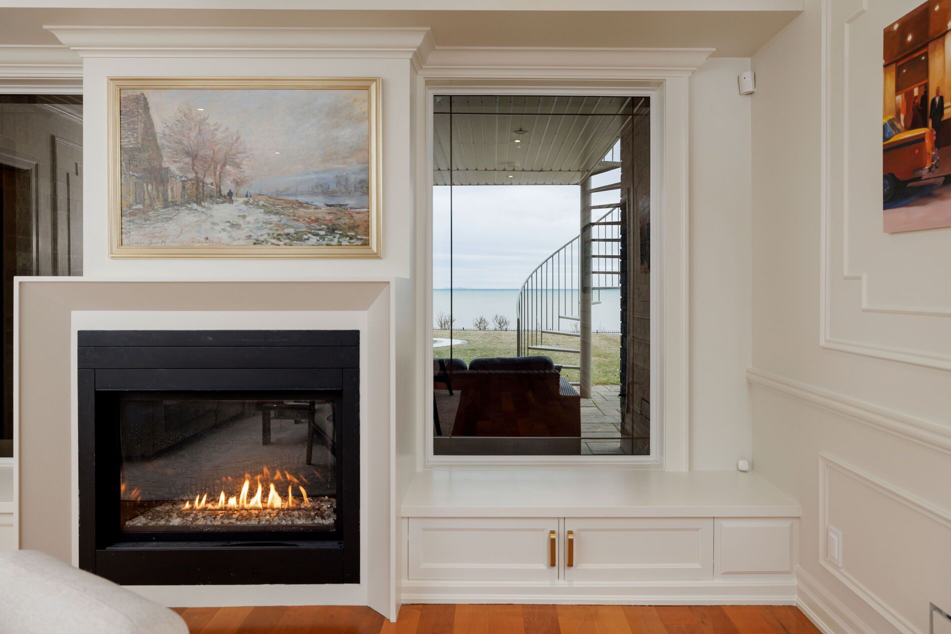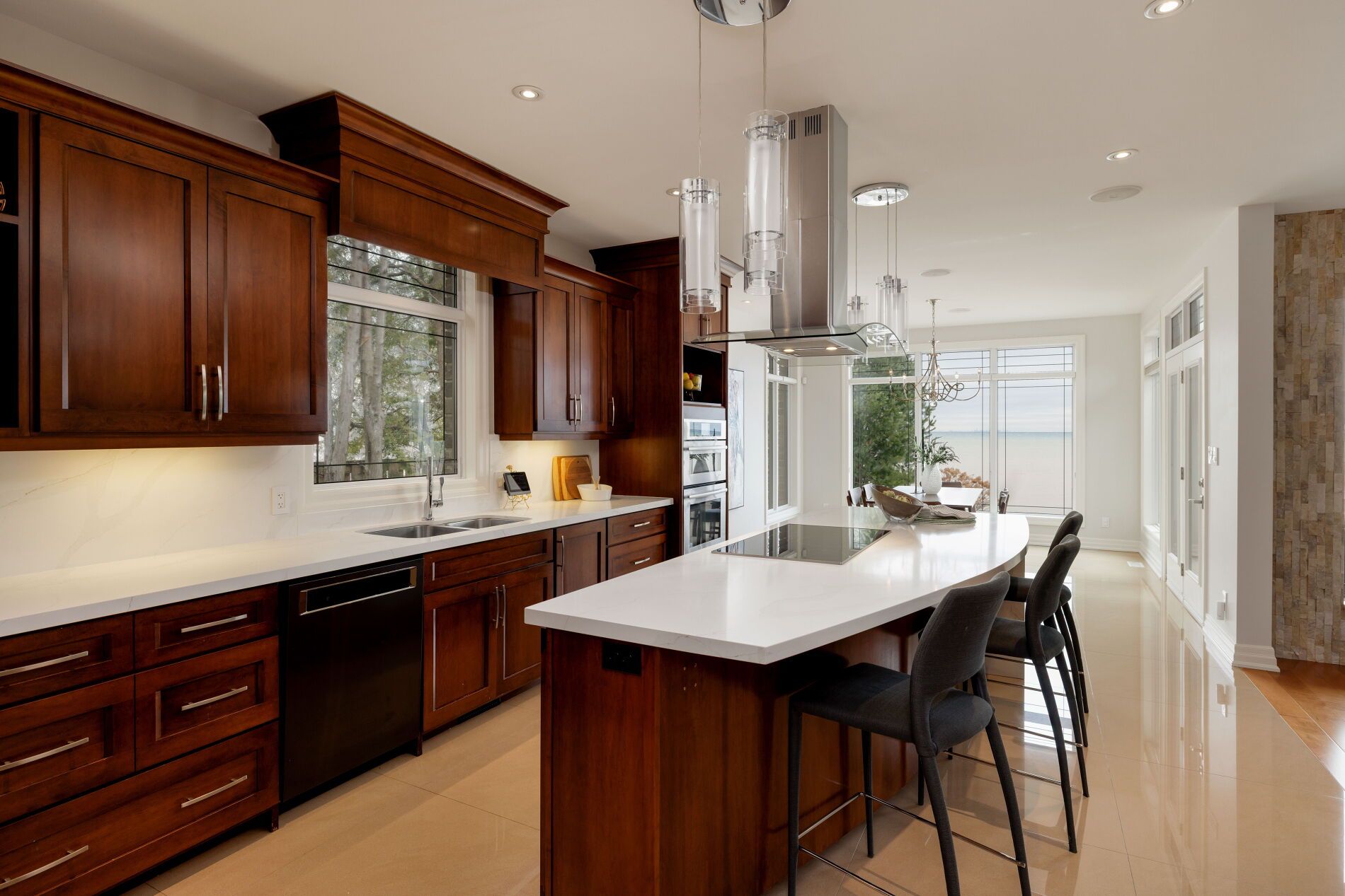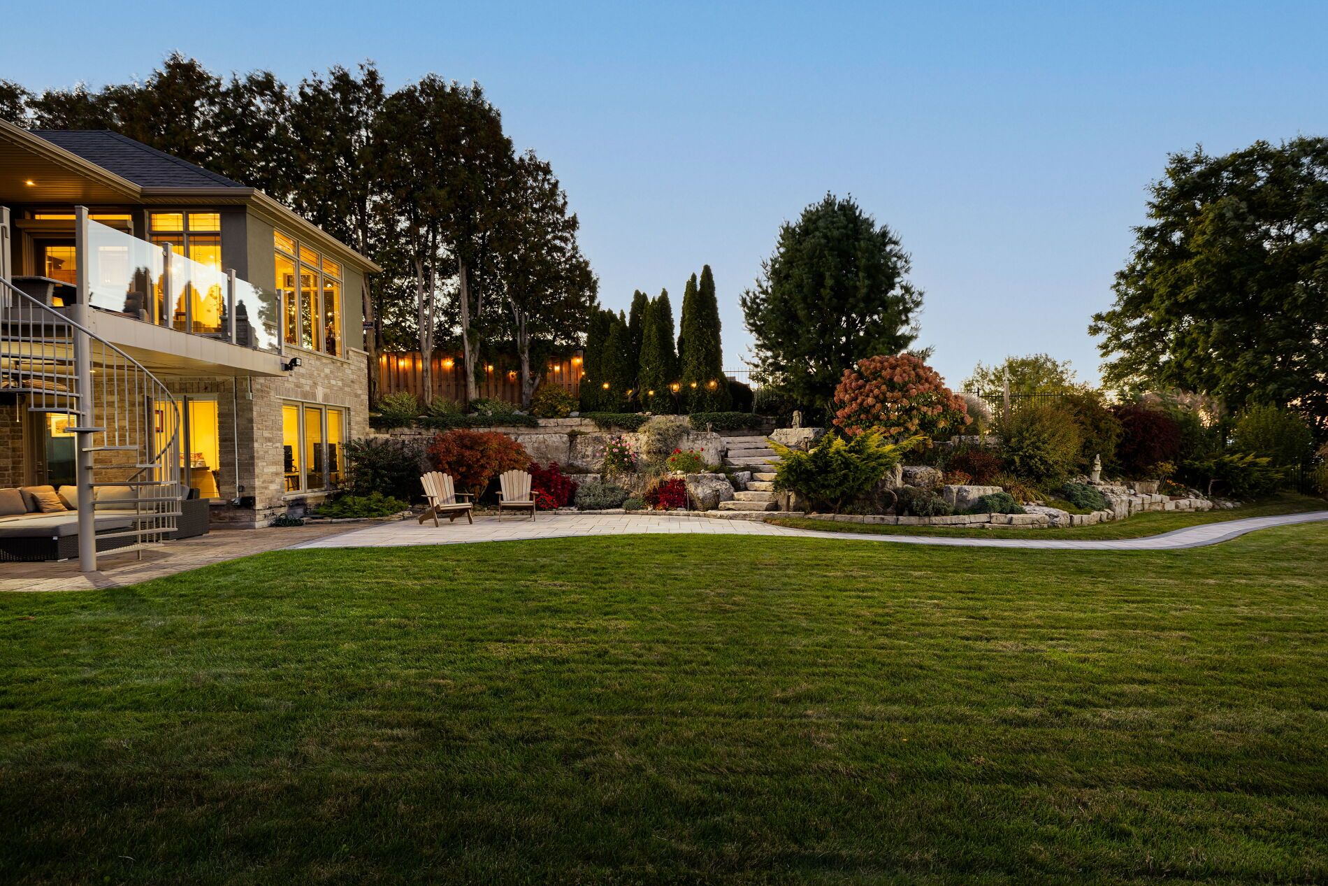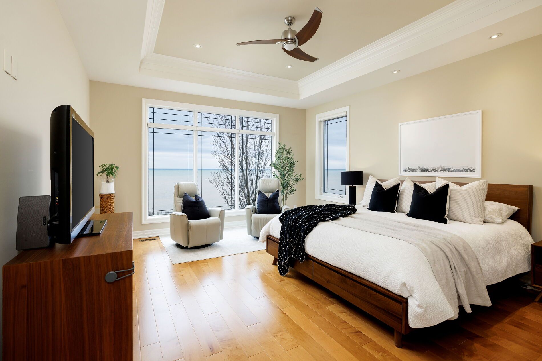 An upscale lakeside lifestyle awaits in Lakeland Landing, an exclusive detached bungalow condominium community in Grimsby on the shores of Lake Ontario. Siding onto a grove of trees, this stunning 4-bedroom residence with a beautifully finished walkout basement is one of only four estates with direct beach access. Enjoy nearby waterfront parks, the Grimsby Waterfront Trail, Forty Mile Creek Park, Foran's Marina, the shops and restaurants of Grimsby on the Lake, and wineries and fine dining minutes away with easy QEW access at the gateway to Ontario's Wine Country. Outstanding curb appeal and magnificent professional landscaping with a cobblestone driveway accommodating 6 cars, extensive use of armour stone, and the backyard is a private lakeside retreat with two terraces designed to capture sweeping water views. Custom-built by DeHaan Homes, the home showcases exceptional craftsmanship with 9 and 10-ft ceilings, engineered hardwood floors, custom millwork, designer lighting, and expansive windows capturing breathtaking lake views. The open-concept main level features functional, elegant living spaces, a great room with a quartzite feature wall, 2-sided gas fireplace and exceptional lake views, a chef's kitchen with upgraded quartz counters, 10' waterfall island with a breakfast bar, and premium appliances, and a dining area with a walkout to a covered terrace with a fireplace, frameless glass railings and a custom wrought iron staircase to the lower terrace. The primary suite offers lake views and a luxurious 5-piece ensuite. The walkout lower level includes a renovated family room with a fireplace, a second kitchen with Thermador appliances, a home theatre, two bedrooms, a 4-piece bath and terrace access. Recent upgrades (2022-2025) include renovated living spaces, updated kitchens, EV charger rough-in, electrical upgrades, and security window film.