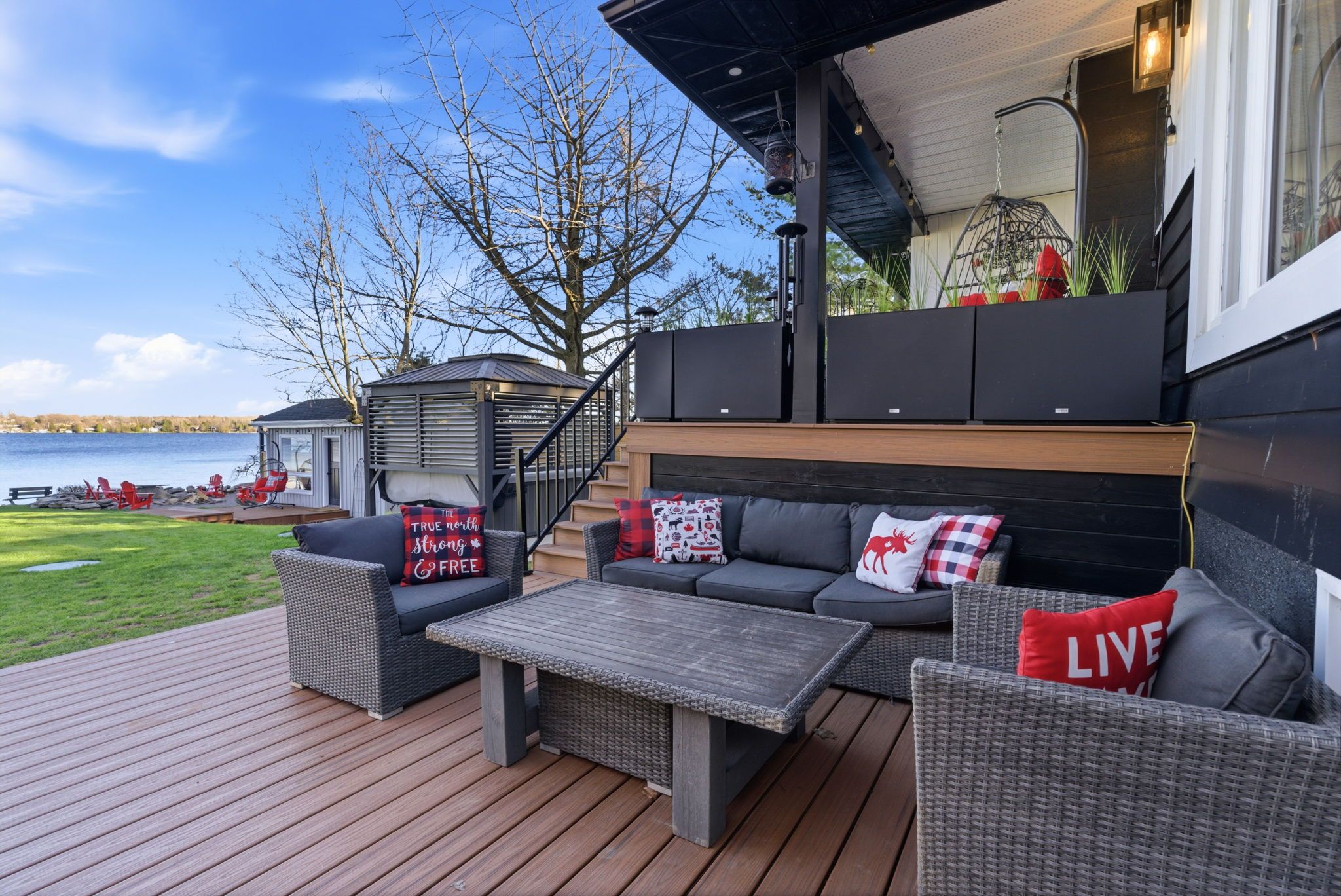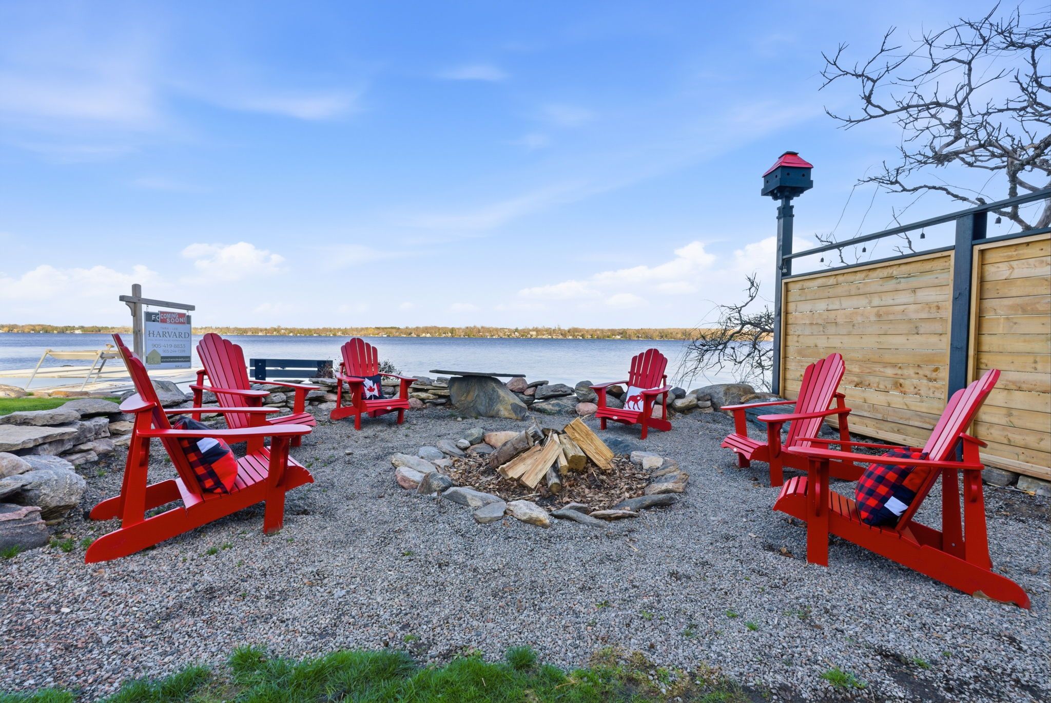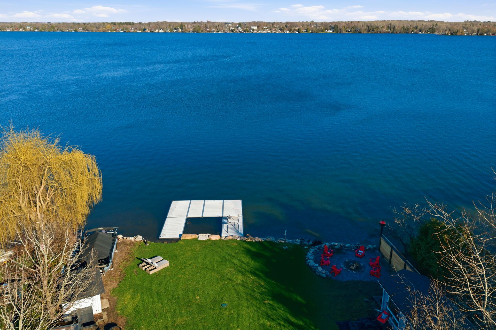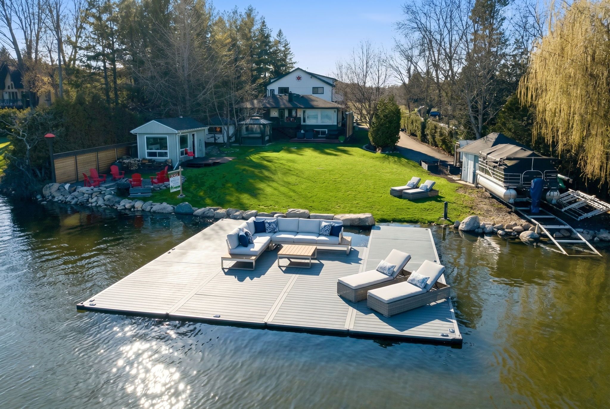 A rare waterfront estate offering uncompromising luxury, privacy, and multi-generational versatility, this fully reimagined residence presents a refined lakeside lifestyle defined by architectural clarity, elevated design, and exceptional south-facing views. Rebuilt in 2023 with over $1M in curated upgrades, the home blends modern sophistication with effortless livability, delivering comfort, scale, and understated elegance. Expansive principal living spaces are anchored by picturesque lake-facing windows that flood the interior with natural light and open to a composite terrace designed for quiet mornings, sunset entertaining, and year-round connection to the water. The kitchen is executed with precision and restraint, featuring quartz surfaces, an oversized island, premium appliances, and bespoke cabinetry integrated into the open-concept layout. Designed for privacy and flexibility, the residence includes a serene upper-level loft retreat with kitchenette, bar, and screened-in terrace, along with a fully finished walk-up lower level offering a second kitchen and generous living space, ideal for extended family or discreet guest accommodation. Outdoors, the property is composed as a private waterfront sanctuary with direct lake access, custom dock, expansive entertaining areas, fire feature, hot tub pavilion, and a newly constructed sauna. An unfinished bunkie with hydro offers future potential for guest accommodation, studio, or additional living space. Behind the aesthetics, the home is supported by dual HVAC systems, dual 200-amp service, new septic (2023), upgraded water filtration, spray foam insulation, and integrated security. The insulated three-car garage and workshop adds a WETT-certified fireplace, EV charging, and dedicated workspace with private bath-crafted for those seeking a true waterfront legacy estate.