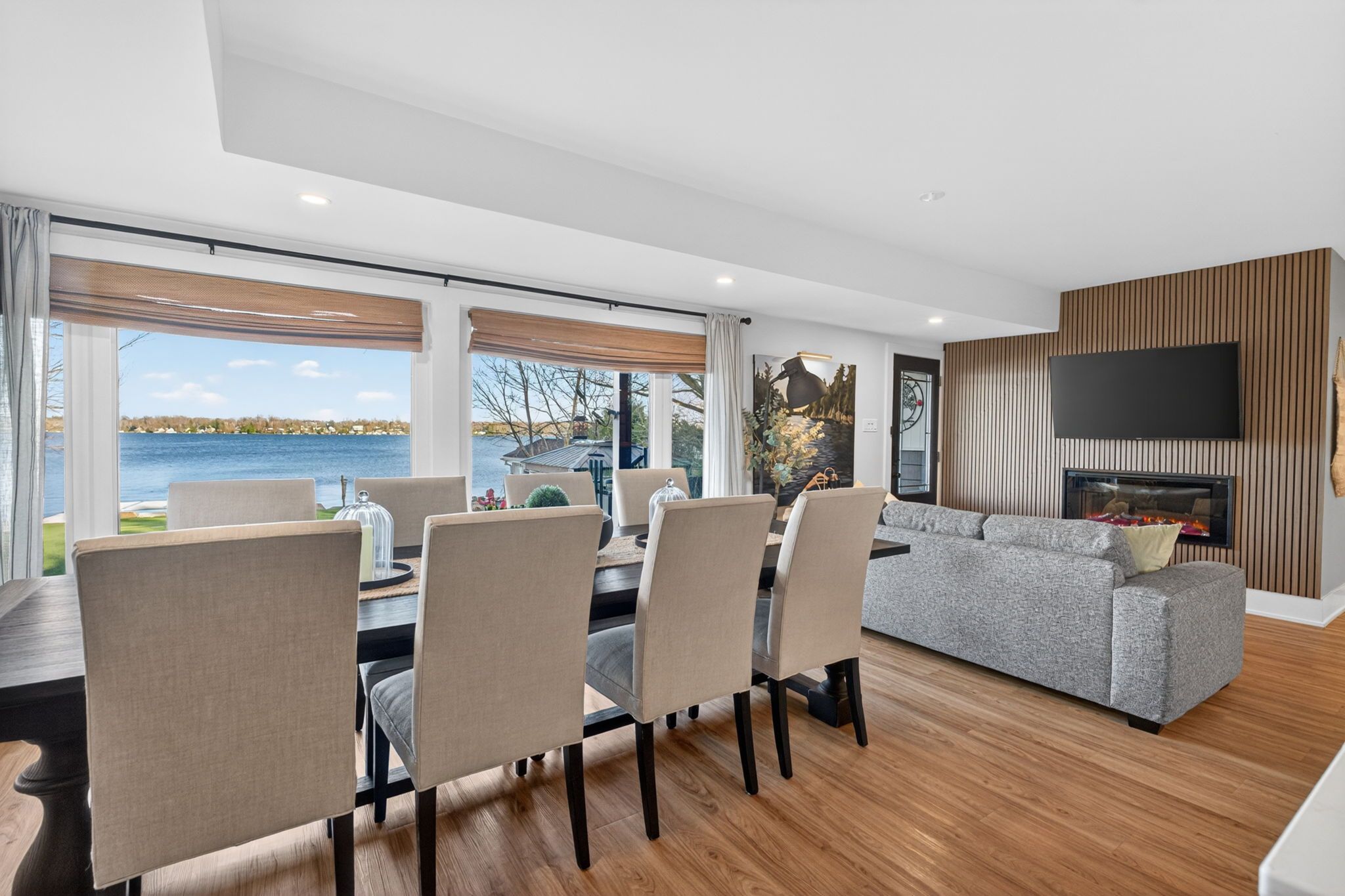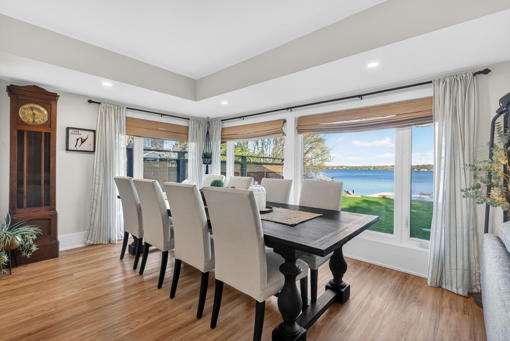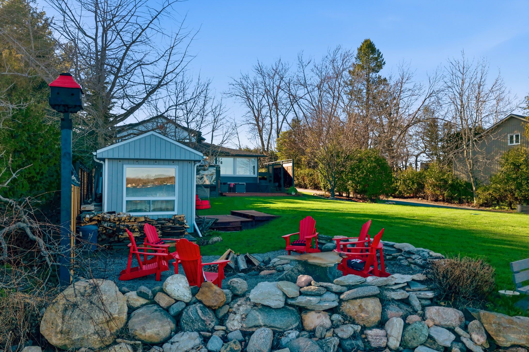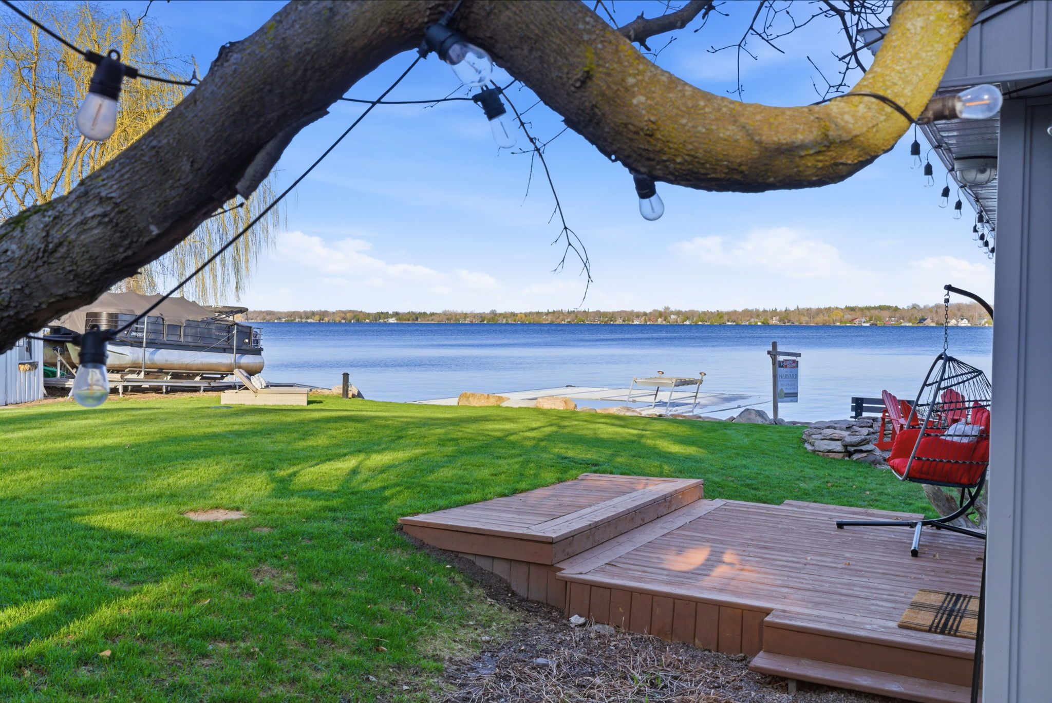 A rare waterfront estate offering uncompromising luxury, privacy, and multi-generational versatility, this fully reimagined residence presents a refined lakeside lifestyle defined by architectural clarity, elevated design, and exceptional south-facing views. Rebuilt in 2023 with over $1M in curated upgrades, the home blends modern sophistication with effortless livability, delivering comfort, scale, and understated elegance. Expansive principal living spaces are anchored by picturesque lake-facing windows that flood the interior with natural light and open to a composite terrace designed for quiet mornings, sunset entertaining, and year-round connection to the water. The kitchen is executed with precision and restraint, featuring quartz surfaces, an oversized island, premium appliances, and bespoke cabinetry integrated into the open-concept layout. Designed for privacy and flexibility, the residence includes a serene upper-level loft retreat with kitchenette, bar, and screened-in terrace, along with a fully finished walk-up lower level offering a second kitchen and generous living space, ideal for extended family or discreet guest accommodation. Outdoors, the property is composed as a private waterfront sanctuary with direct lake access, custom dock, expansive entertaining areas, fire feature, hot tub pavilion, and a newly constructed sauna. An unfinished bunkie with hydro offers future potential for guest accommodation, studio, or additional living space. Behind the aesthetics, the home is supported by dual HVAC systems, dual 200-amp service, new septic (2023), upgraded water filtration, spray foam insulation, and integrated security. The insulated three-car garage and workshop adds a WETT-certified fireplace, EV charging, and dedicated workspace with private bath-crafted for those seeking a true waterfront legacy estate.