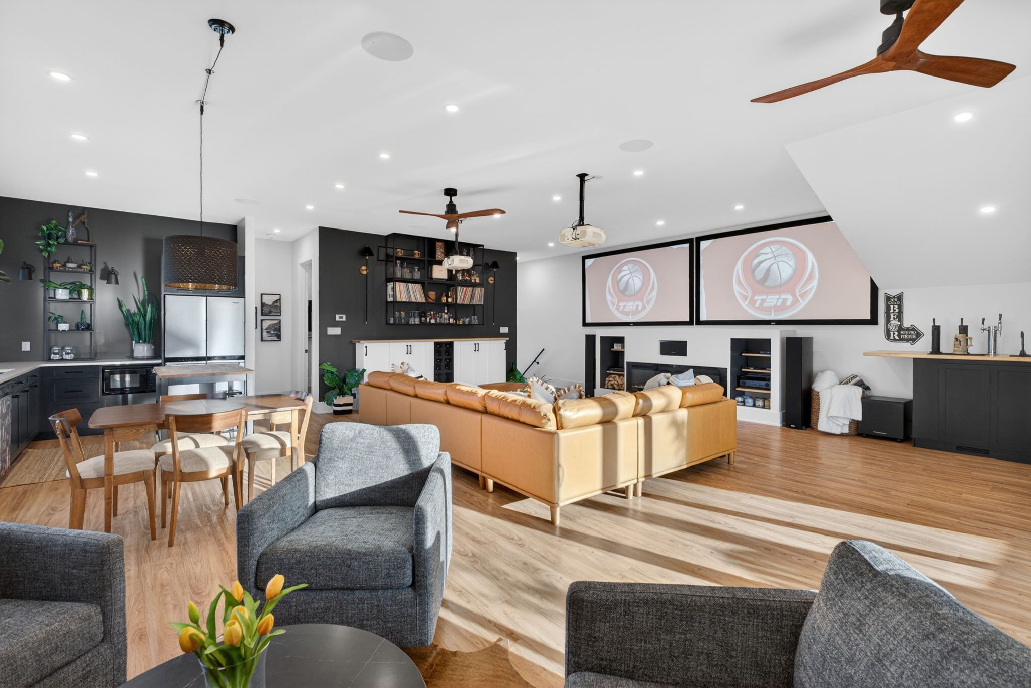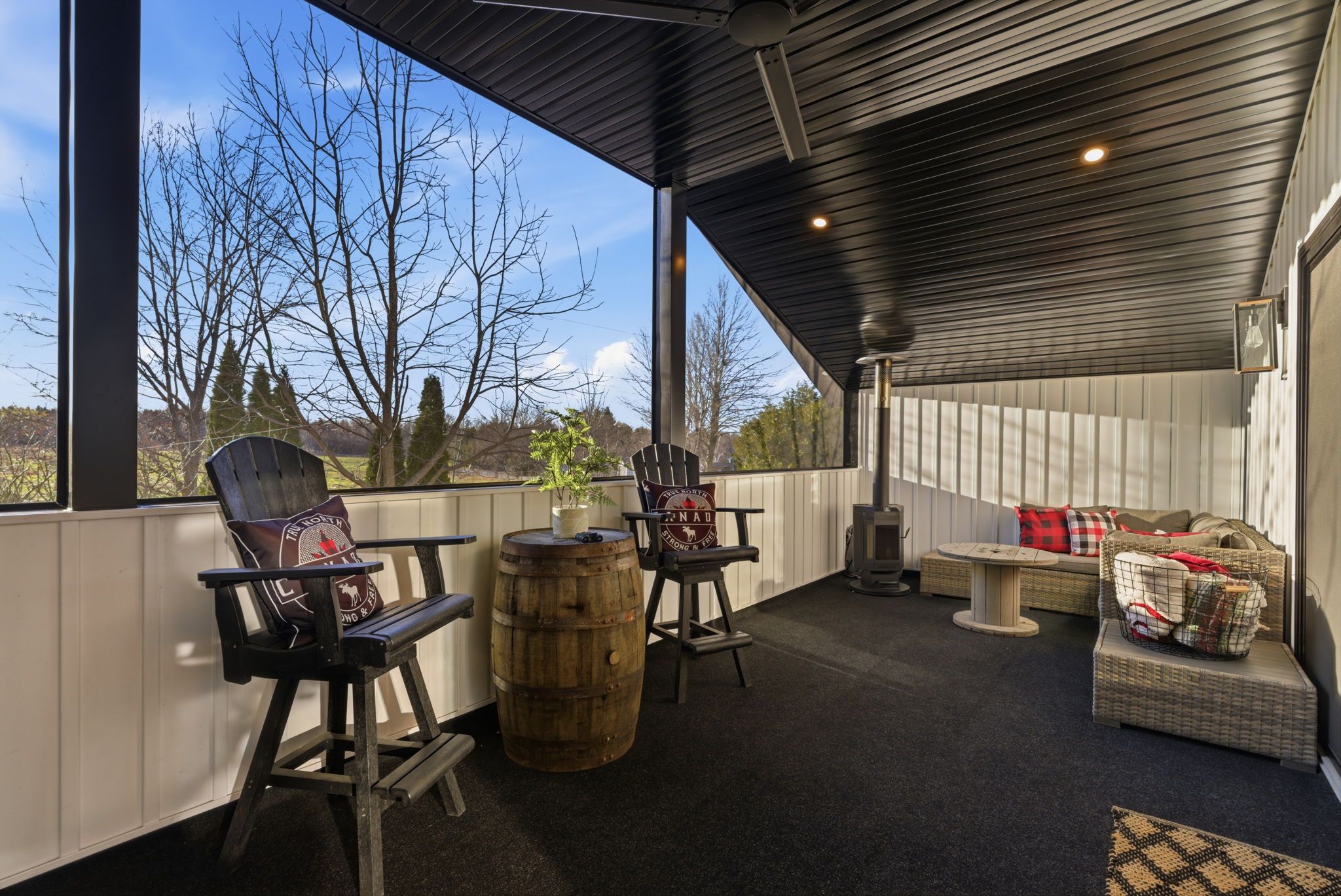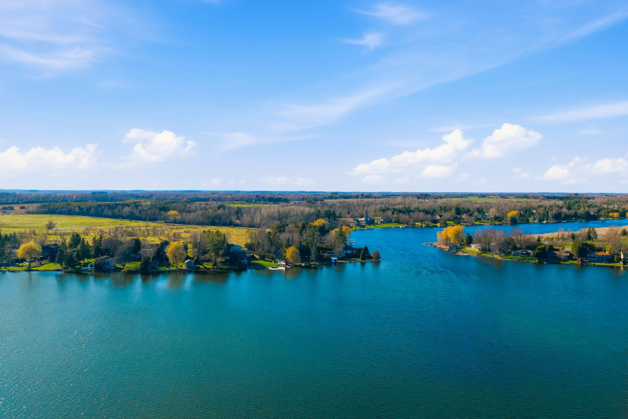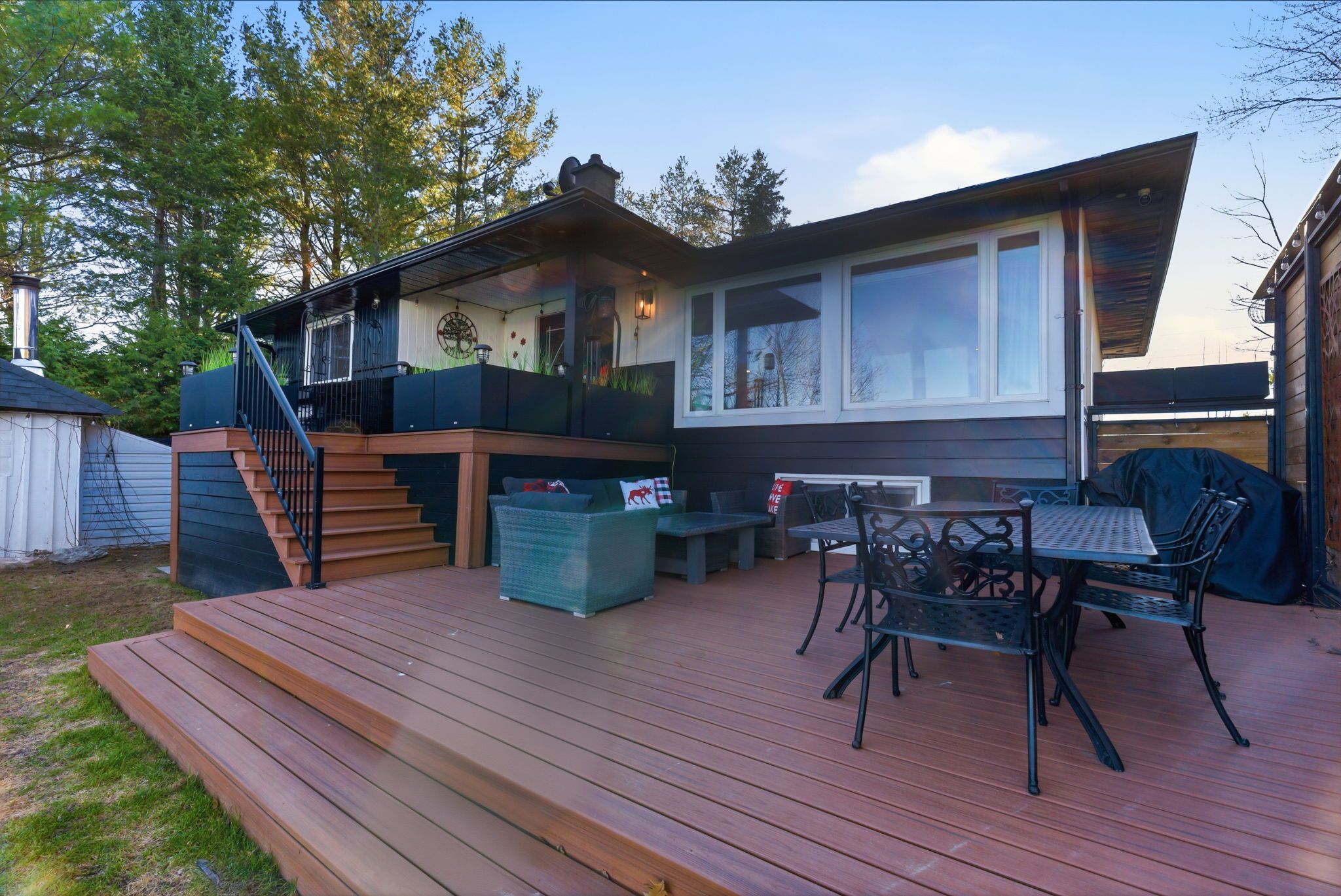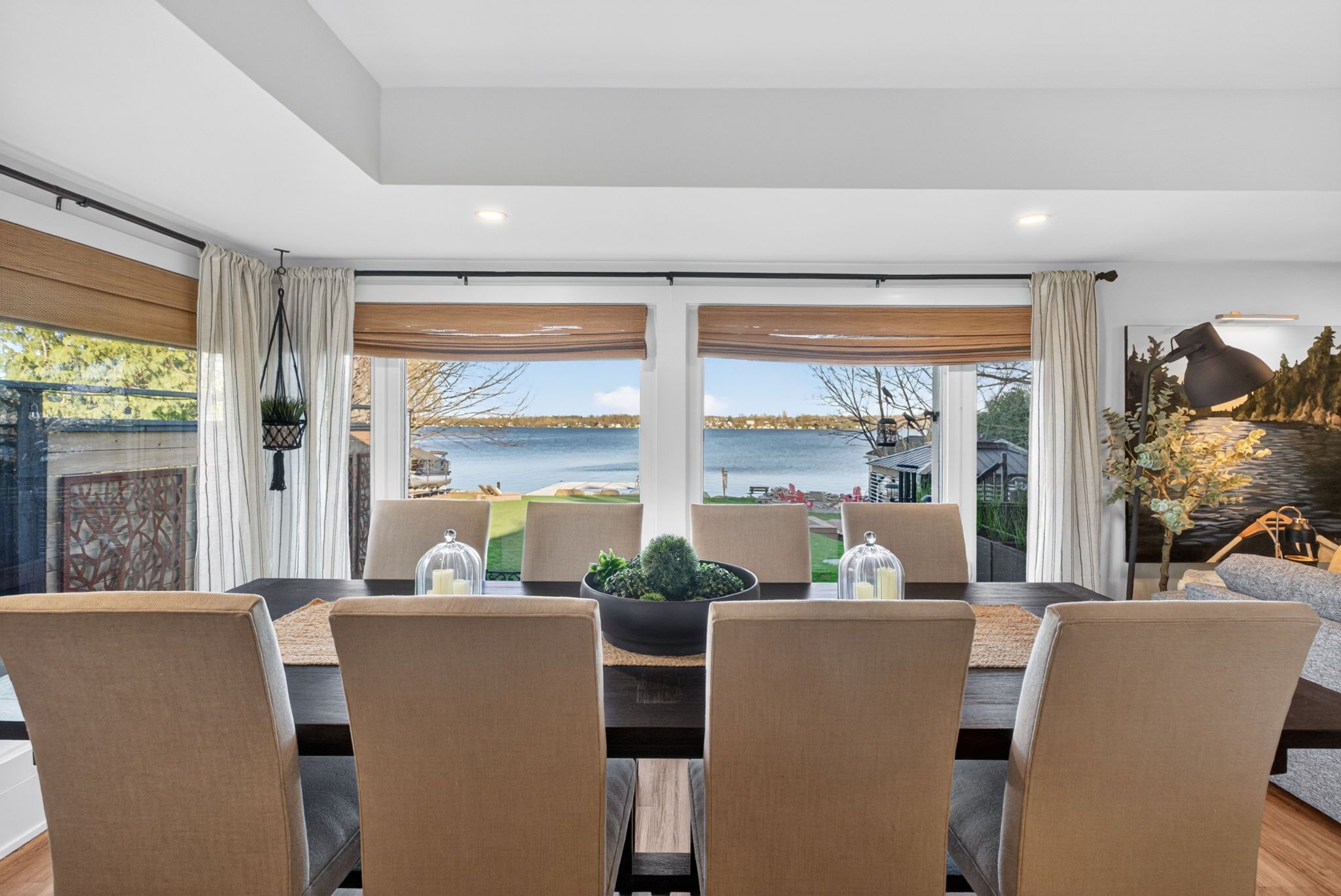 A rare waterfront estate offering uncompromising luxury, privacy, and multi-generational versatility, this fully reimagined residence presents a refined lakeside lifestyle defined by architectural clarity, elevated design, and exceptional south-facing views. Rebuilt in 2023 with over $1M in curated upgrades, the home blends modern sophistication with effortless livability, delivering comfort, scale, and understated elegance. Expansive principal living spaces are anchored by picturesque lake-facing windows that flood the interior with natural light and open to a composite terrace designed for quiet mornings, sunset entertaining, and year-round connection to the water. The kitchen is executed with precision and restraint, featuring quartz surfaces, an oversized island, premium appliances, and bespoke cabinetry integrated into the open-concept layout. Designed for privacy and flexibility, the residence includes a serene upper-level loft retreat with kitchenette, bar, and screened-in terrace, along with a fully finished walk-up lower level offering a second kitchen and generous living space, ideal for extended family or discreet guest accommodation. Outdoors, the property is composed as a private waterfront sanctuary with direct lake access, custom dock, expansive entertaining areas, fire feature, hot tub pavilion, and a newly constructed sauna. An unfinished bunkie with hydro offers future potential for guest accommodation, studio, or additional living space. Behind the aesthetics, the home is supported by dual HVAC systems, dual 200-amp service, new septic (2023), upgraded water filtration, spray foam insulation, and integrated security. The insulated three-car garage and workshop adds a WETT-certified fireplace, EV charging, and dedicated workspace with private bath-crafted for those seeking a true waterfront legacy estate.