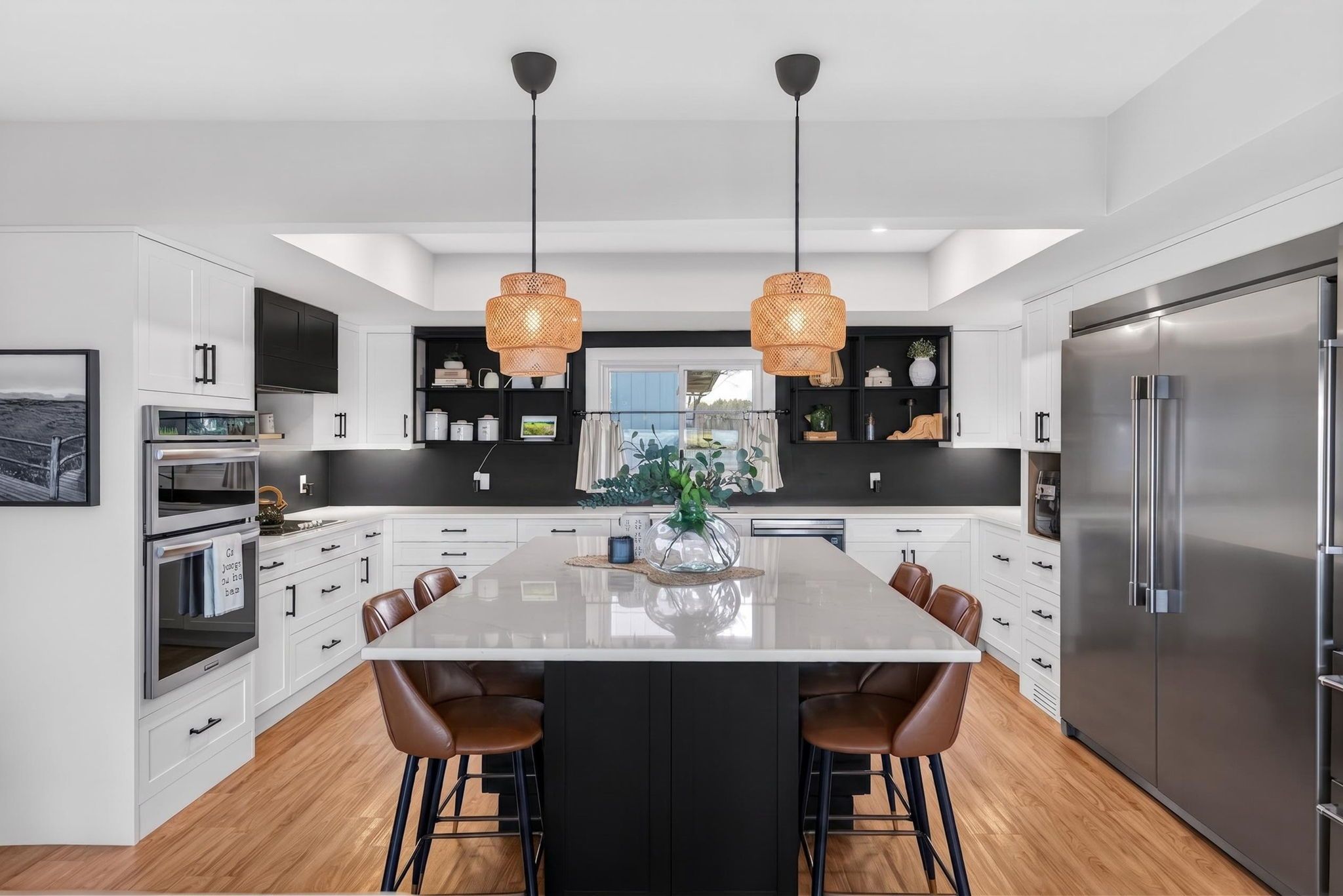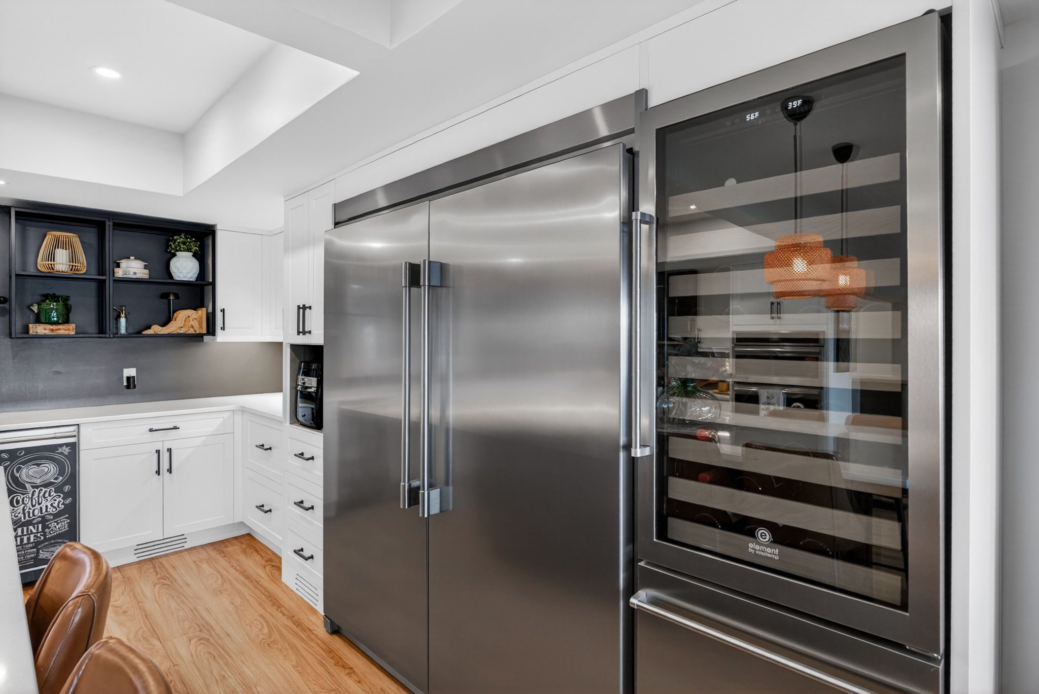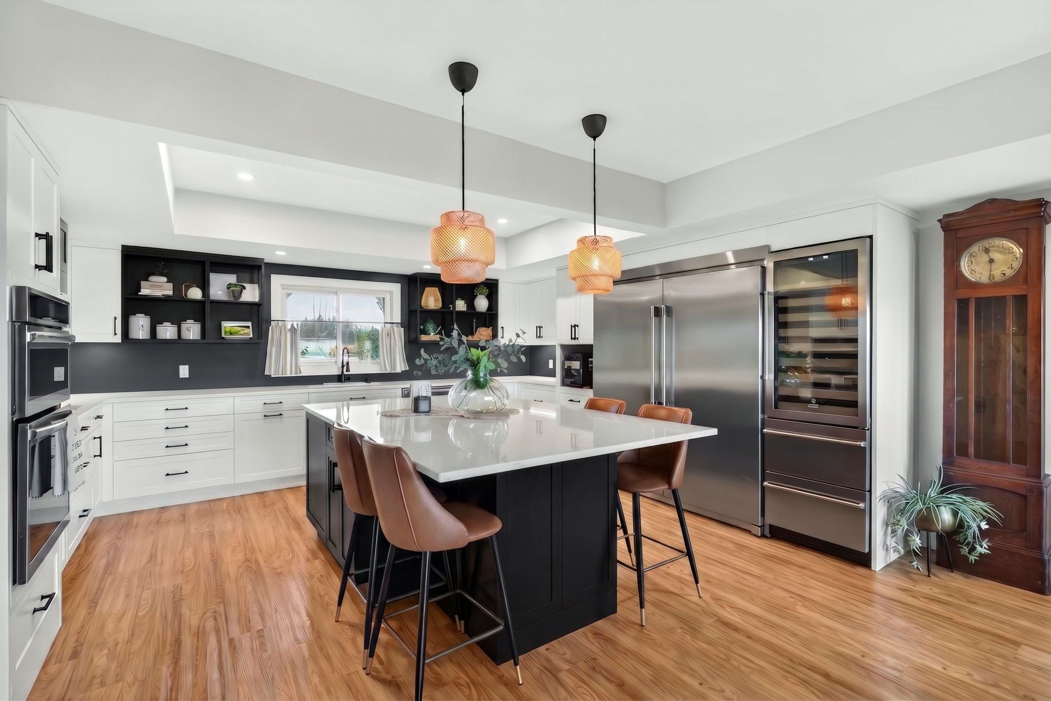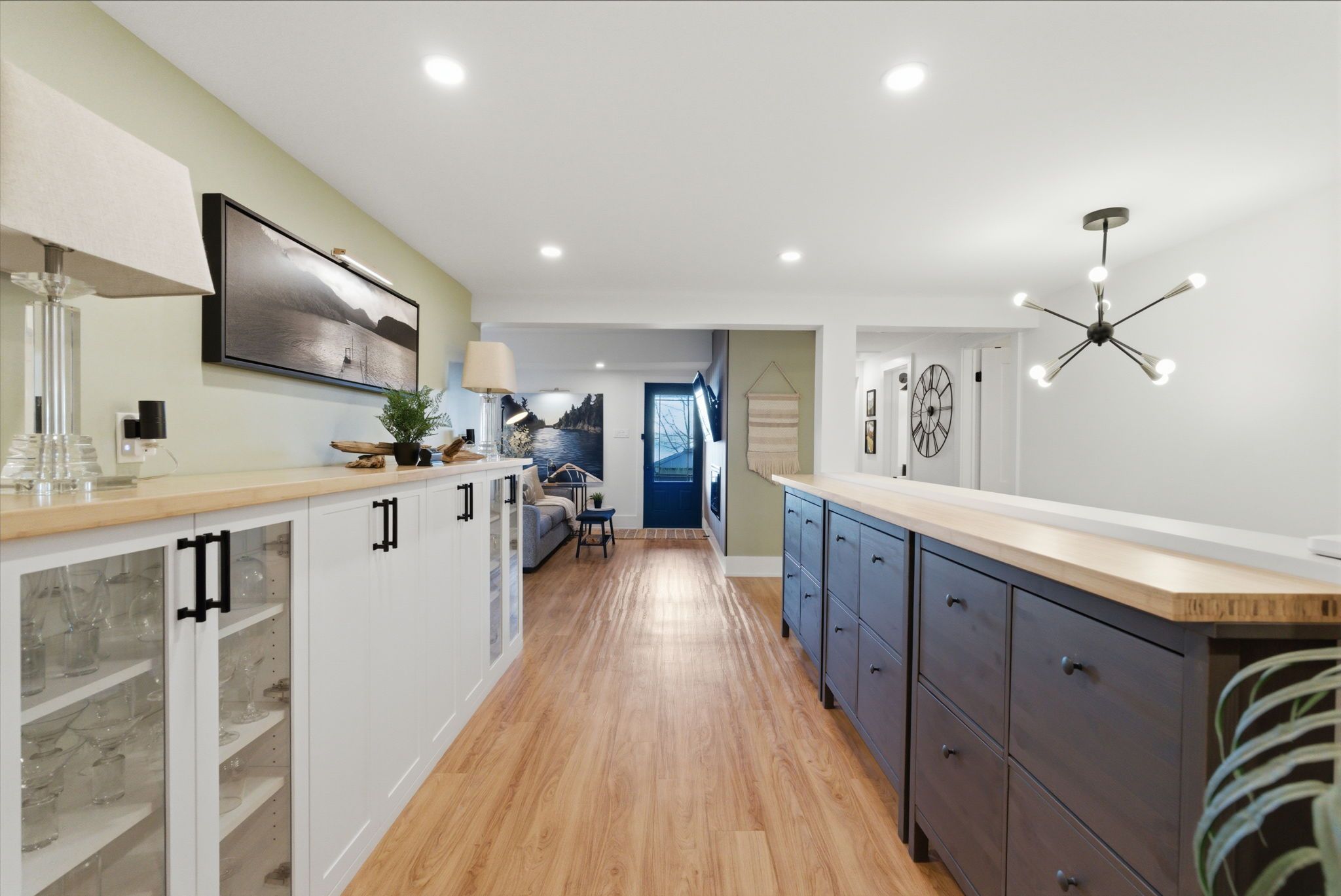 A rare waterfront estate offering uncompromising luxury, privacy, and multi-generational versatility, this fully reimagined residence presents a refined lakeside lifestyle defined by architectural clarity, elevated design, and exceptional south-facing views. Rebuilt in 2023 with over $1M in curated upgrades, the home blends modern sophistication with effortless livability, delivering comfort, scale, and understated elegance. Expansive principal living spaces are anchored by picturesque lake-facing windows that flood the interior with natural light and open to a composite terrace designed for quiet mornings, sunset entertaining, and year-round connection to the water. The kitchen is executed with precision and restraint, featuring quartz surfaces, an oversized island, premium appliances, and bespoke cabinetry integrated into the open-concept layout. Designed for privacy and flexibility, the residence includes a serene upper-level loft retreat with kitchenette, bar, and screened-in terrace, along with a fully finished walk-up lower level offering a second kitchen and generous living space, ideal for extended family or discreet guest accommodation. Outdoors, the property is composed as a private waterfront sanctuary with direct lake access, custom dock, expansive entertaining areas, fire feature, hot tub pavilion, and a newly constructed sauna. An unfinished bunkie with hydro offers future potential for guest accommodation, studio, or additional living space. Behind the aesthetics, the home is supported by dual HVAC systems, dual 200-amp service, new septic (2023), upgraded water filtration, spray foam insulation, and integrated security. The insulated three-car garage and workshop adds a WETT-certified fireplace, EV charging, and dedicated workspace with private bath-crafted for those seeking a true waterfront legacy estate.