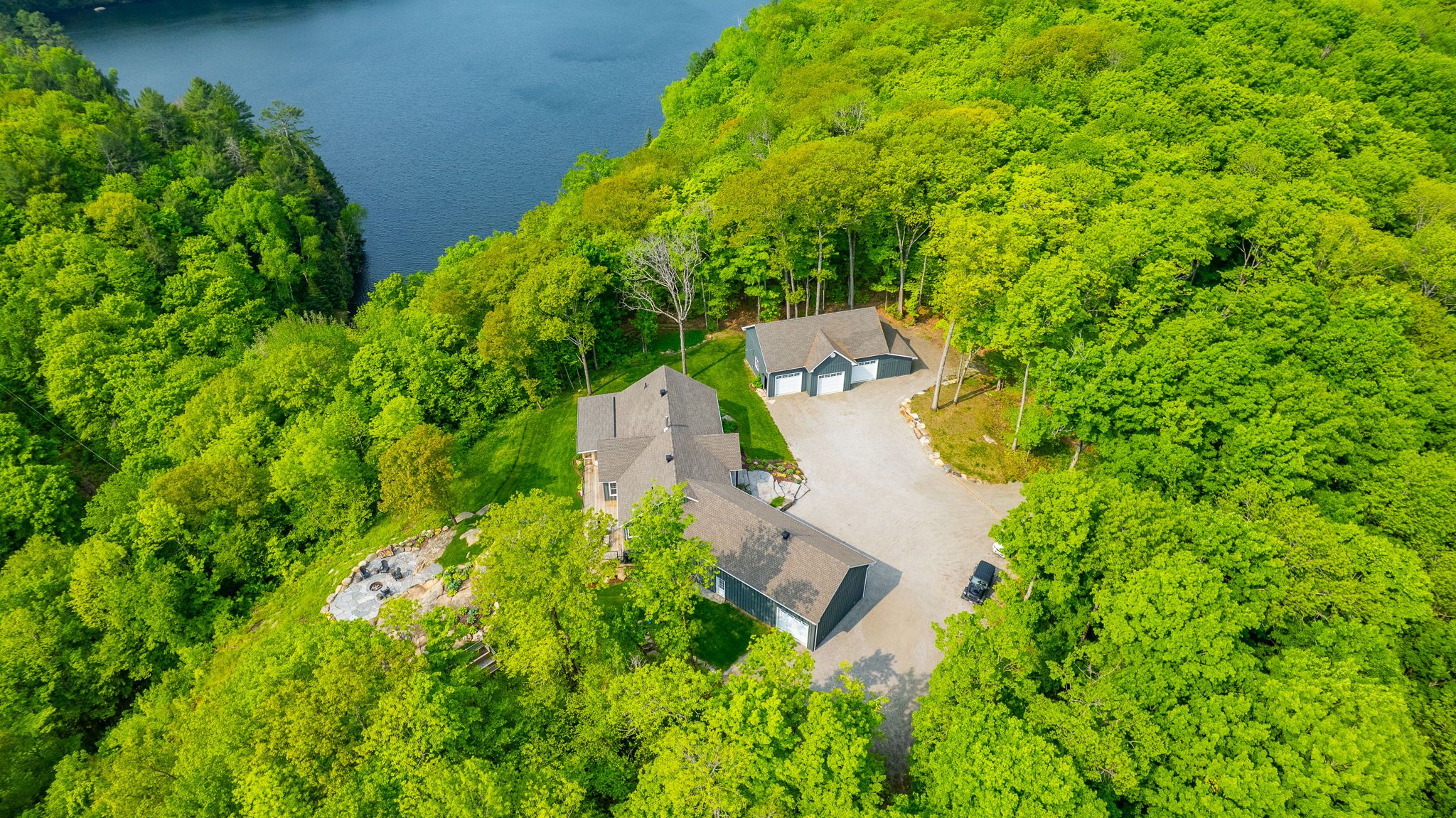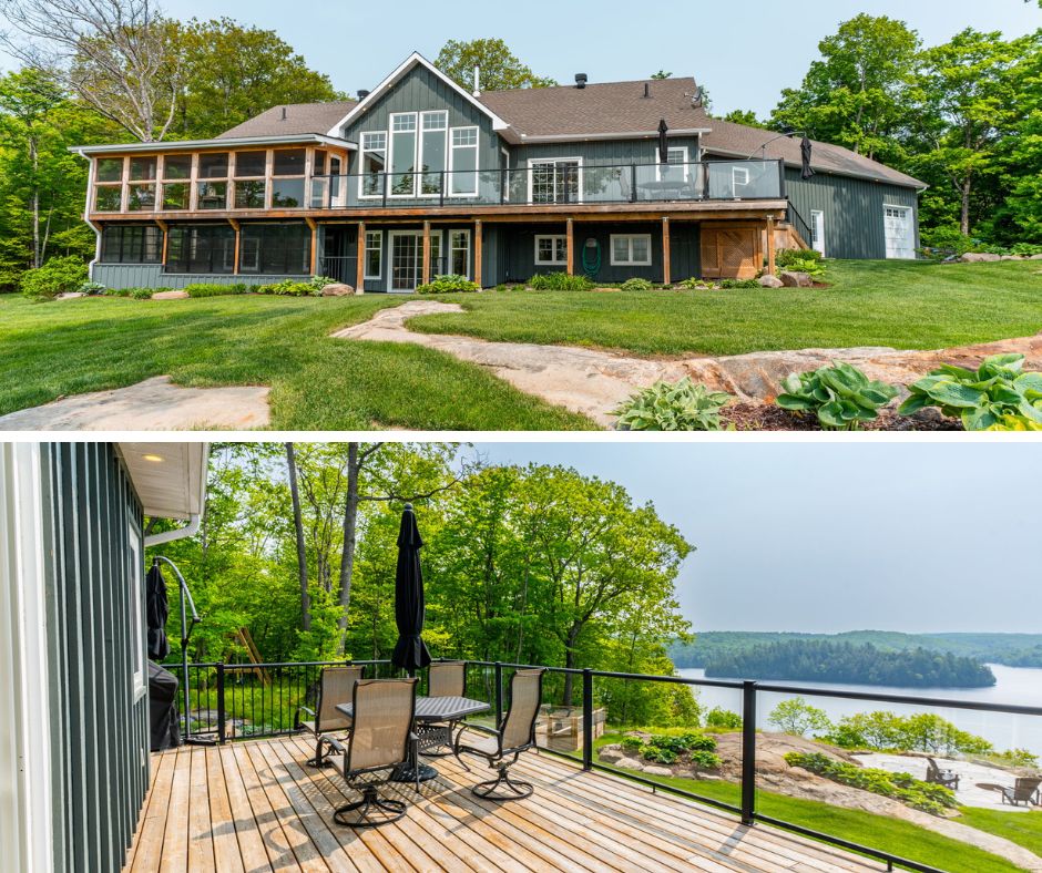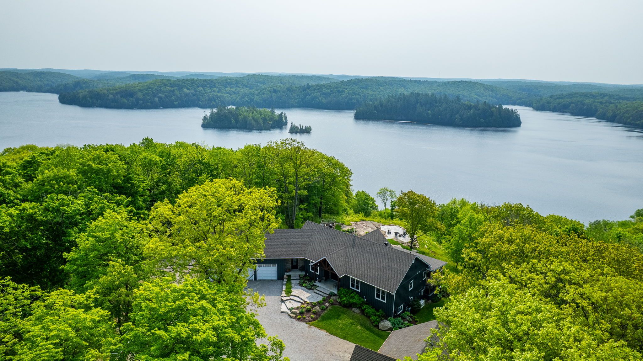 Nestled on 54 sprawling acres along the private shores of Loon Lake, this meticulously maintained estate offers an unparalleled blend of luxury and wilderness. With 800 feet of deep waterfront and over 5,000 square feet of refined living space, the property is a masterpiece of design and privacy. The journey begins at the timber-frame porch, leading into a grand Great Room where a floor-to-ceiling dry-stack stone fireplace and expansive windows invite breathtaking panoramic views indoors. The heart of the home flows seamlessly to an 850-square-foot glass-railed deck, perfect for watching the sunrise over a tranquil horizon. The kitchen is a chef's delight, featuring stainless steel appliances and soft-close cabinetry, while the main-floor primary suite serves as a true sanctuary with heated ensuite floors and direct access to a screened-in Haliburton Room.The home's versatility continues on the lower level, a walk-out space equipped with two additional bedrooms, a second kitchen, a games room, and a cozy living area. This level opens to a dedicated hot tub room, where stone flooring and stacking windows blur the line between indoor comfort and the natural beauty outside. Beyond the main residence, the property is designed for the ultimate hobbyist, featuring a heated triple garage with a drive-through bay and a separate 1,800-square-foot heated workshop. Modern essentials like a full-property generator, 200-amp service, and wide, accessible hallways ensure peace of mind. Outside, the landscape is dotted with perennial gardens, dry-stack stone walls, and a natural granite firepit. Whether you are hunting in your own backyard, exploring nearby snowmobile trails, or taking a short ATV ride down to the deep-water dock, this estate represents the gold standard of lakeside living.