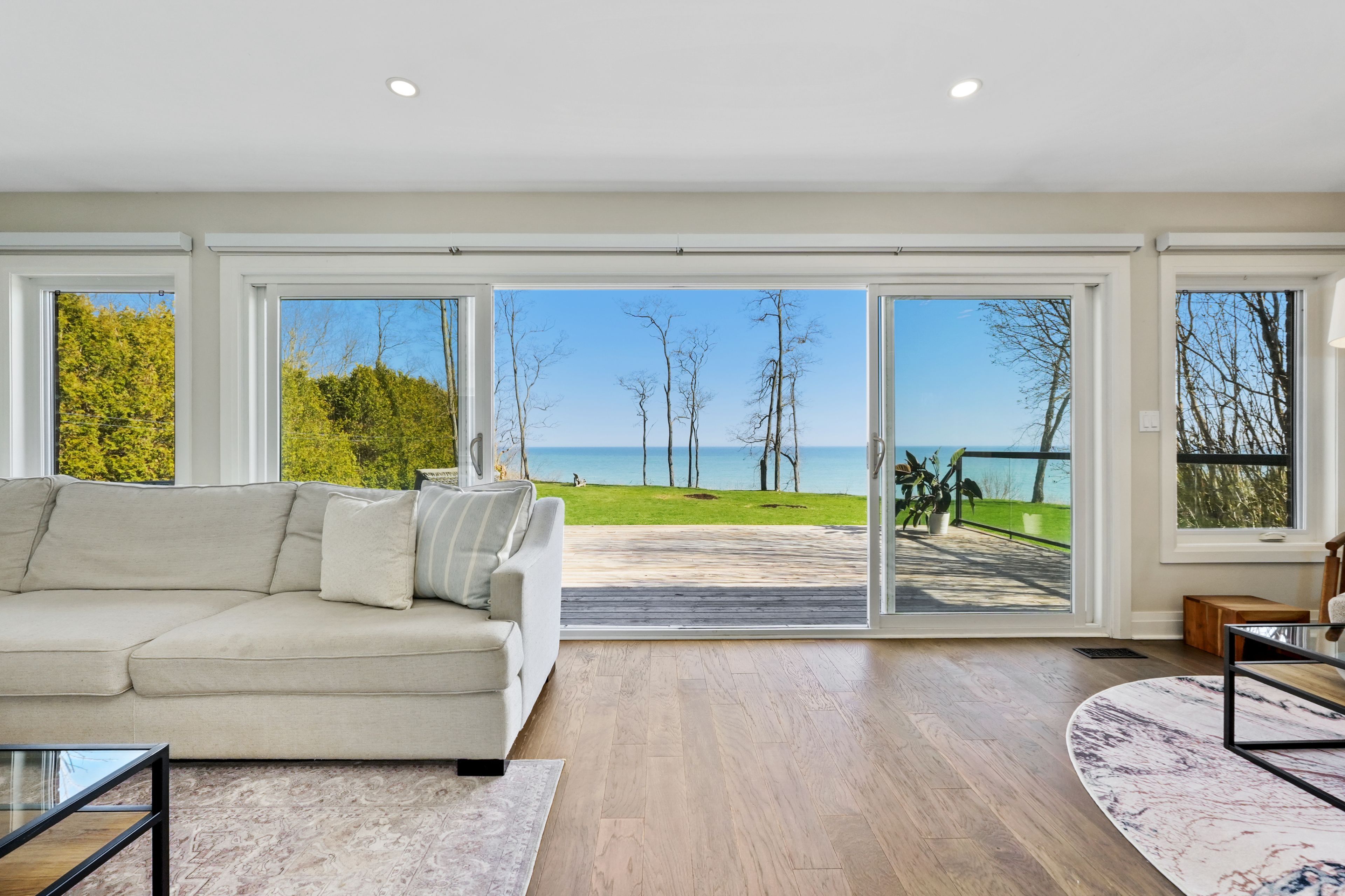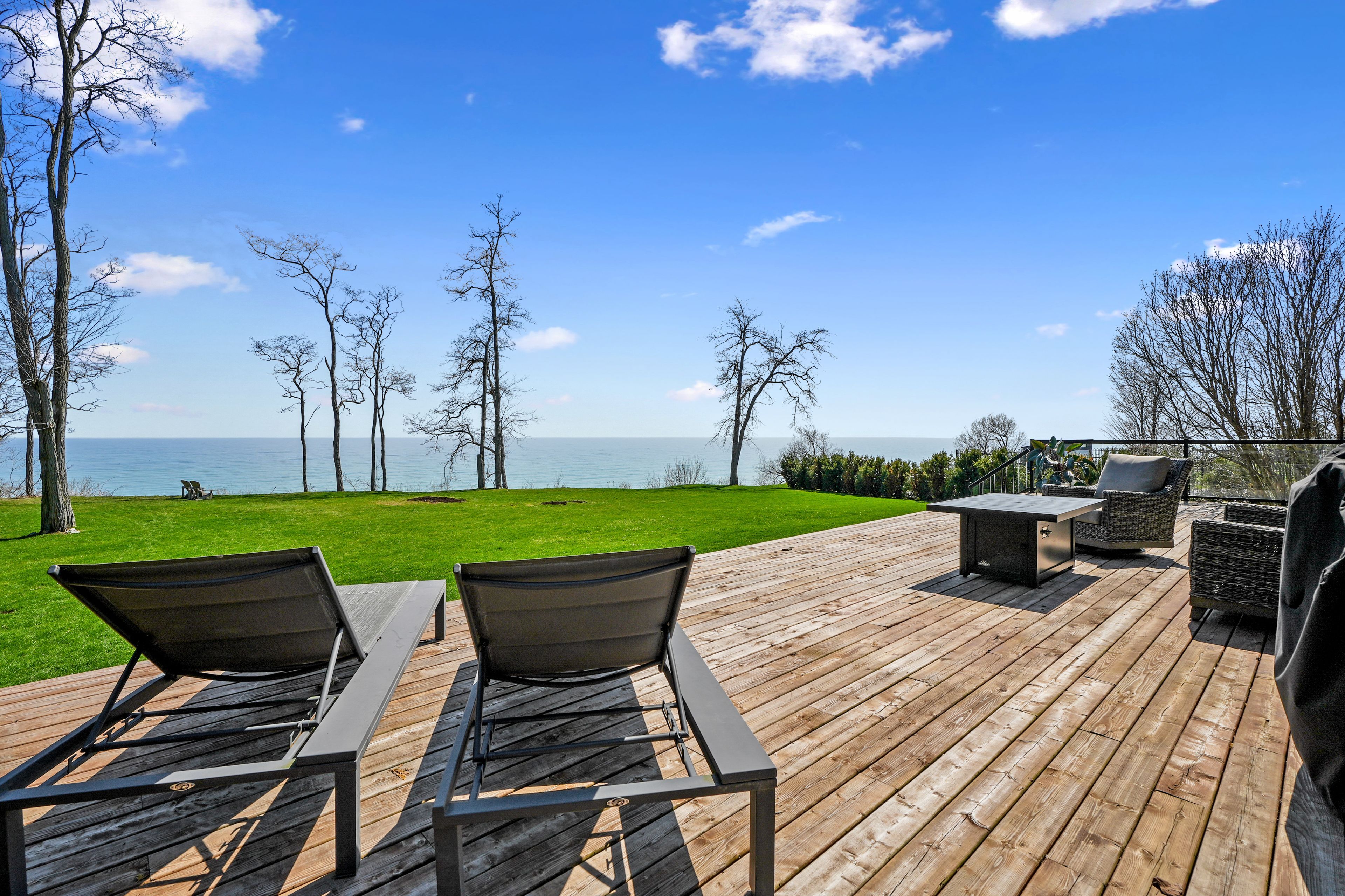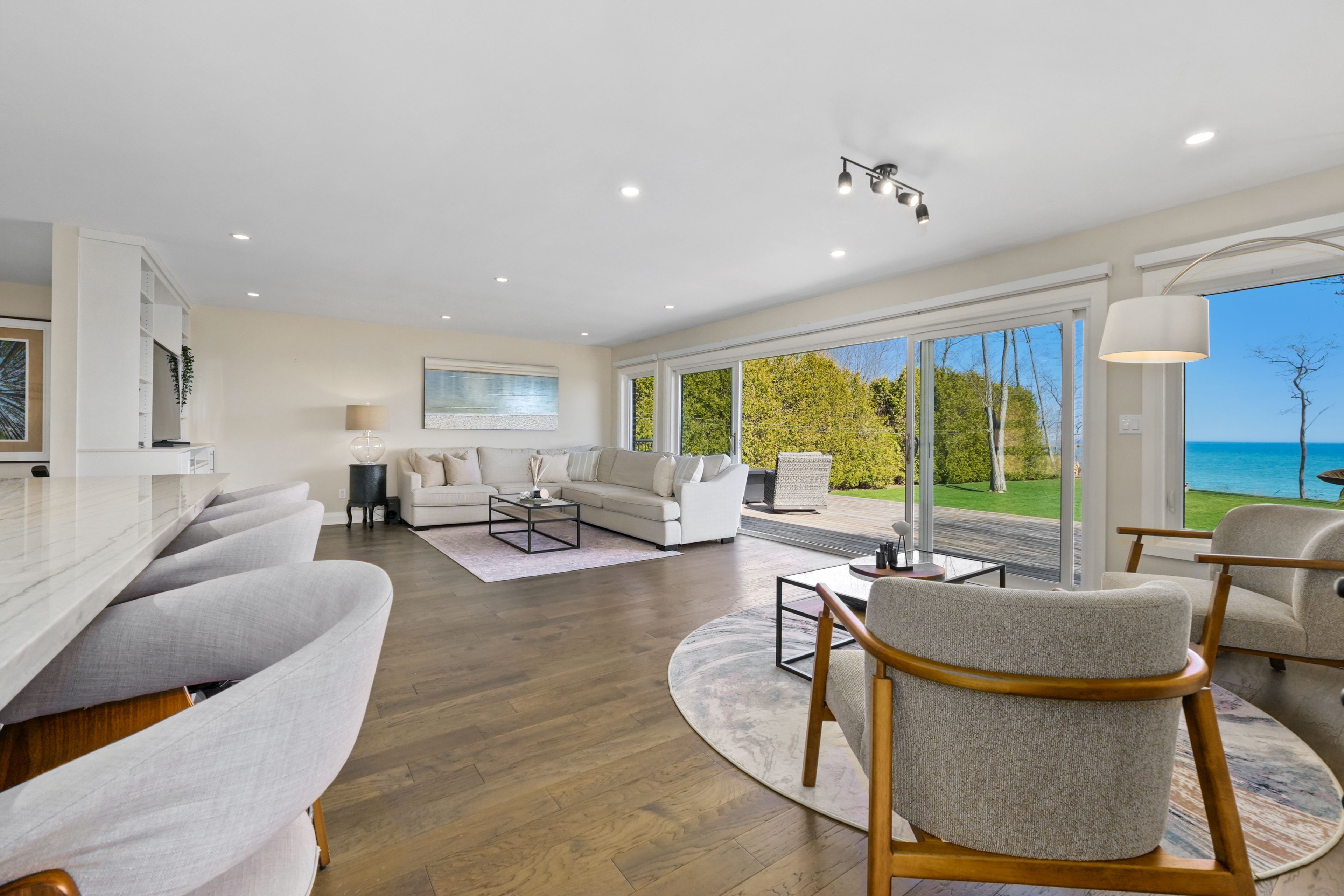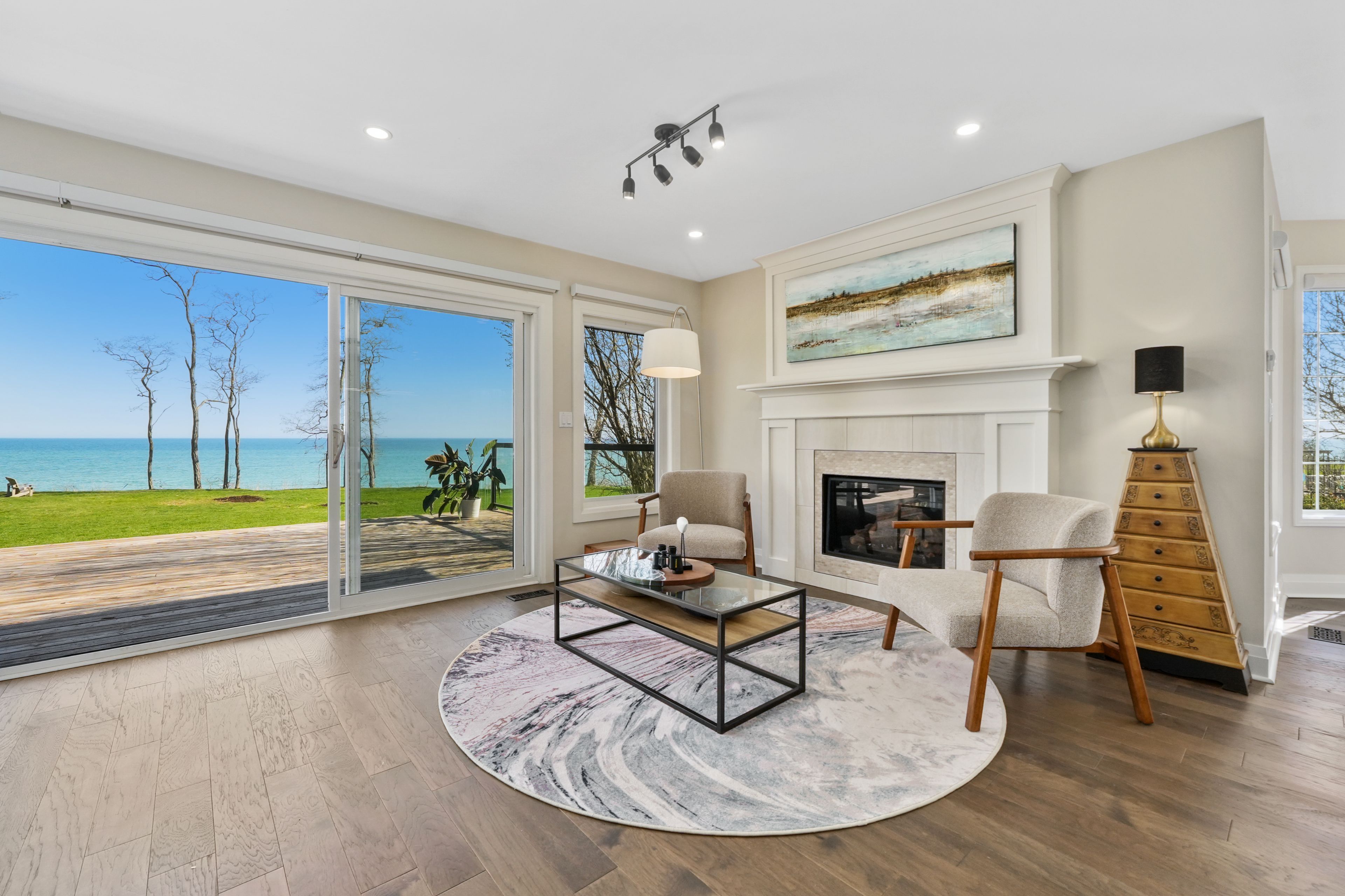 Perched at the absolute eastern edge of Cobourg's waterfront, this home offers a rare duality: the convenience of town living with the profound silence of the open coast. As the final residence on the shoreline, your eastern horizon is defined only by miles of undisturbed nature, offering an elevated level of privacy and an uninterrupted views. Thoughtfully designed with combined living space of 3,287 sq ft, this home blends luxury and lifestyle. Step into the bright, open foyer where breathtaking panoramic water views immediately command attention. The living room is a showpiece, featuring a wall of windows that fully opens to create a seamless indoor-outdoor living experience, complemented by a fireplace, and built-in media unit. The kitchen offers a sleek, modern aesthetic with a 10.5' island, breakfast bar, contemporary pendant lighting, discreet built-in fridge, wall oven, and induction cooktop. The sun-filled dining area is wrapped in windows, creating an inviting space for everyday living. The oversized primary suite is a private retreat with its own walkout, dual closets, and a spa-inspired ensuite featuring a soaker tub overlooking the lake, double vanity, and separate glass shower. An additional bedroom, office with built-ins, a full bathroom, and a functional mudroom with direct access to the attached double garage complete the main level. The lower level is designed for both relaxation and entertainment, offering a spacious rec room with games nook, immersive theatre room, gym, 2 bedrooms, bathroom, and a beautifully finished laundry room. Outdoors, the property truly shines with a 48' x 16' deck capturing expansive water views, a generous private yard with raised garden beds, and inviting green space that enhances the peaceful waterfront setting. Located just minutes from downtown Cobourg, Marina, local markets, and schools, with convenient access to Highway 2 and the 401, this is a rare opportunity to experience luxury waterfront living at its finest.