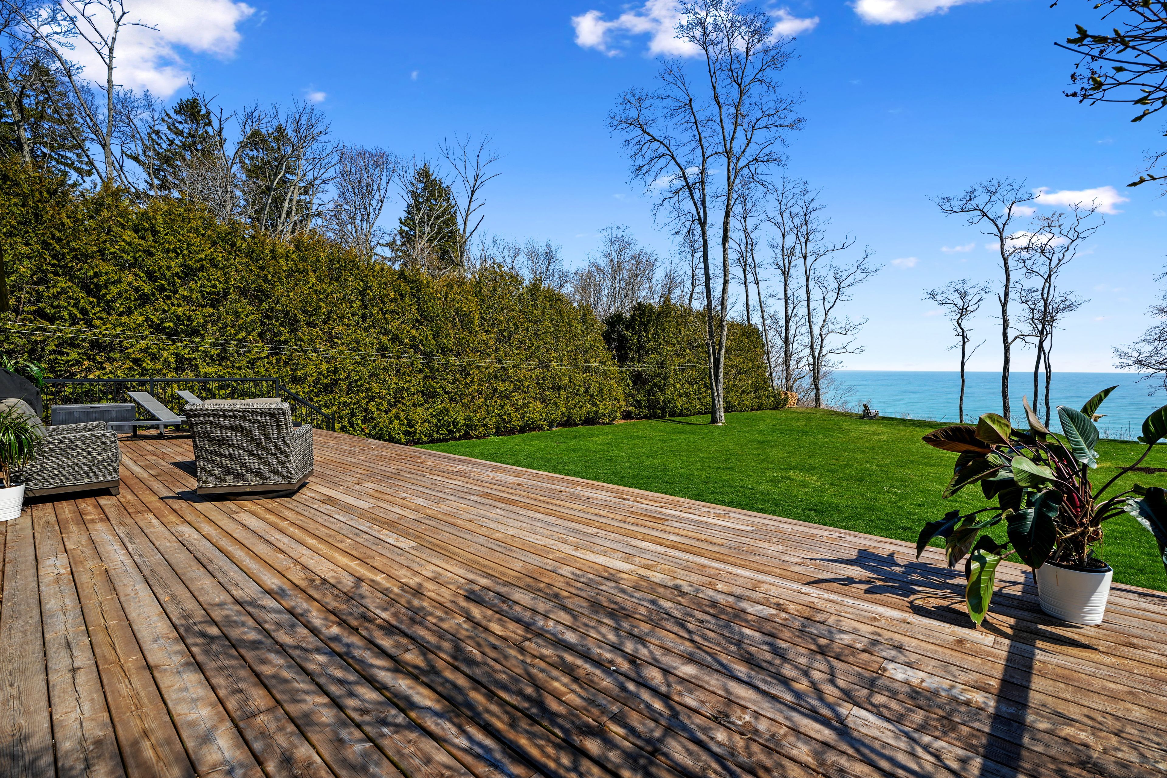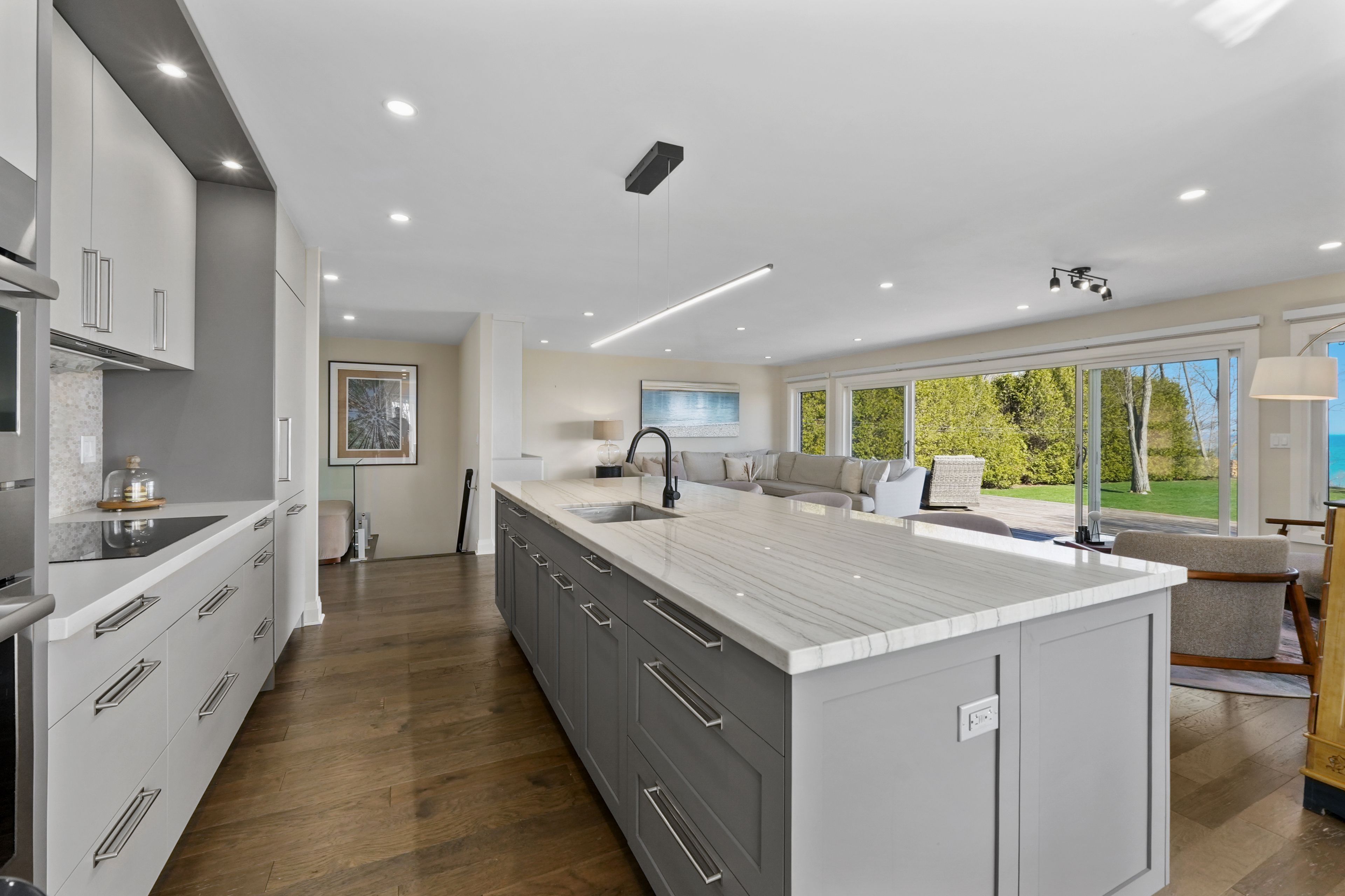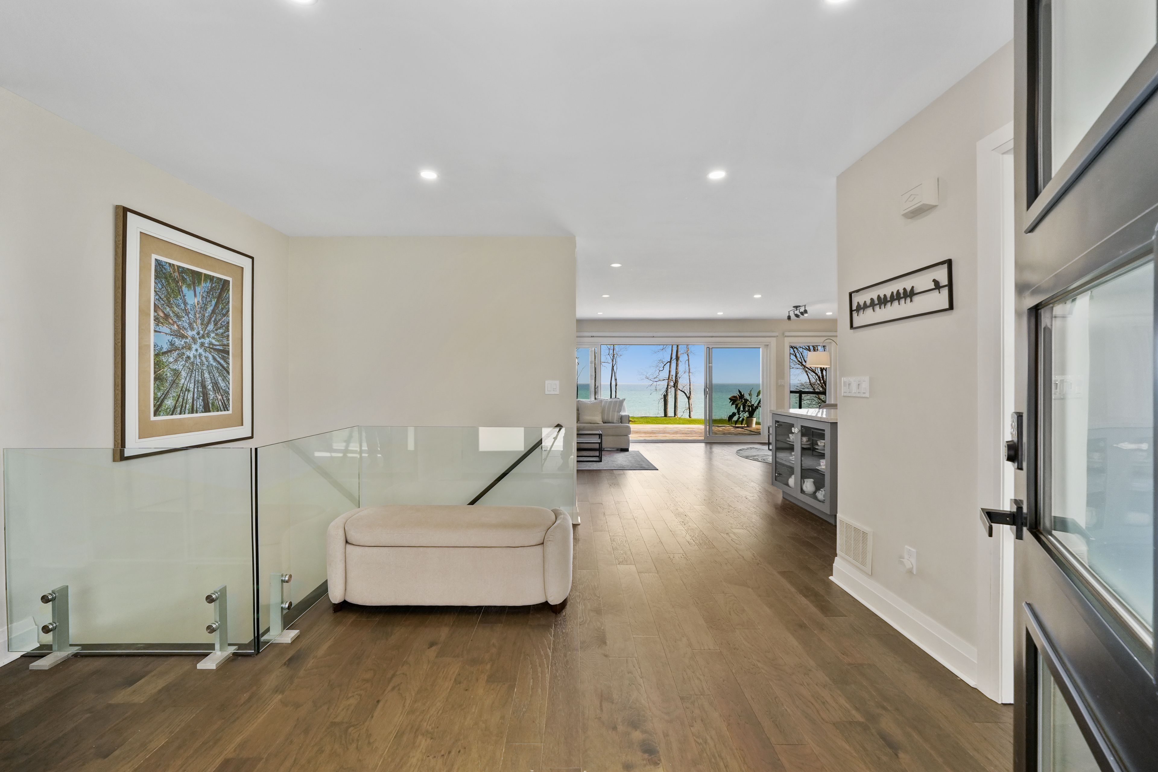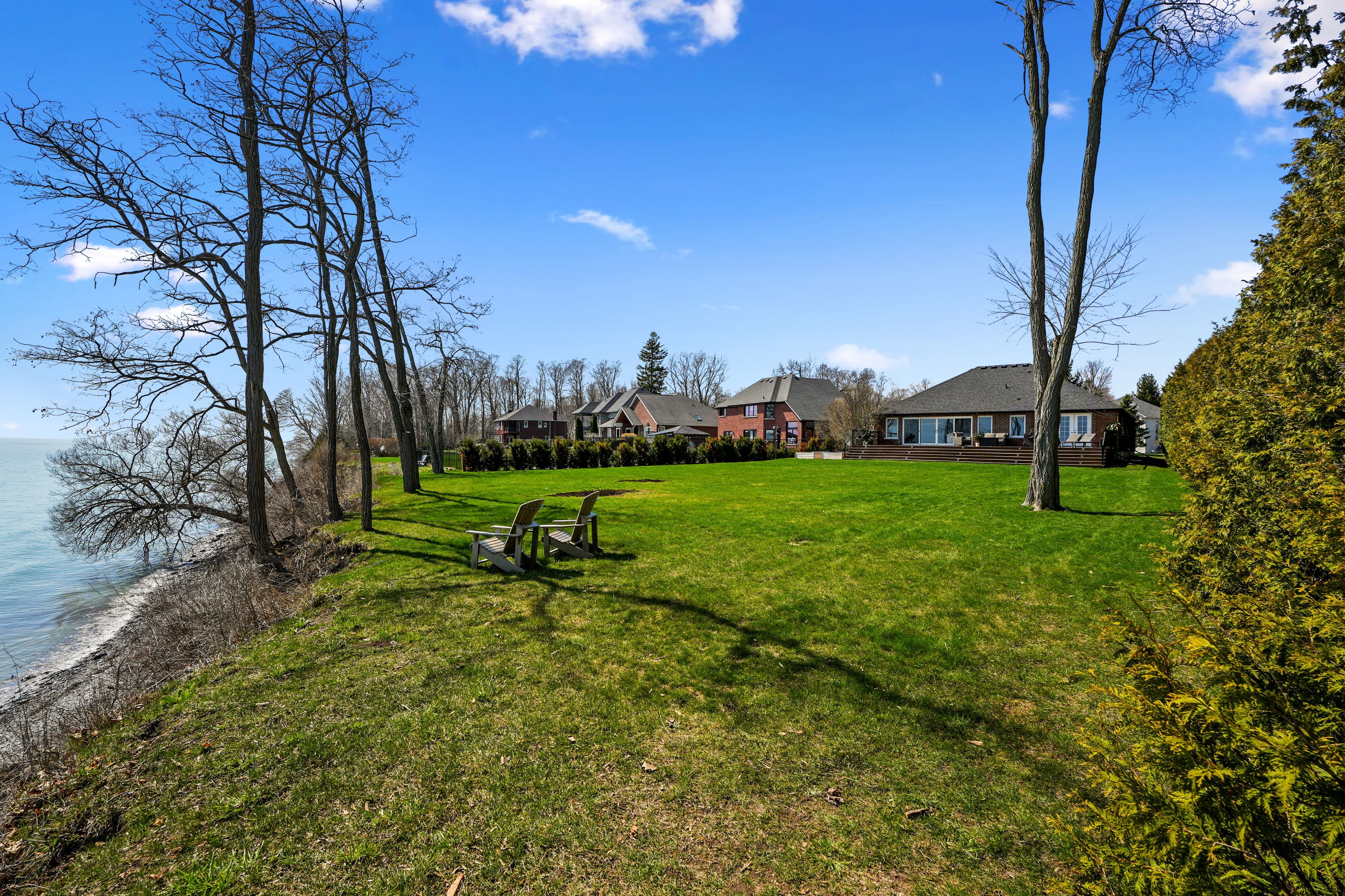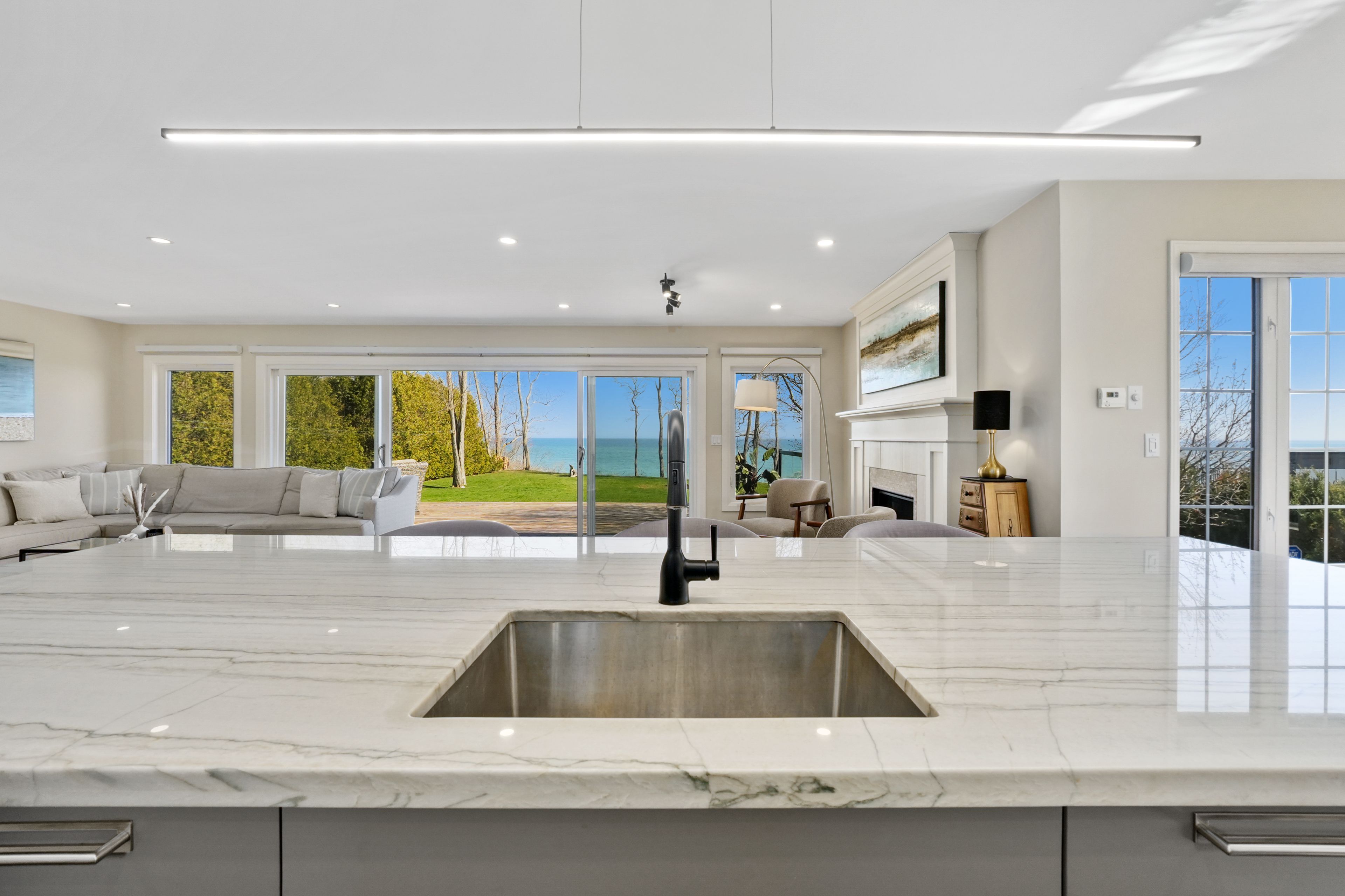 Perched at the absolute eastern edge of Cobourg's waterfront, this home offers a rare duality: the convenience of town living with the profound silence of the open coast. As the final residence on the shoreline, your eastern horizon is defined only by miles of undisturbed nature, offering an elevated level of privacy and an uninterrupted views. Thoughtfully designed with combined living space of 3,287 sq ft, this home blends luxury and lifestyle. Step into the bright, open foyer where breathtaking panoramic water views immediately command attention. The living room is a showpiece, featuring a wall of windows that fully opens to create a seamless indoor-outdoor living experience, complemented by a fireplace, and built-in media unit. The kitchen offers a sleek, modern aesthetic with a 10.5' island, breakfast bar, contemporary pendant lighting, discreet built-in fridge, wall oven, and induction cooktop. The sun-filled dining area is wrapped in windows, creating an inviting space for everyday living. The oversized primary suite is a private retreat with its own walkout, dual closets, and a spa-inspired ensuite featuring a soaker tub overlooking the lake, double vanity, and separate glass shower. An additional bedroom, office with built-ins, a full bathroom, and a functional mudroom with direct access to the attached double garage complete the main level. The lower level is designed for both relaxation and entertainment, offering a spacious rec room with games nook, immersive theatre room, gym, 2 bedrooms, bathroom, and a beautifully finished laundry room. Outdoors, the property truly shines with a 48' x 16' deck capturing expansive water views, a generous private yard with raised garden beds, and inviting green space that enhances the peaceful waterfront setting. Located just minutes from downtown Cobourg, Marina, local markets, and schools, with convenient access to Highway 2 and the 401, this is a rare opportunity to experience luxury waterfront living at its finest.
