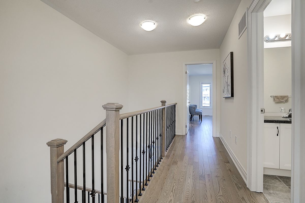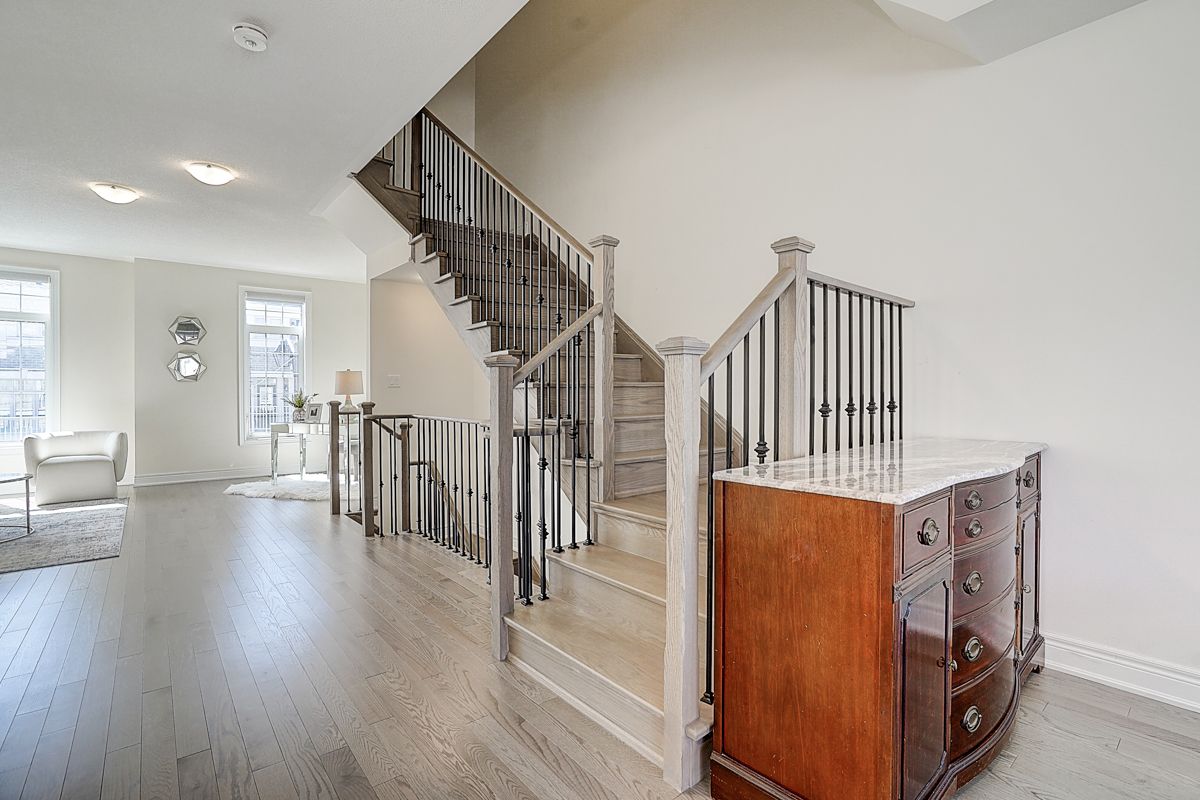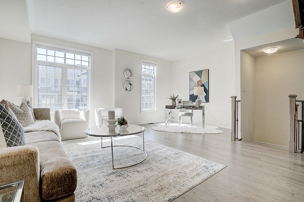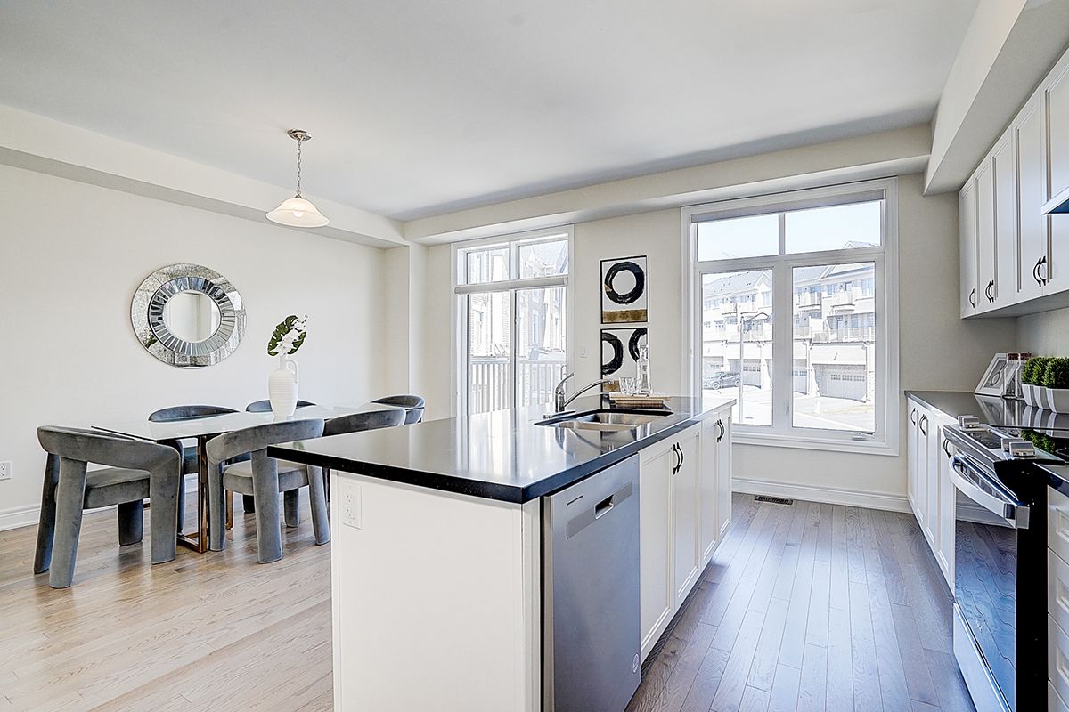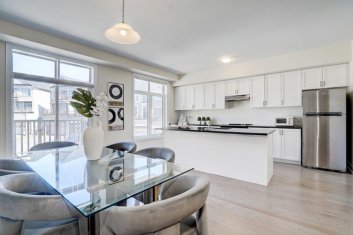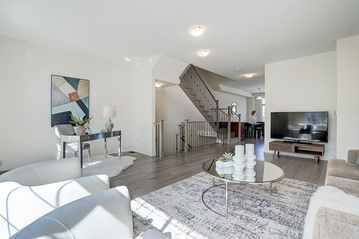 A rare offering of a beautifully upgraded townhouse featuring an impressive 2,400 sq.ft. of functional layout ,Featuring 9-ft ceilings on both the main and second floors, providing a bright and open atmosphere throughout. The main floor includes a bedroom with a full bathroom, ideal for extended family, guests, or a home office setup. Interior highlights include hardwood flooring throughout and a staircase finished with wrought iron pickets. The modern kitchen is equipped with stainless steel appliances, center island, and breakfast area, and opens to a sun-filled family room with large windows, perfect for everyday living and entertaining. The spacious primary bedroom features a 5-piece ensuite and a large walk-in closet. Conveniently located with easy access to Hwy 407 & 401, top-rated schools, parks, golf courses, and a wide range of amenities including major shopping centres, big box retailers, and banks.