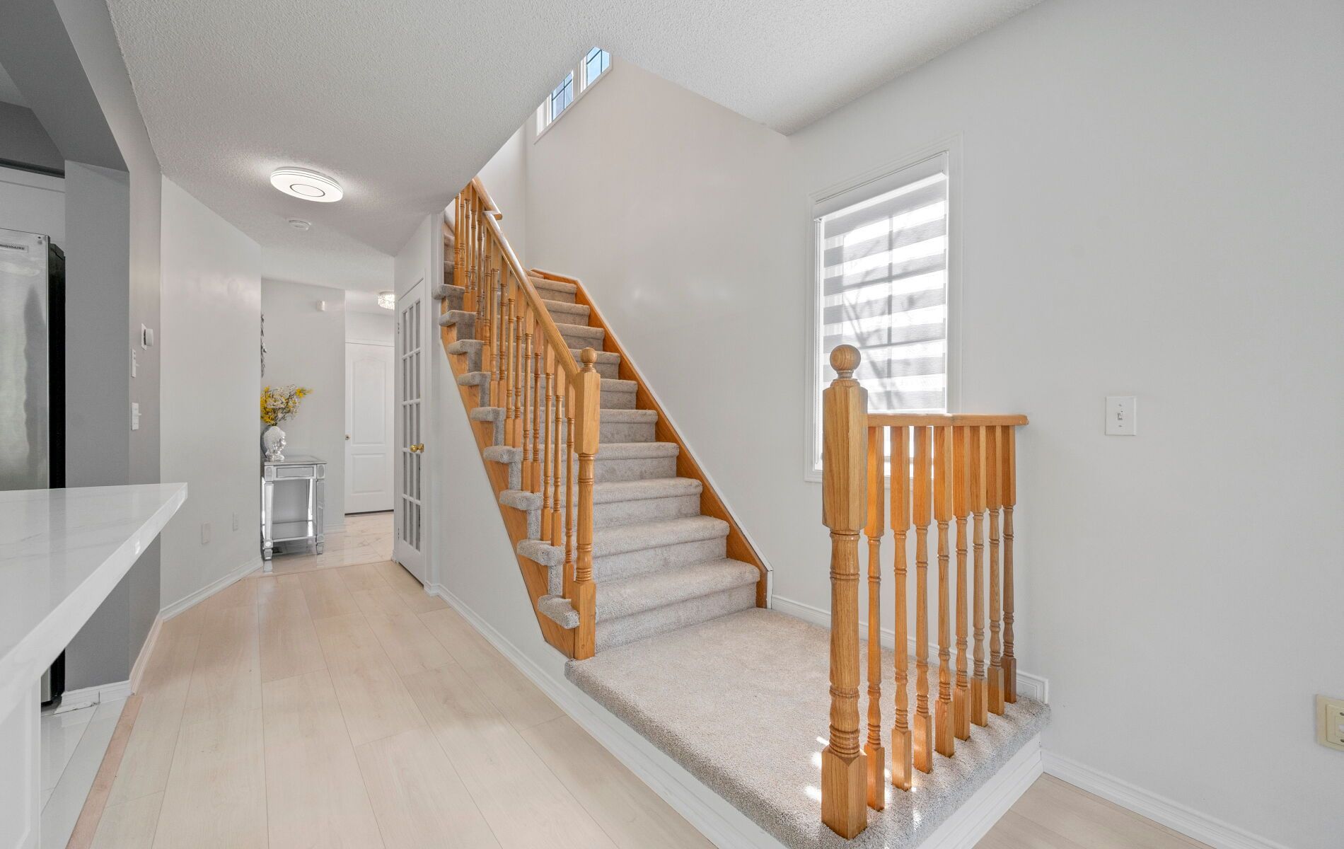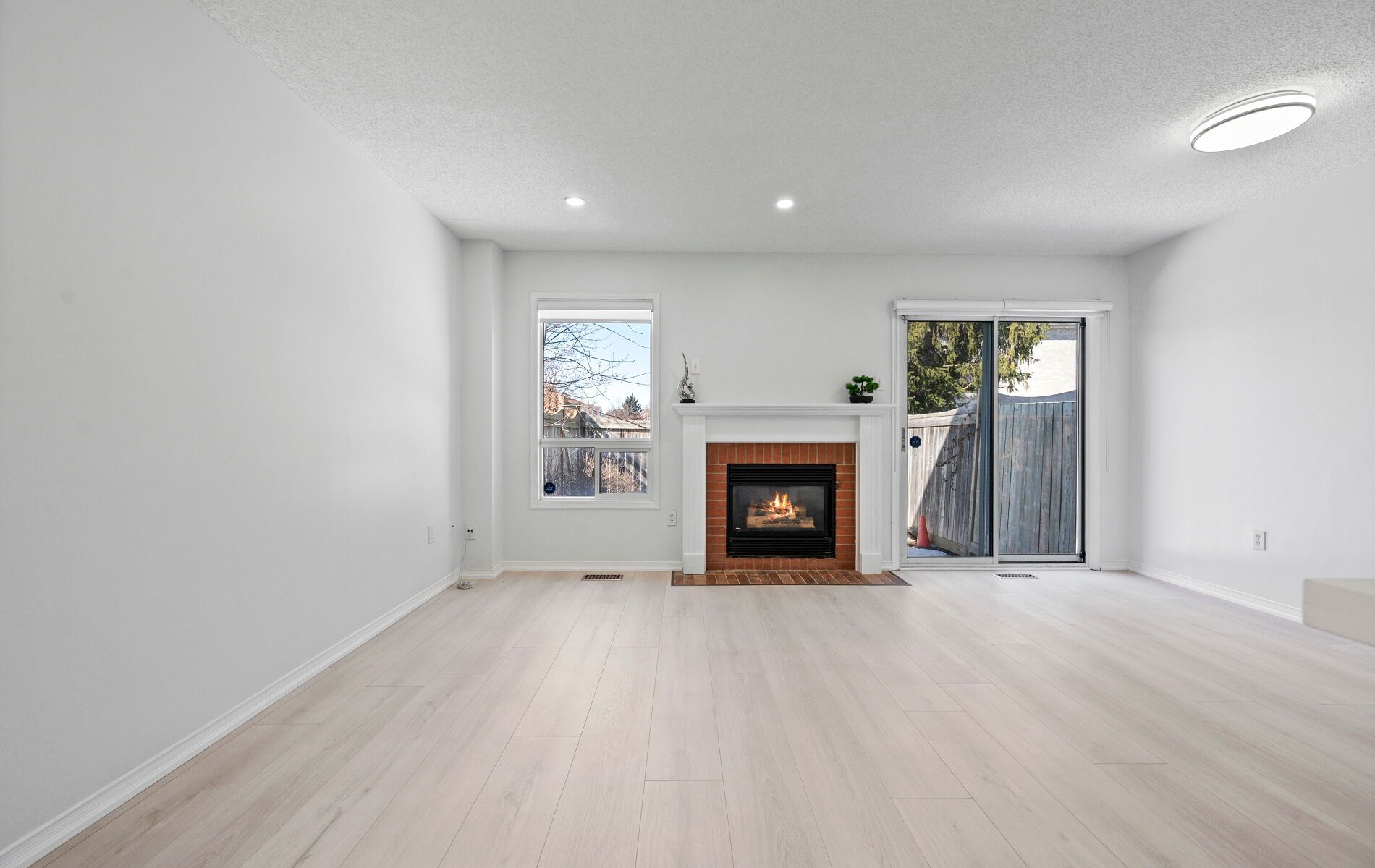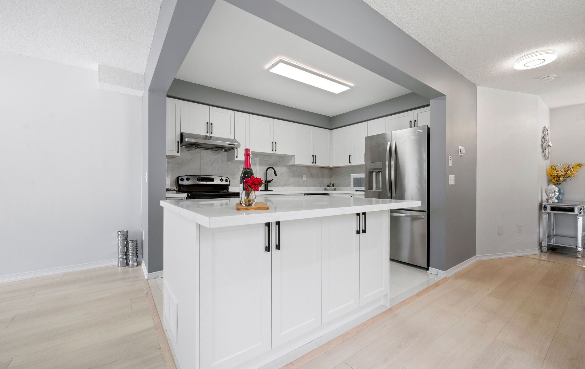 Beautifully renovated and rarely available end-unit townhouse in a highly sought-after community. This sun-filled home has been extensively updated throughout, offering bright, spacious living with modern finishes and exceptional functionality. The open-concept main floor features a cozy gas fireplace and stylish new laminate flooring in the living and dining areas, complemented by new foyer tiles, upgraded LED lighting, elegant zebra blinds, and fresh neutral paint. The upgraded kitchen is designed for both style and practicality, showcasing new quartz countertops, an extended breakfast bar, new lower cabinetry with generous storage including a pull-out spice rack, and an updated double-door refrigerator. Upstairs, the primary bedroom offers a fully renovated ensuite with a modern standing shower and his-and hers closets. A large second-floor loft provides a flexible space ideal for a home office, study, or play area, while two additional bedrooms and a renovated full bathroom complete the upper level, along with new carpeting on the staircase. The finished basement adds versatile living space for a media room, gym, or guest suite. All three washrooms have been fully renovated with contemporary standing showers, new vanities, and updated flooring, along with an updated powder room, making this home truly move-in ready. Ideally located in a family friendly complex with school bus pickup, within walking distance to public transit, groceries, and everyday amenities, and offering easy access to Highway 403 for effortless commuting. This turnkey end-unit townhouse combines modern upgrades, generous space, and a prime location-an outstanding opportunity for today's buyers.